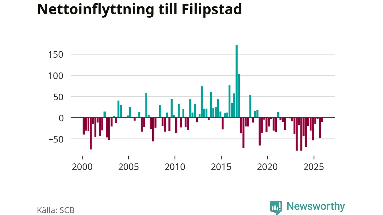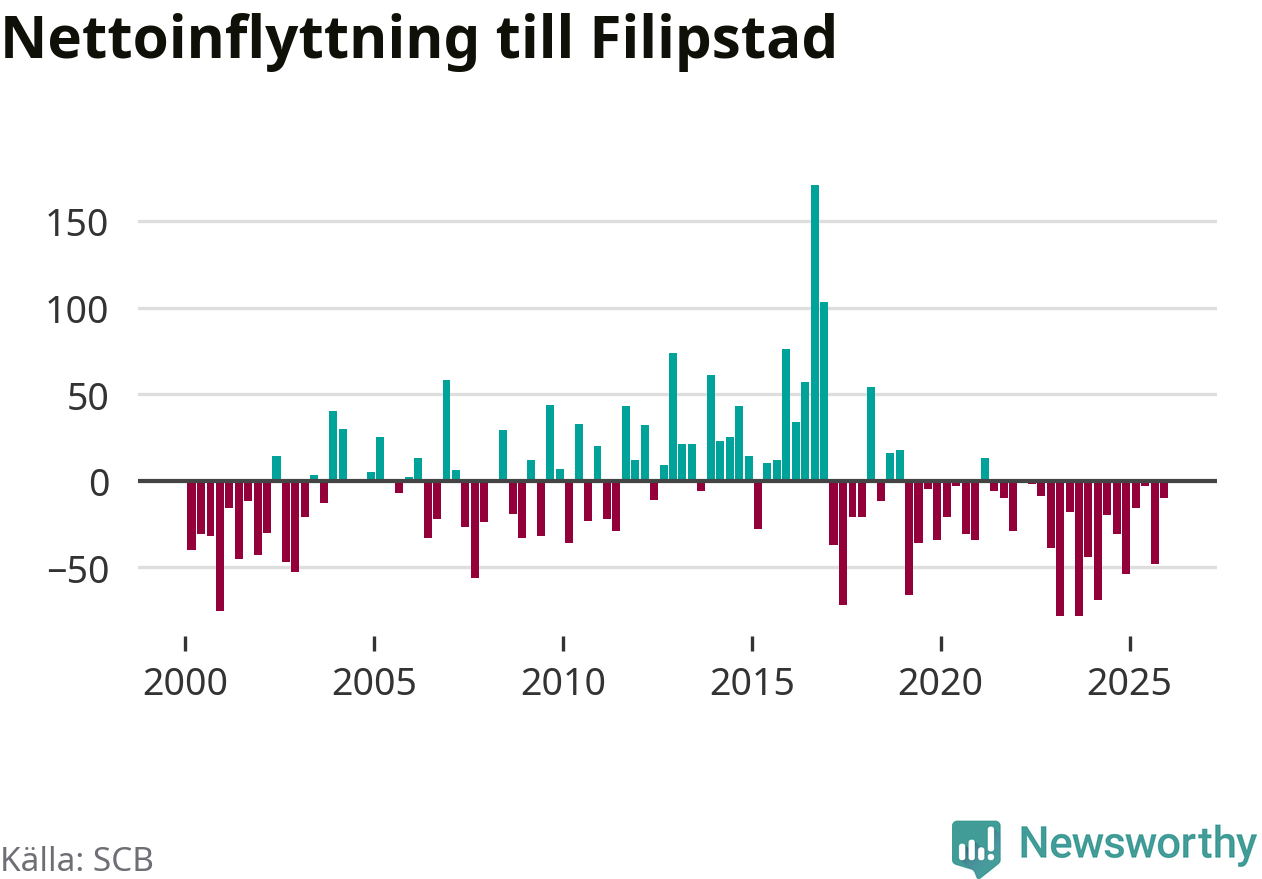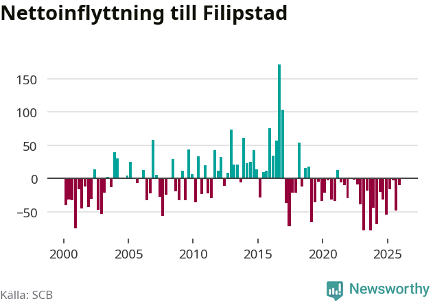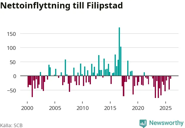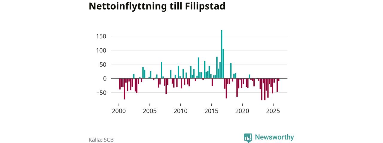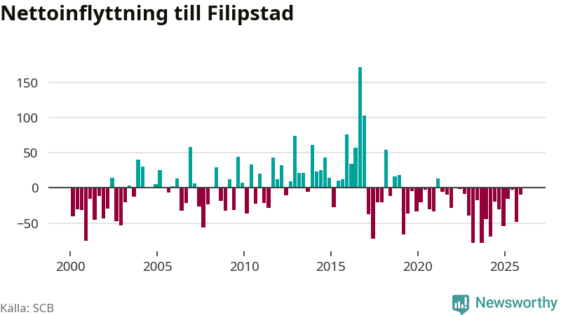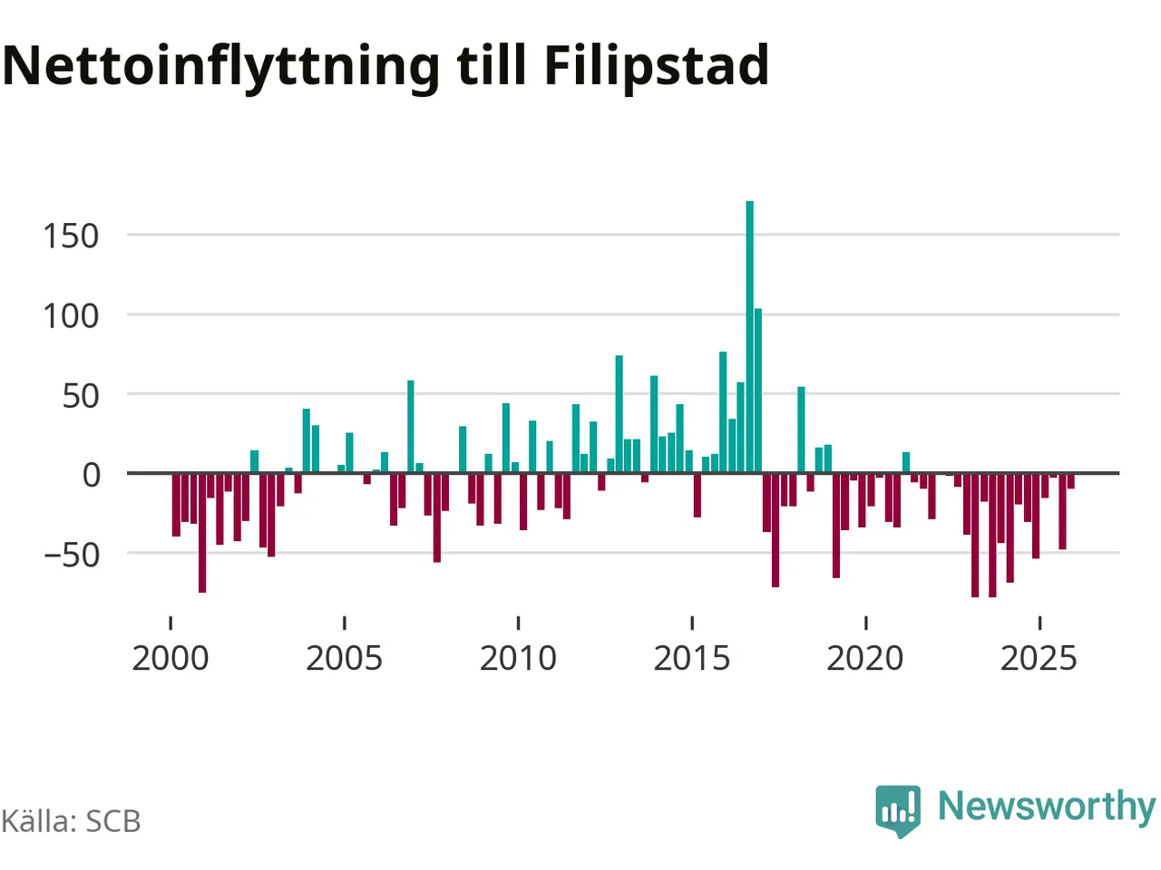 Under fjärde kvartalet 2025 flyttade 100 personer till kommunen medan 110 personer flyttade därifrån. Sedan seklets början har Filipstad oftast haft ett negativt flyttnetto.