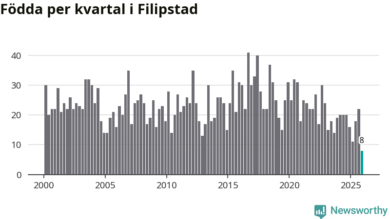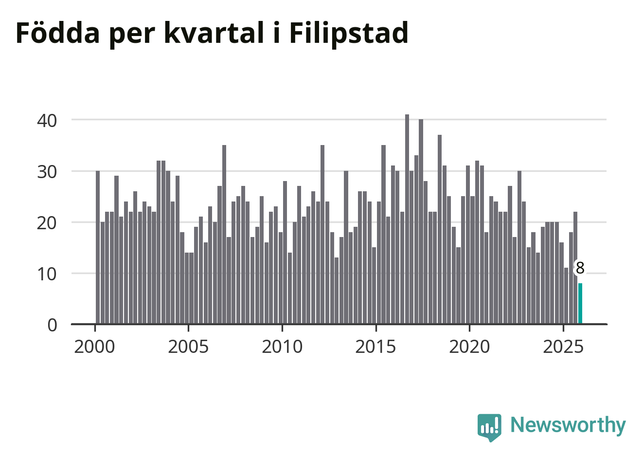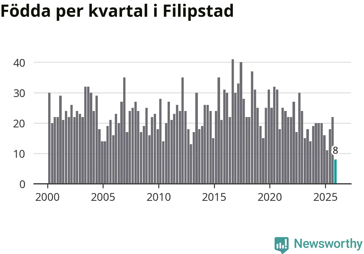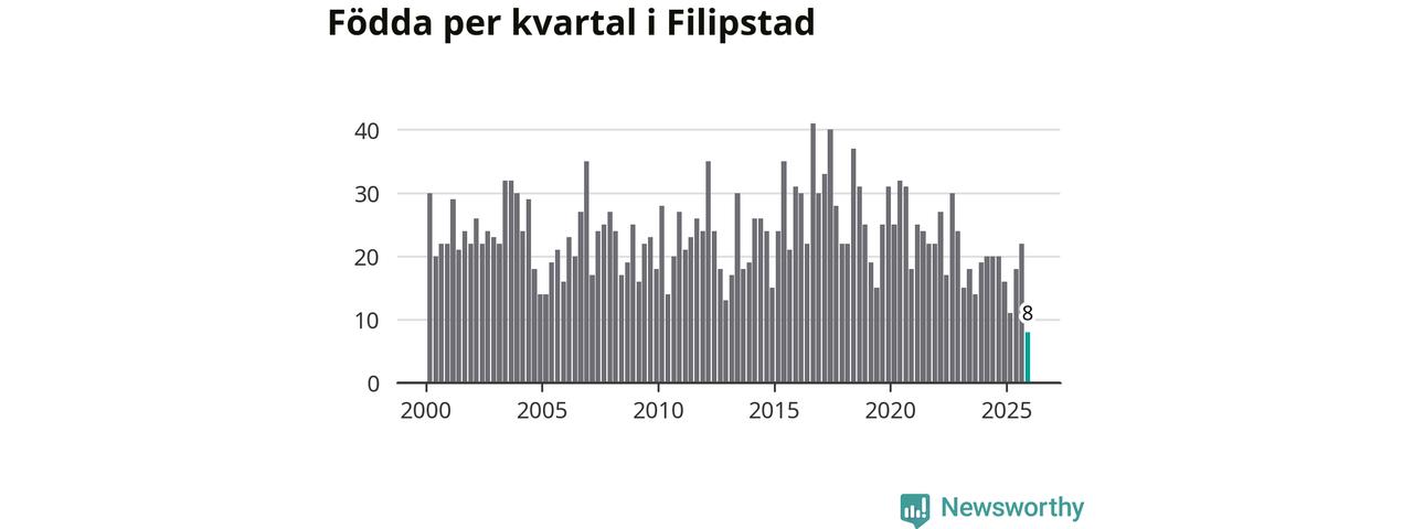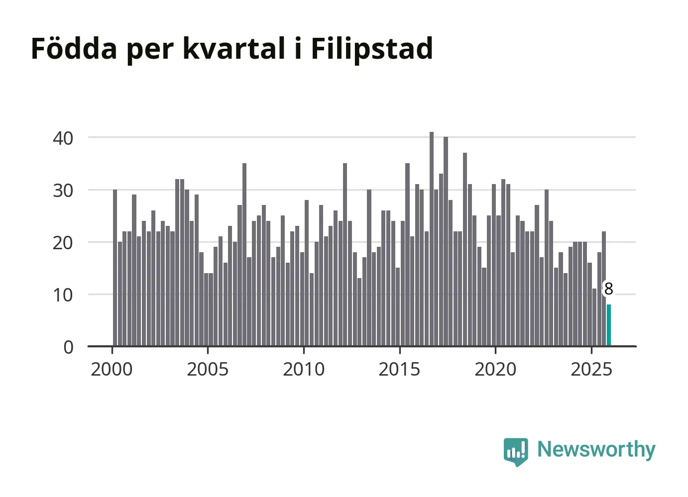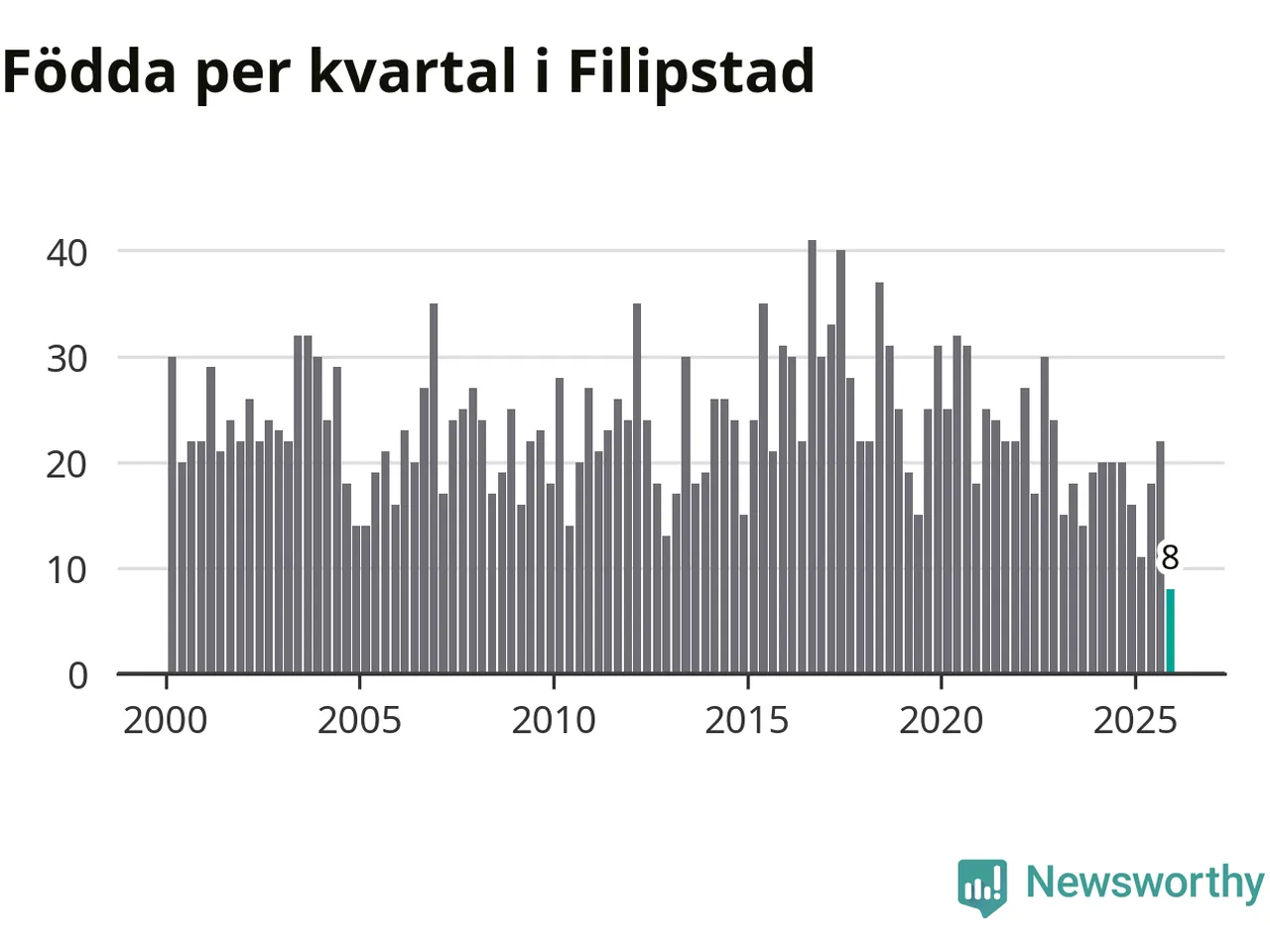 Enligt SCB:s siffror föddes åtta barn i Filipstad under det senaste kvartalet. Det är det lägsta födelsetal som registrerats i kommunen under 2000-talet. Det finns en osäkerhet här, eftersom SCB lägger på ett slumpmässigt brus på alla siffror. Samtidigt avled 38 personer. Filipstad hade alltså ett negativt födelsenetto, vilket kommunen historiskt sett nästan alltid har haft.