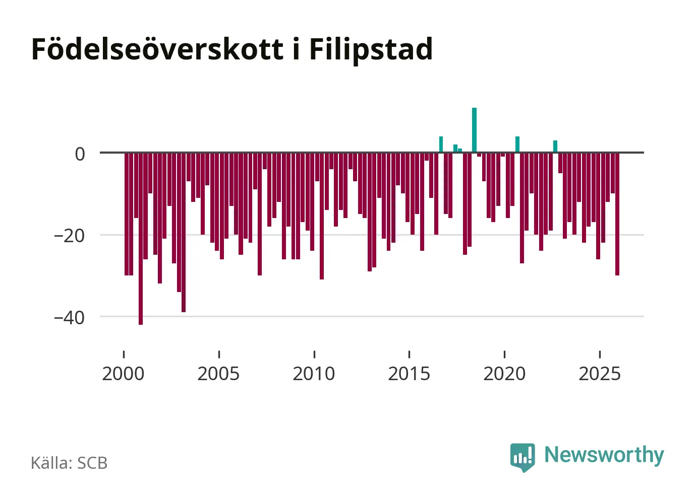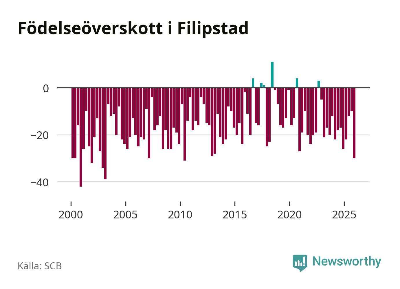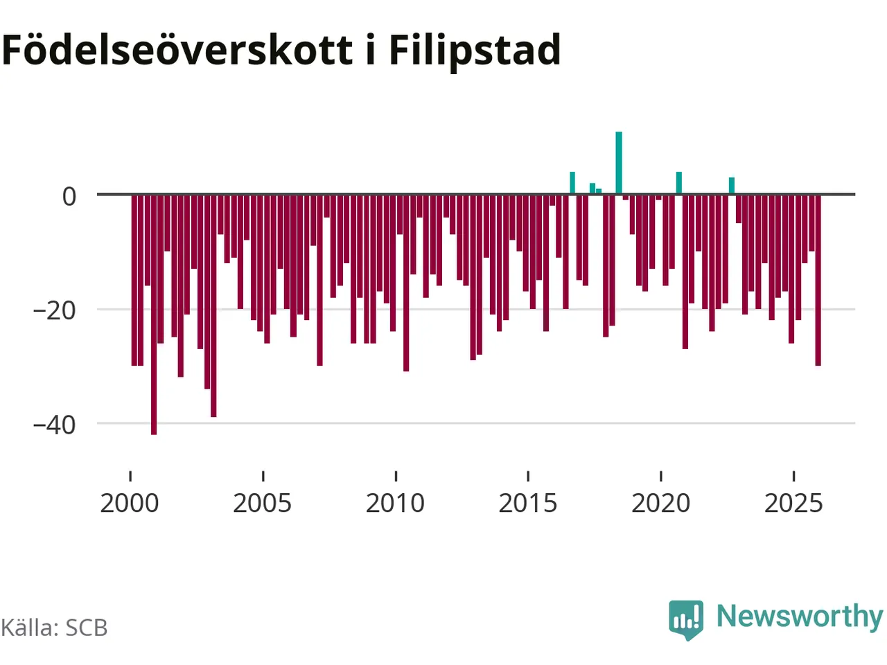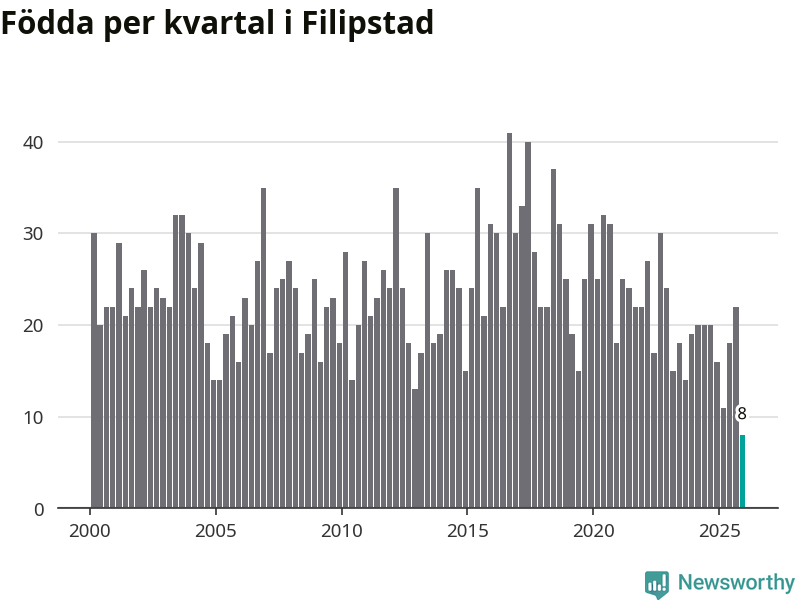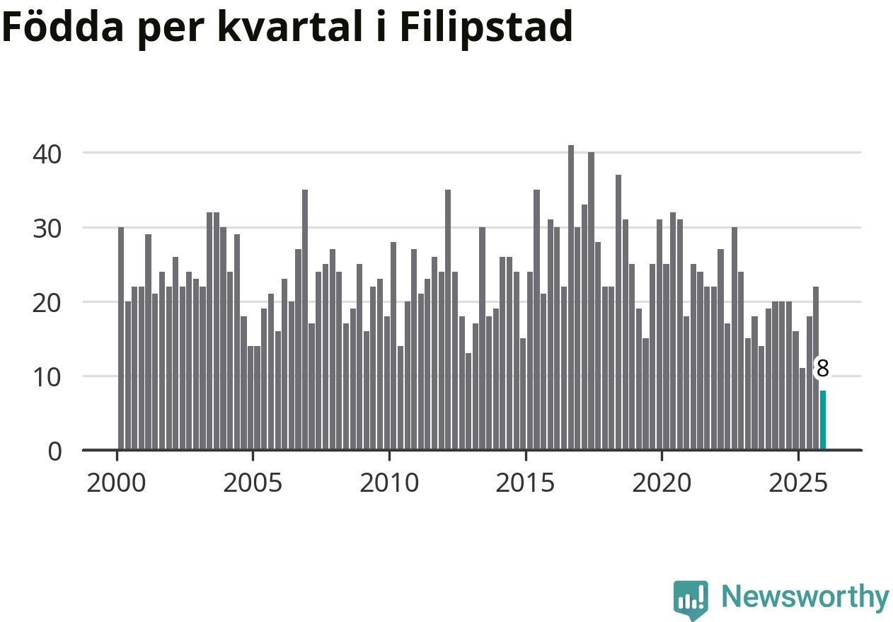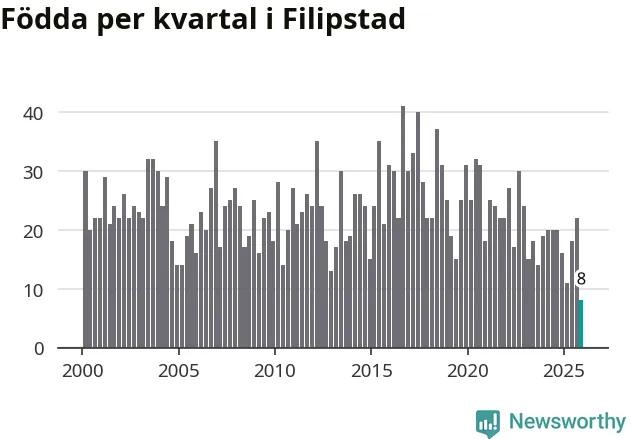 Enligt SCB:s siffror föddes åtta barn i Filipstad under det senaste kvartalet. Det är det lägsta födelsetal som registrerats i kommunen under 2000-talet. Det finns en osäkerhet här, eftersom SCB lägger på ett slumpmässigt brus på alla siffror. Samtidigt avled 38 personer. Filipstad hade alltså ett negativt födelsenetto, vilket kommunen historiskt sett nästan alltid har haft.