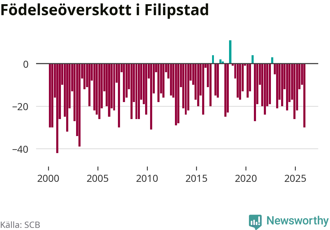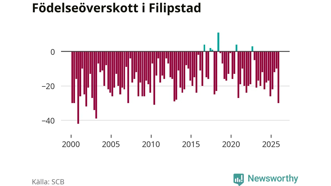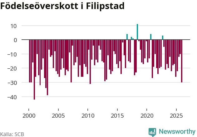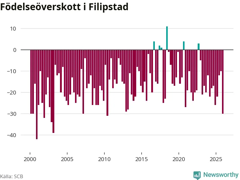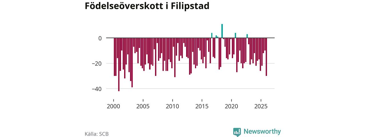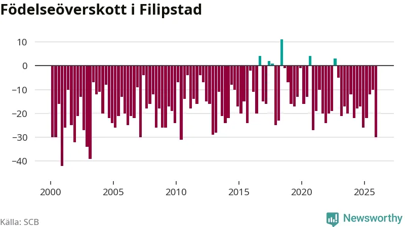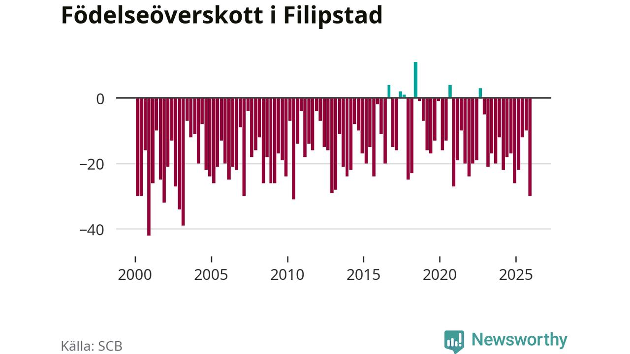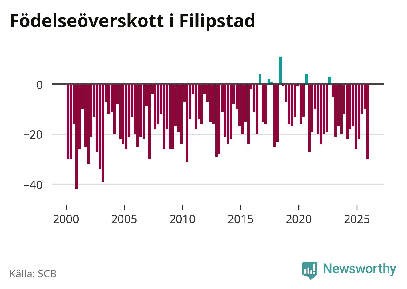 Enligt SCB:s siffror föddes åtta barn i Filipstad under det senaste kvartalet. Det är det lägsta födelsetal som registrerats i kommunen under 2000-talet. Det finns en osäkerhet här, eftersom SCB lägger på ett slumpmässigt brus på alla siffror. Samtidigt avled 38 personer. Filipstad hade alltså ett negativt födelsenetto, vilket kommunen historiskt sett nästan alltid har haft.