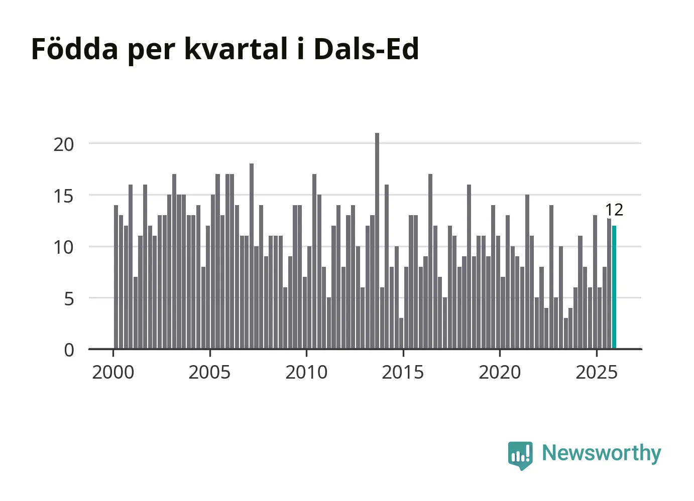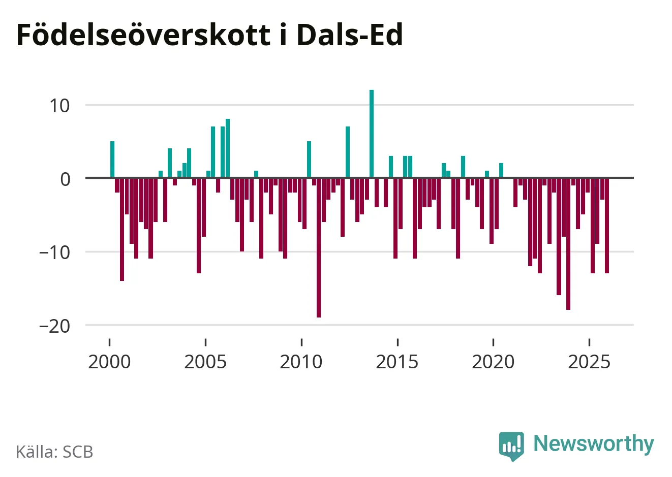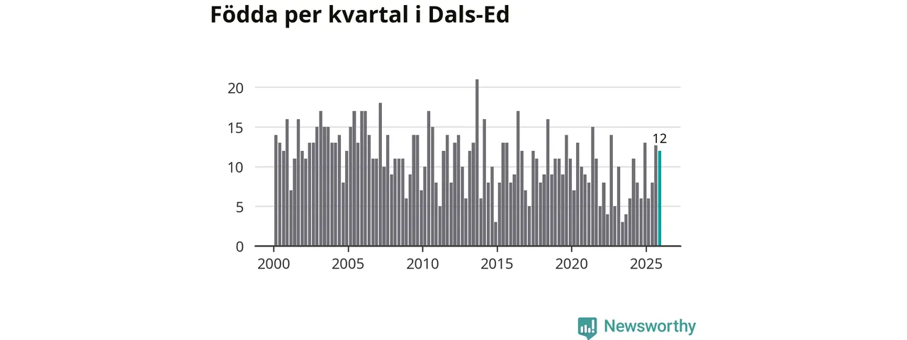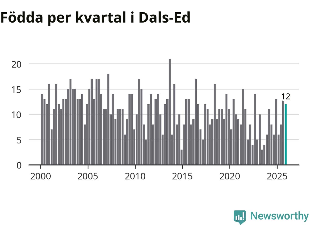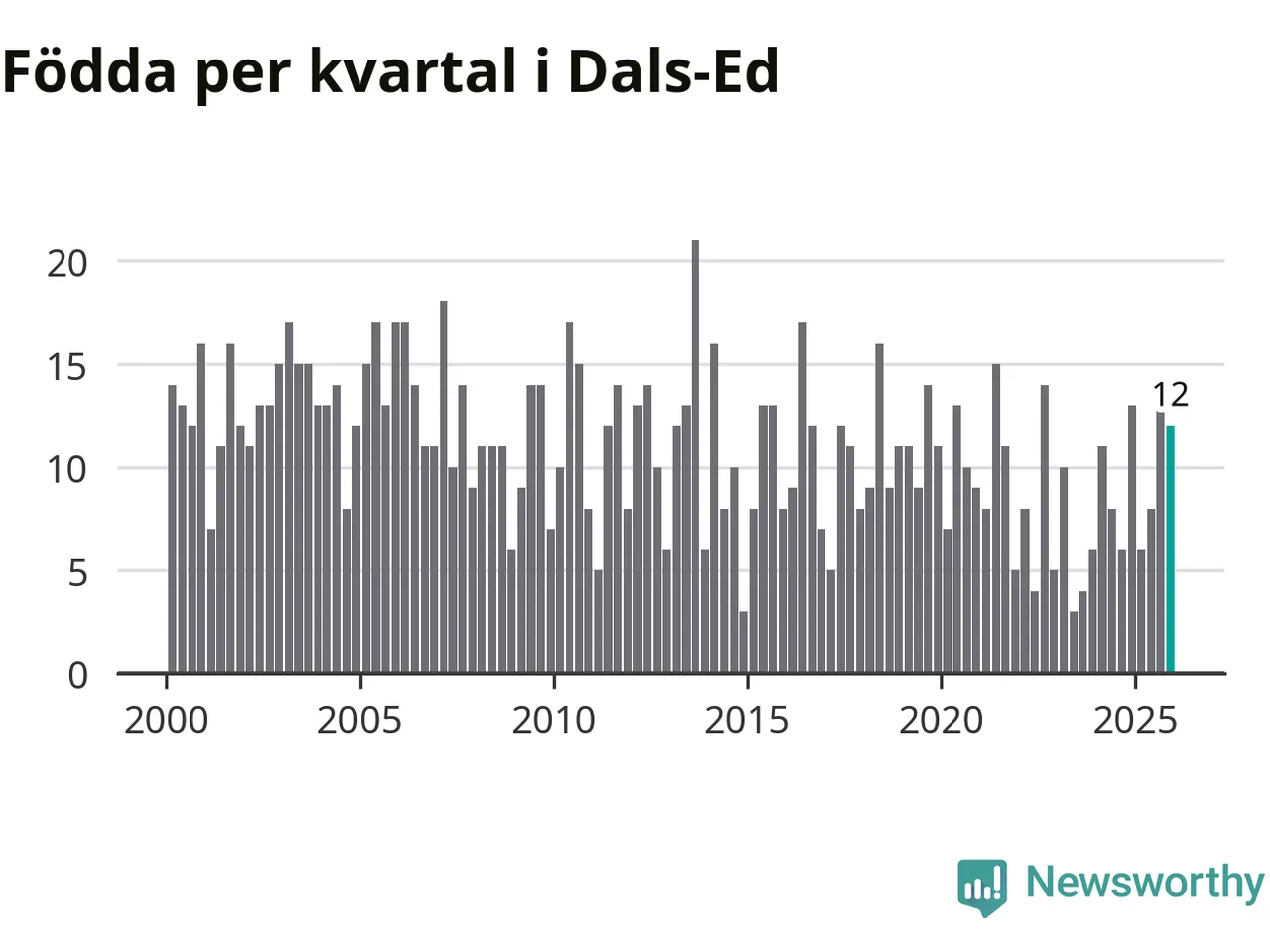Enligt SCB:s siffror föddes tolv barn i Dals-Ed under det senaste kvartalet. Samtidigt avled relativt många – 25 personer. Dals-Ed hade alltså ett negativt födelsenetto, vilket kommunen historiskt sett nästan alltid har haft.