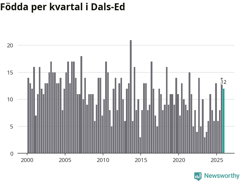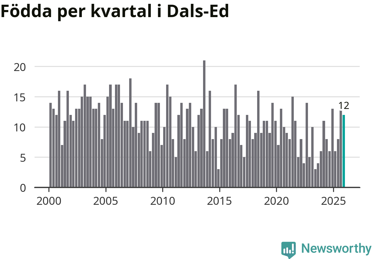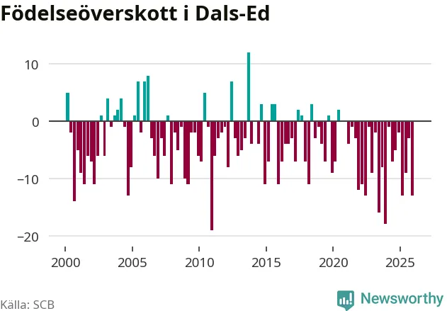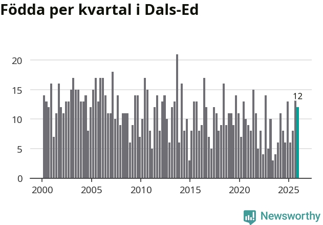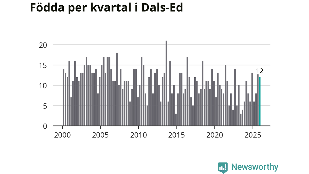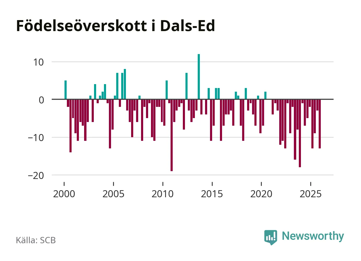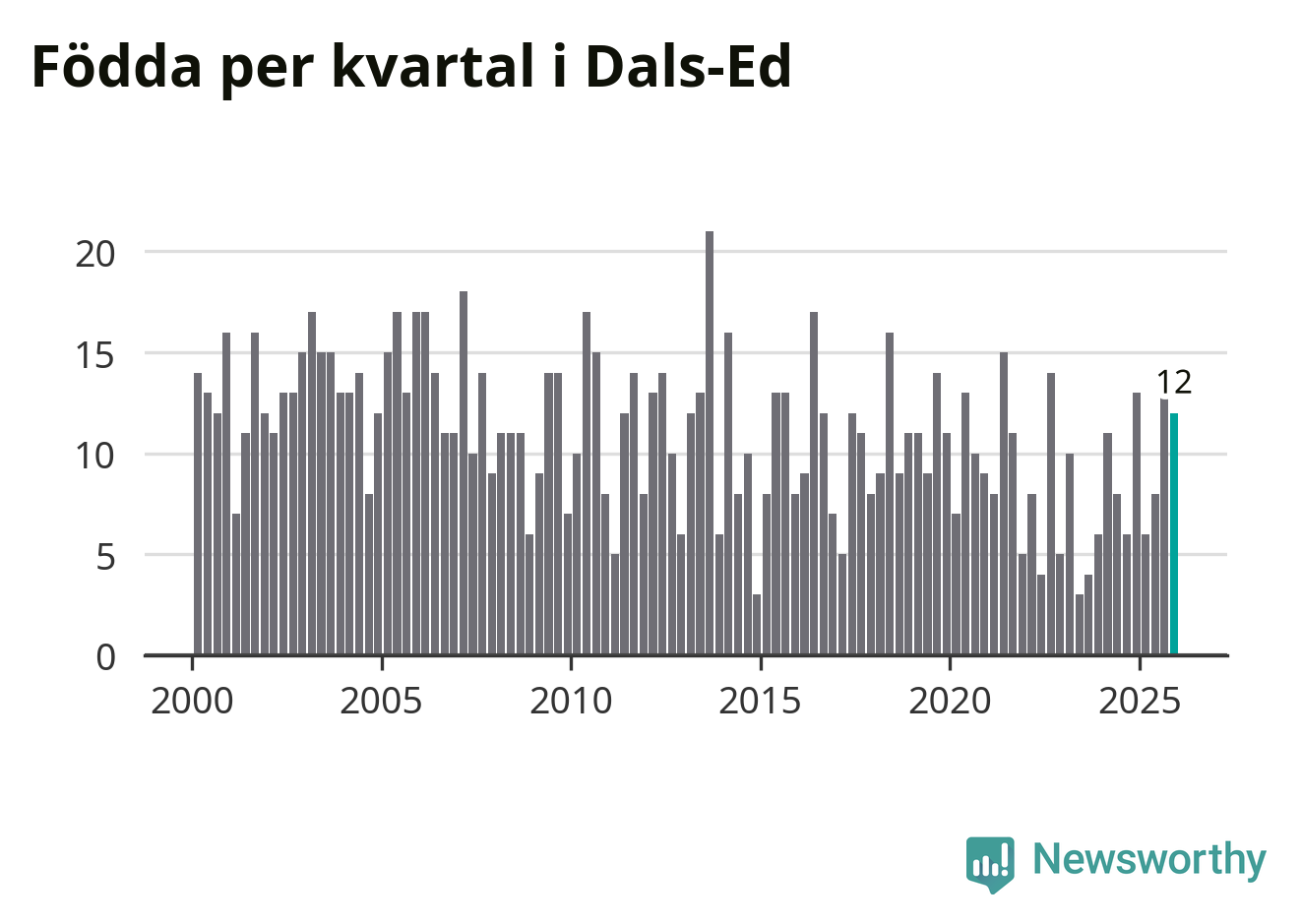 Enligt SCB:s siffror föddes tolv barn i Dals-Ed under det senaste kvartalet. Samtidigt avled relativt många – 25 personer. Dals-Ed hade alltså ett negativt födelsenetto, vilket kommunen historiskt sett nästan alltid har haft.