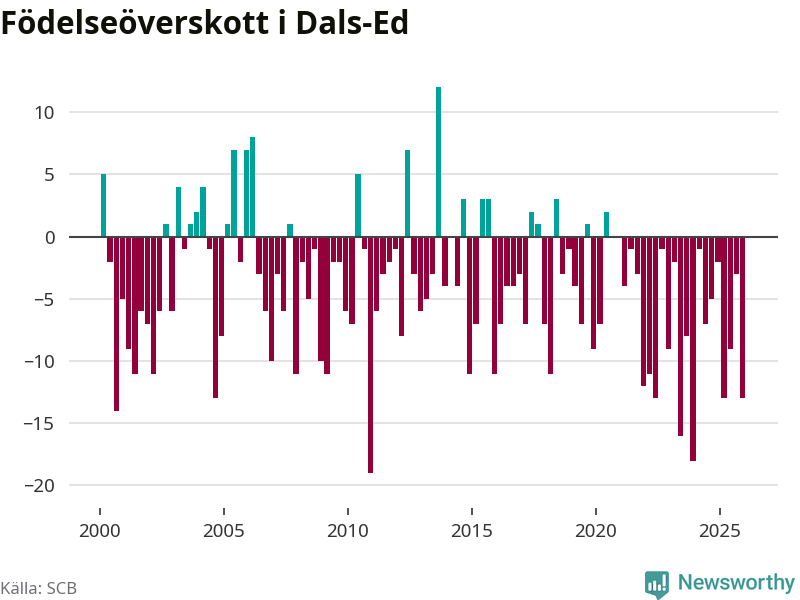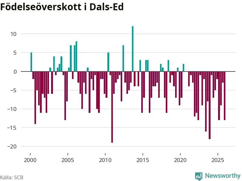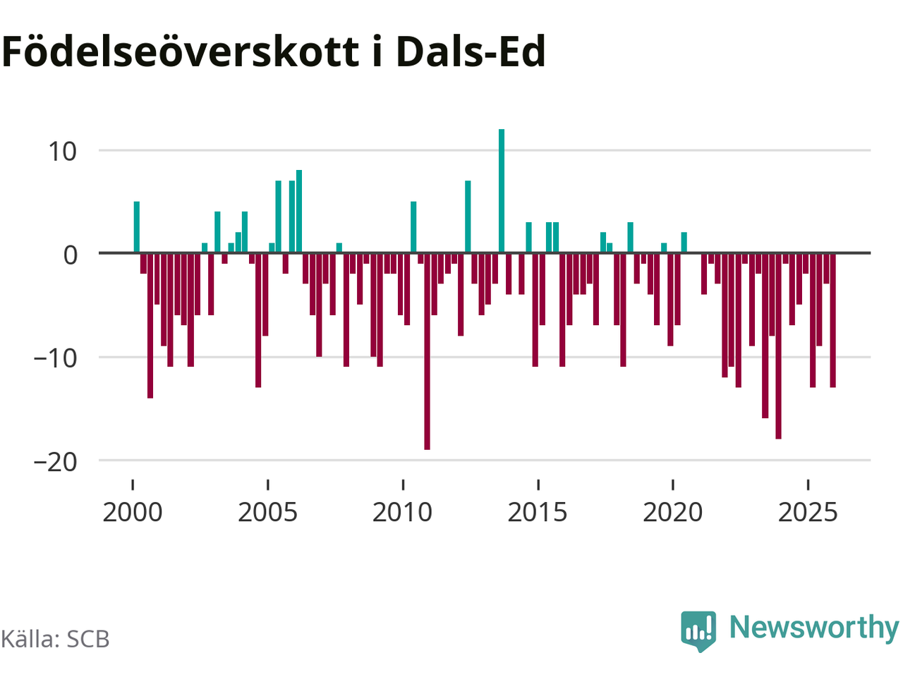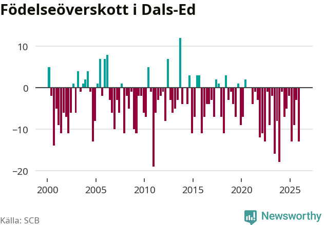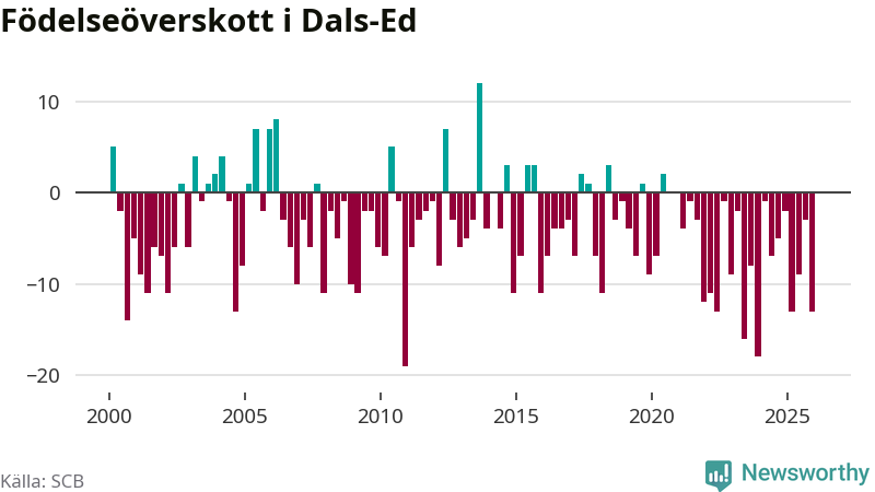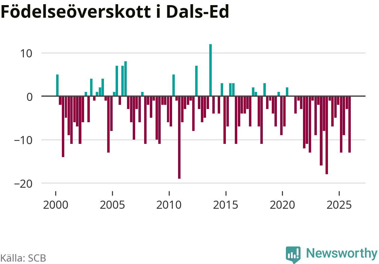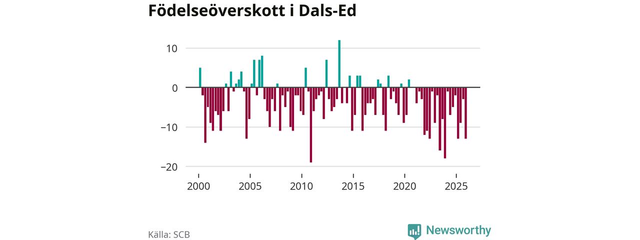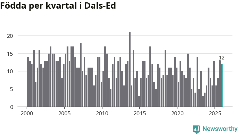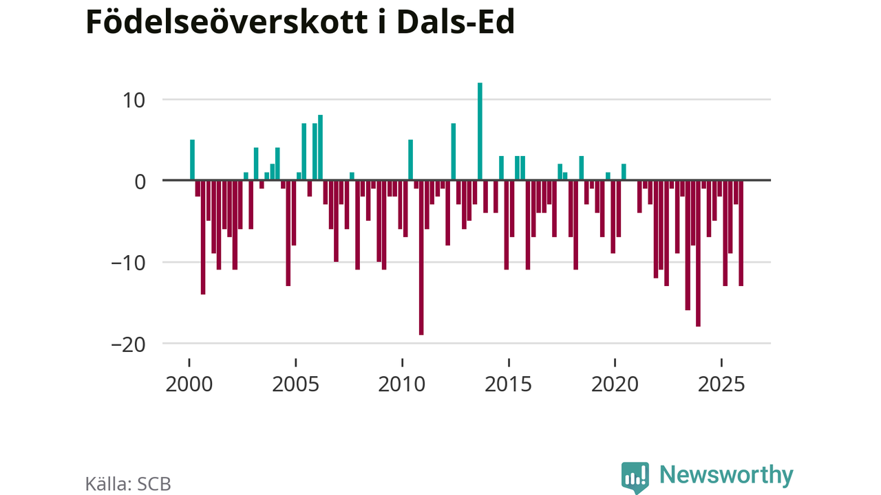 Enligt SCB:s siffror föddes tolv barn i Dals-Ed under det senaste kvartalet. Samtidigt avled relativt många – 25 personer. Dals-Ed hade alltså ett negativt födelsenetto, vilket kommunen historiskt sett nästan alltid har haft.