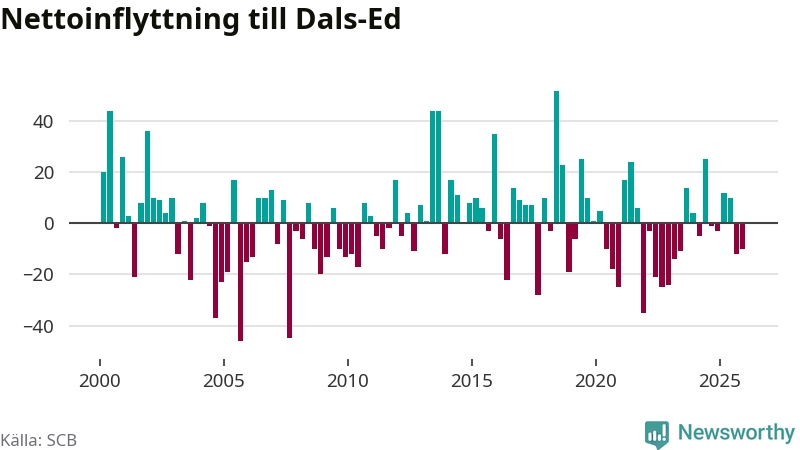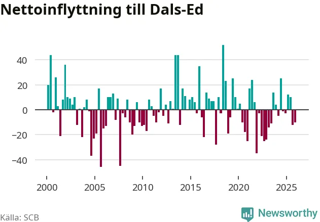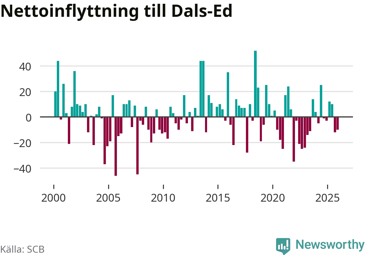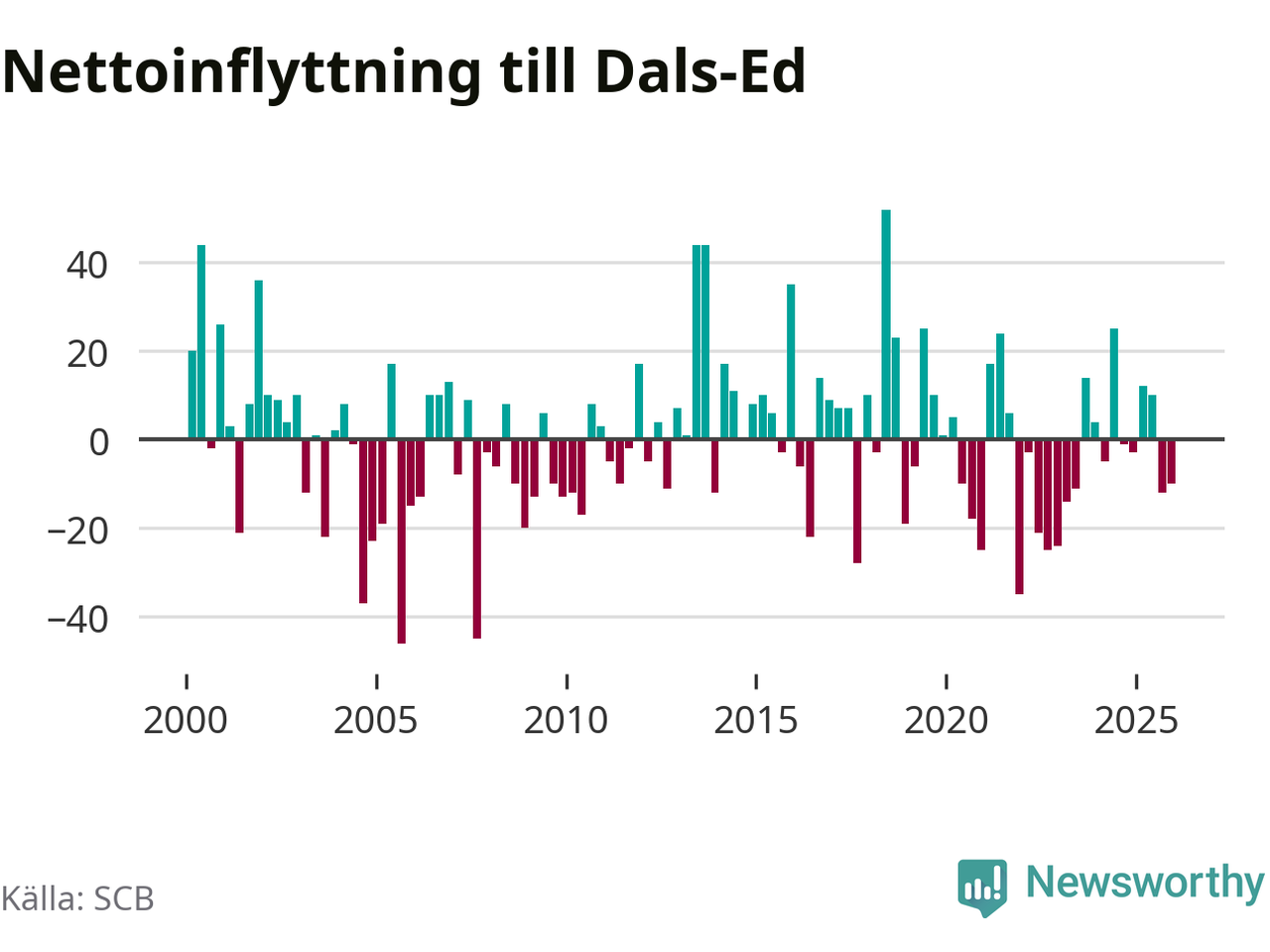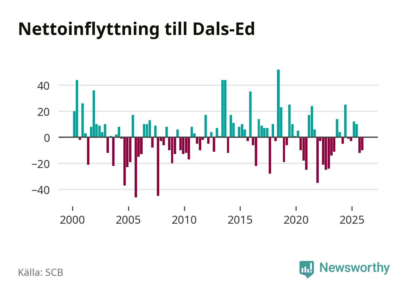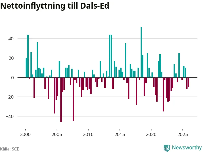 Under fjärde kvartalet 2025 flyttade 37 personer till kommunen medan 47 personer flyttade därifrån. Det är historiskt sett en liten inflyttning under ett kvartal. Sedan seklets början har Dals-Ed haft ungefär lika många kvartal med positivt flyttnetto som negativt.