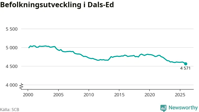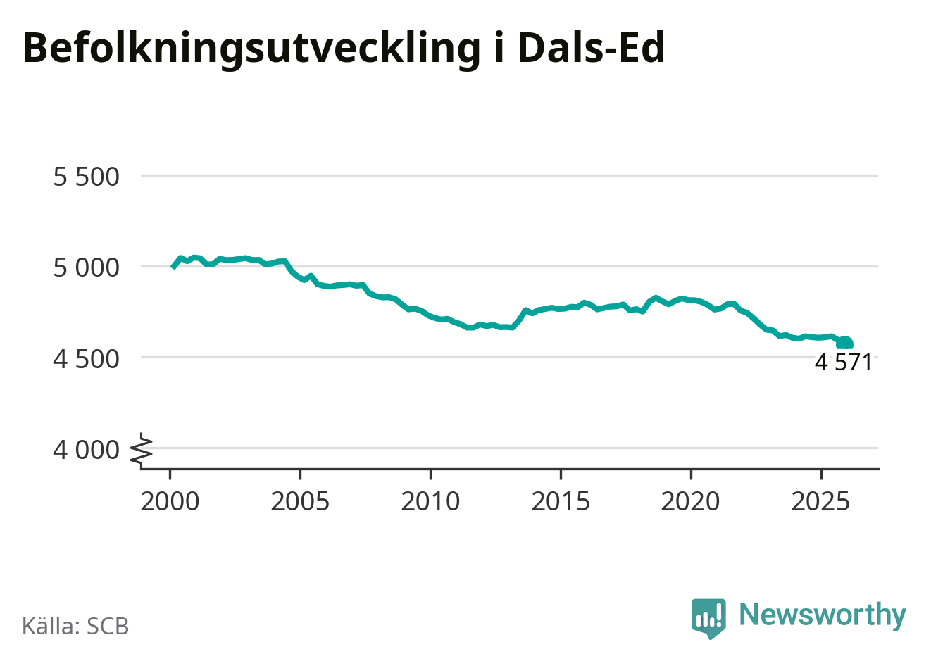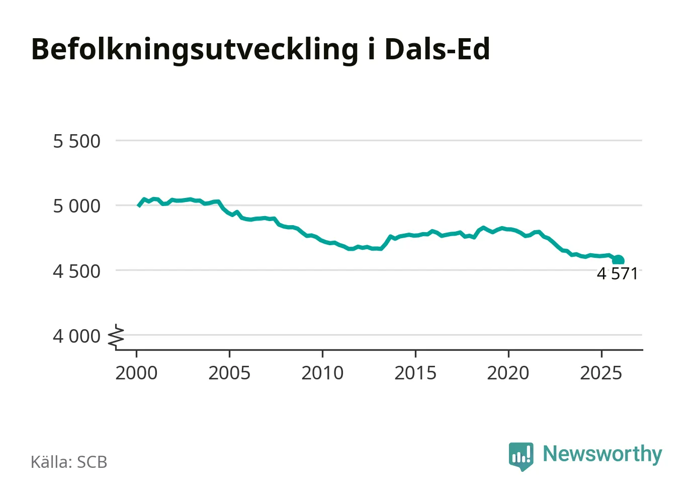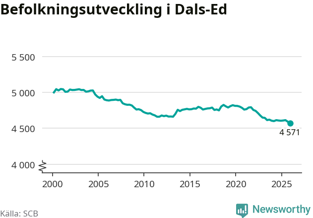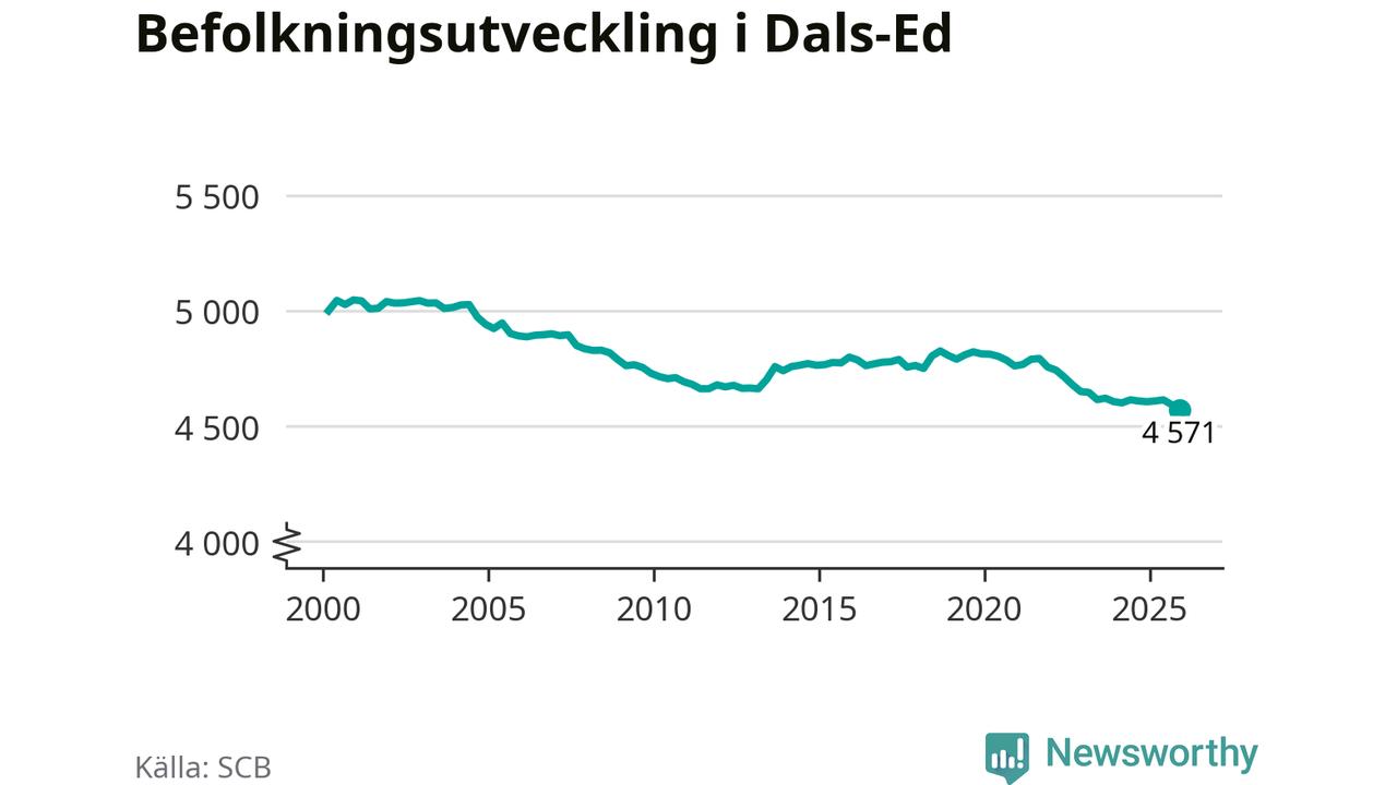 Befolkningen minskade i Dals-Eds kommun under det fjärde kvartalet 2025. Den 31 december bodde enligt SCB:s senaste siffror 4 571 personer i kommunen, vilket är 22 färre än i slutet av tredje kvartalet. Minskningen är procentuellt sett en av de största i Västra Götaland.