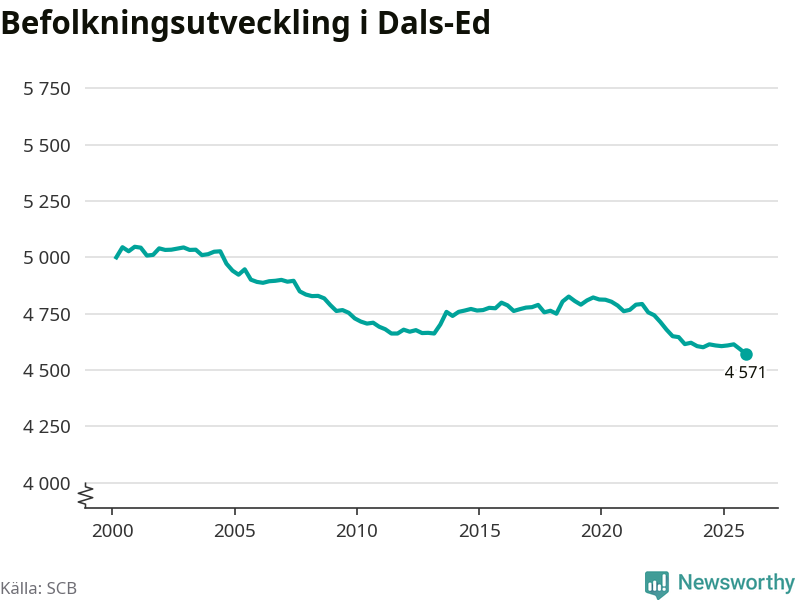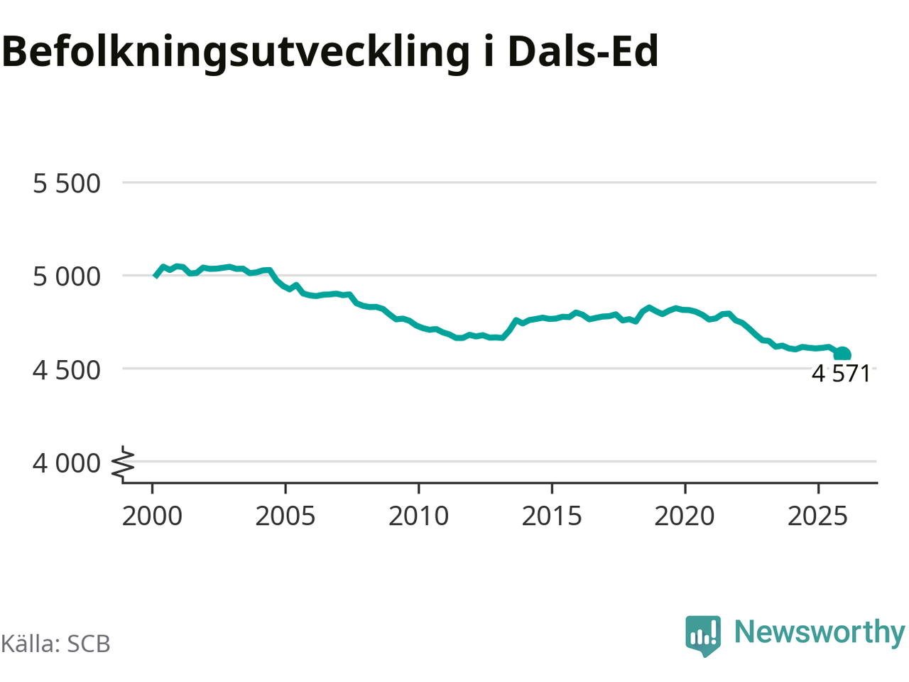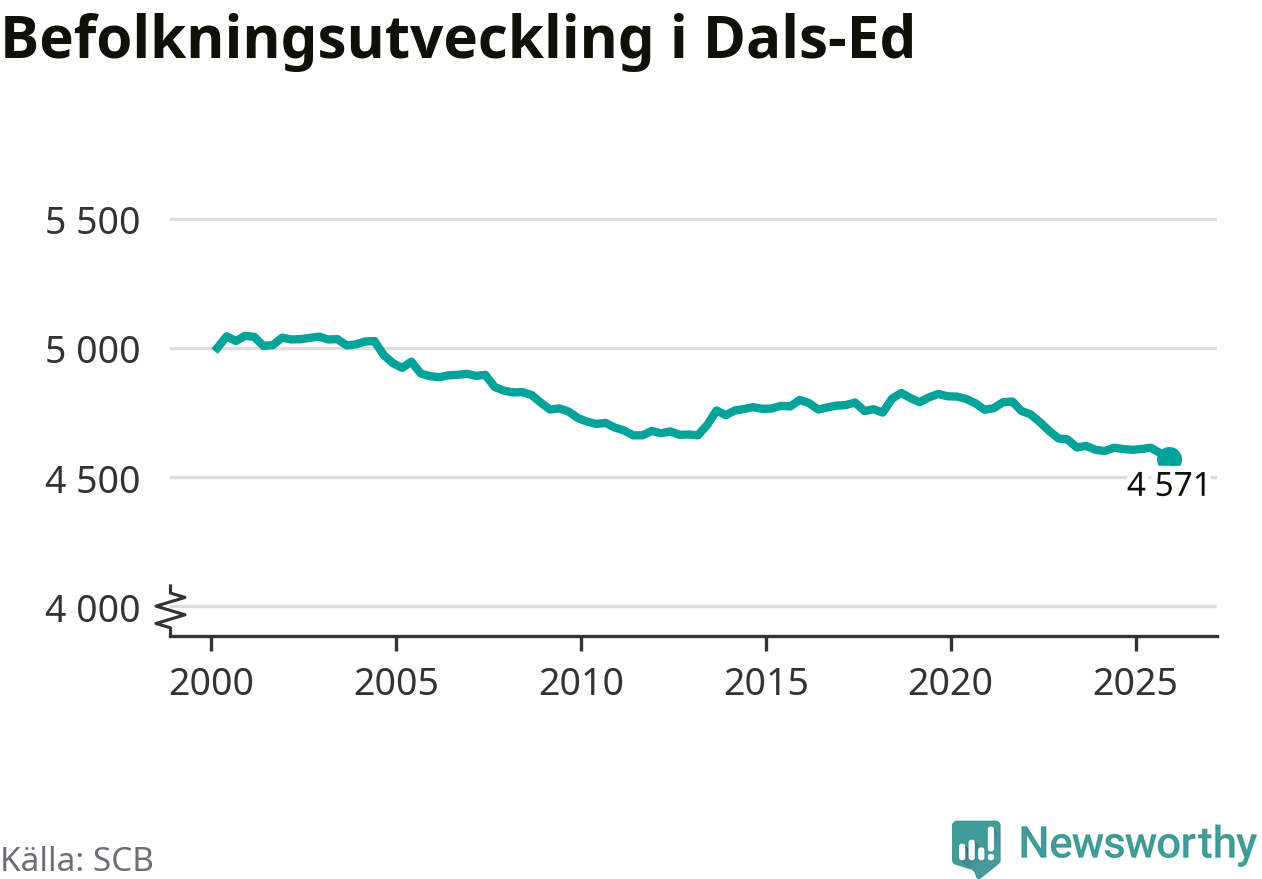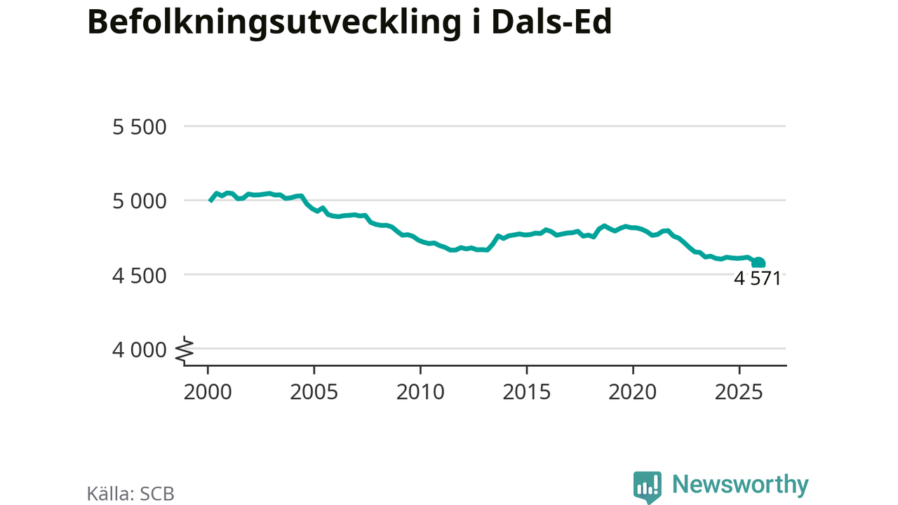 Befolkningen minskade i Dals-Eds kommun under det fjärde kvartalet 2025. Den 31 december bodde enligt SCB:s senaste siffror 4 571 personer i kommunen, vilket är 22 färre än i slutet av tredje kvartalet. Minskningen är procentuellt sett en av de största i Västra Götaland.