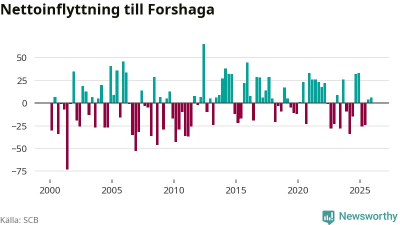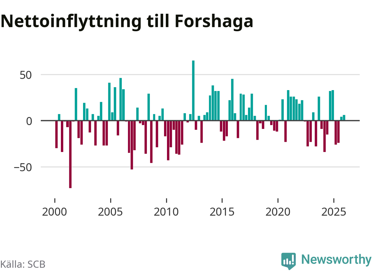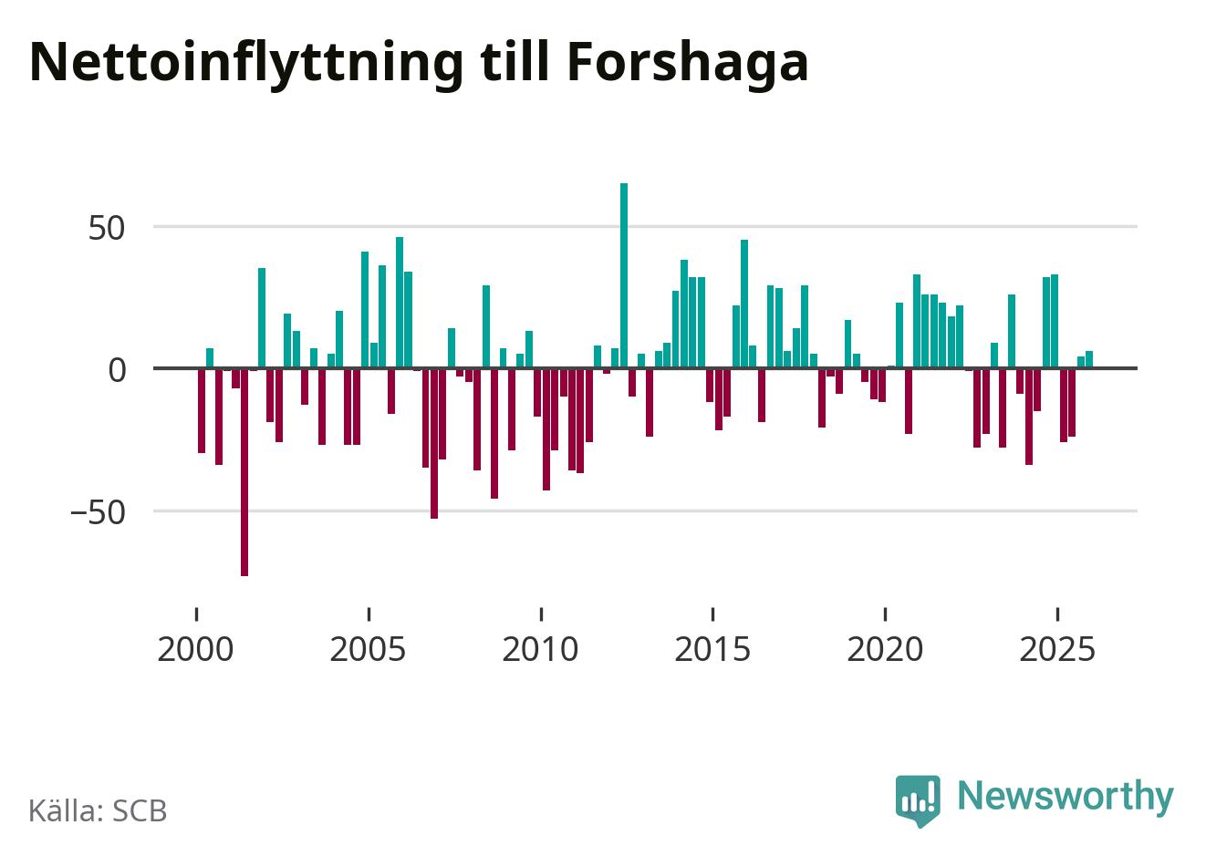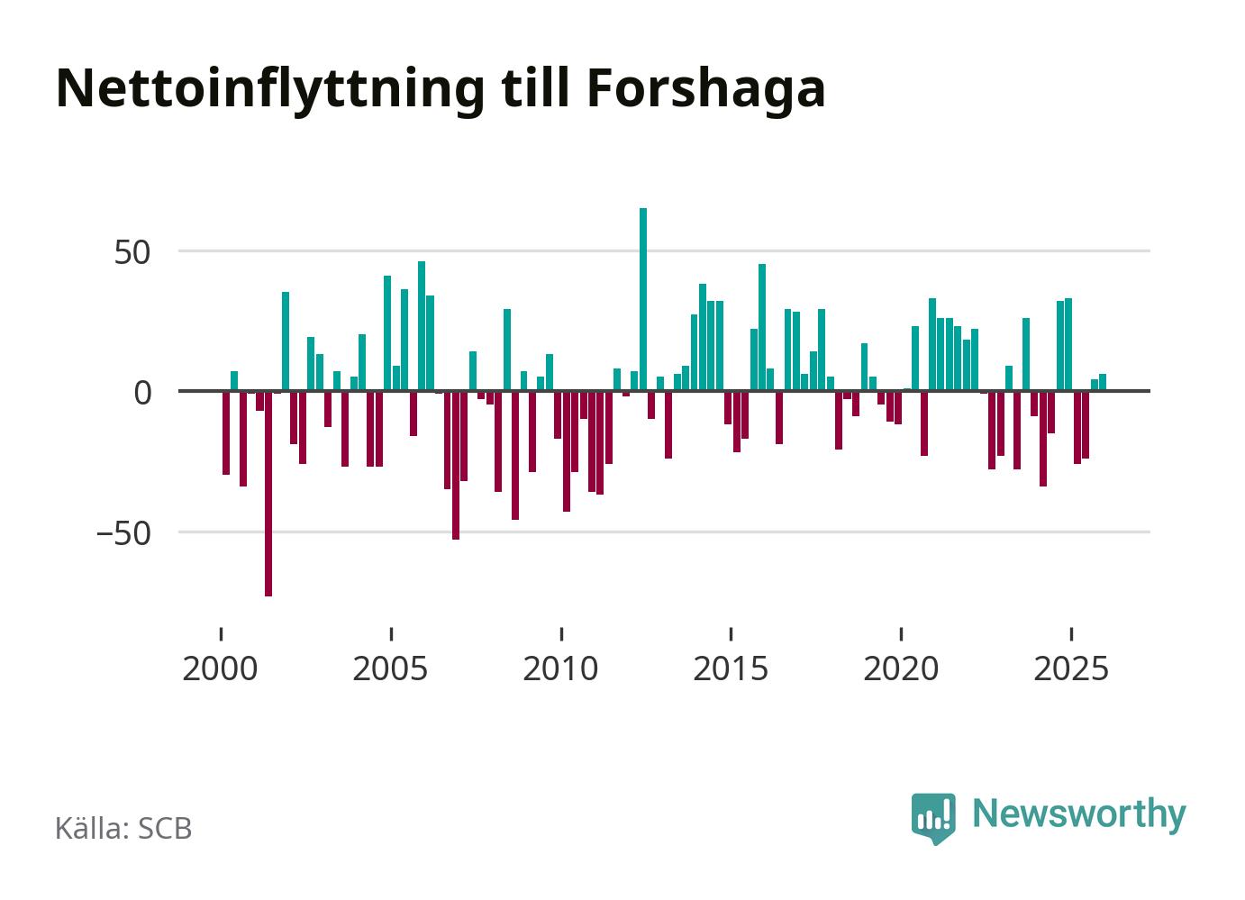 Under fjärde kvartalet 2025 flyttade 162 personer till kommunen medan 156 personer flyttade därifrån. Skillnaden mellan antalet in- och utflyttade är så liten att den lika gärna kan bero på SCB:s slumpmässiga brus. Sedan seklets början har Forshaga haft ungefär lika många kvartal med positivt flyttnetto som negativt.