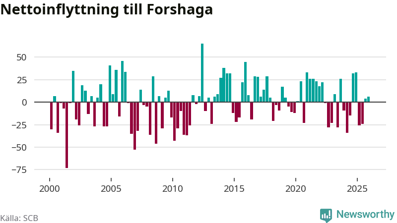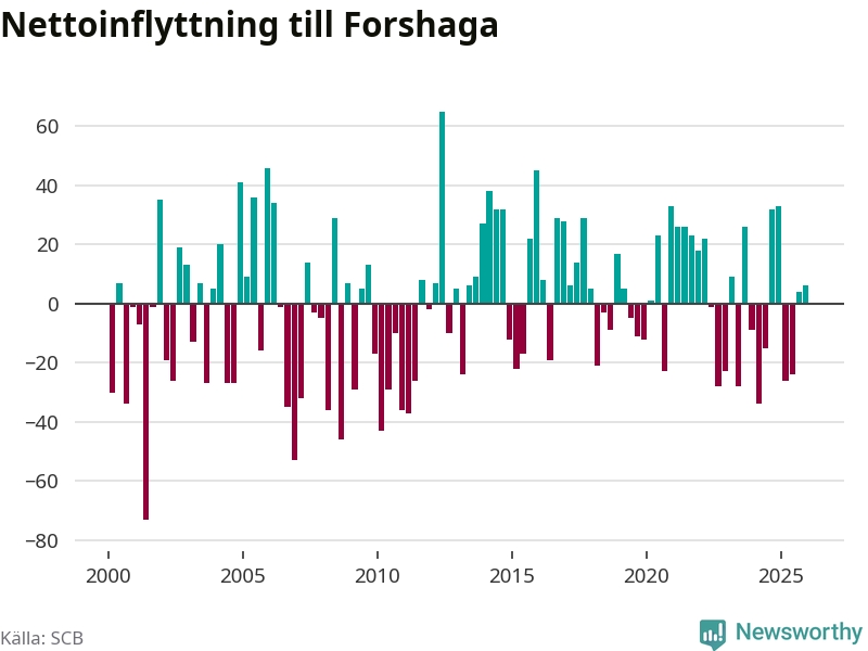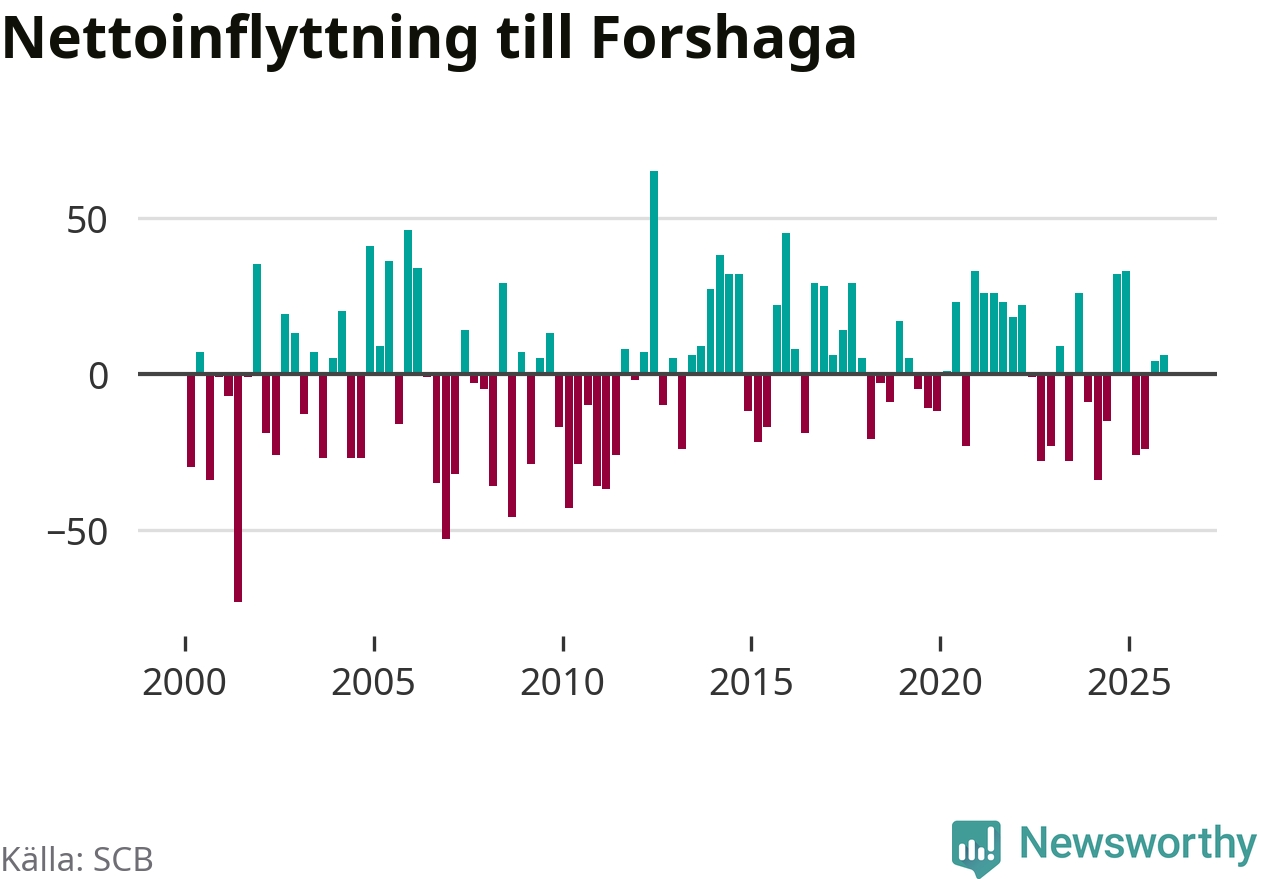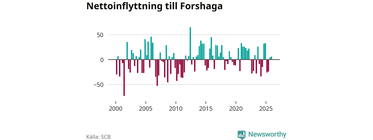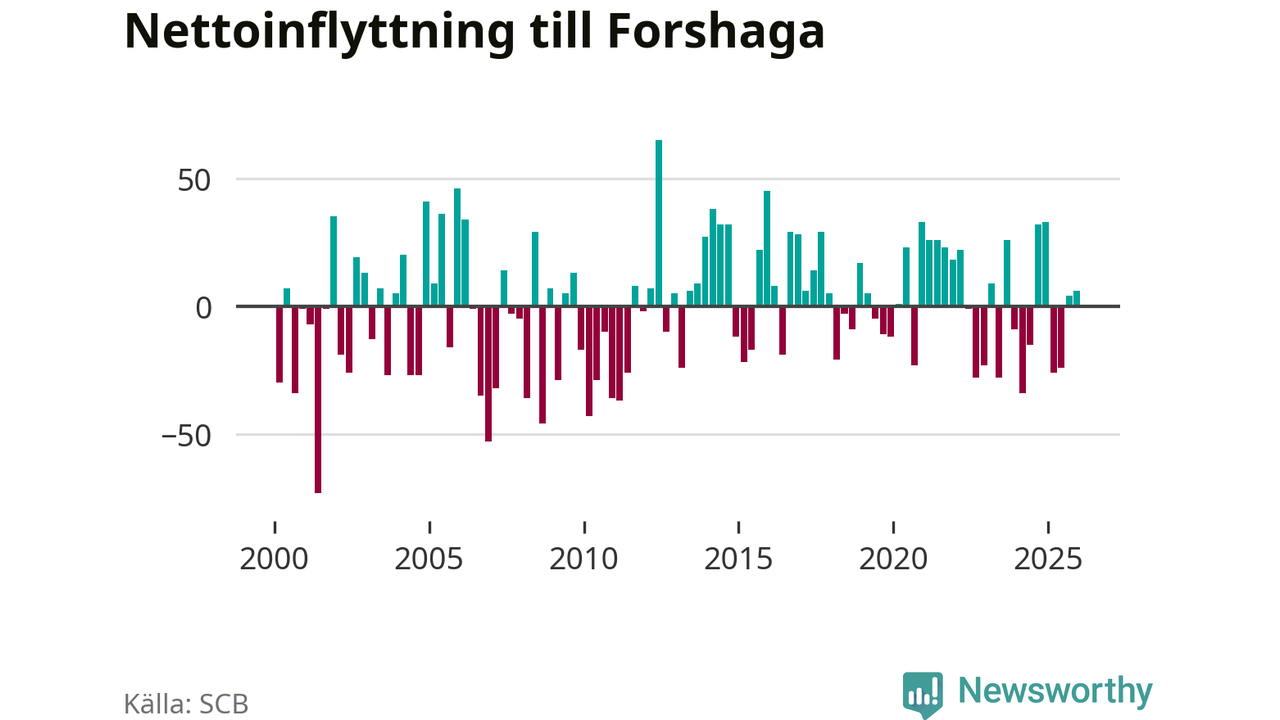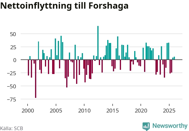 Under fjärde kvartalet 2025 flyttade 162 personer till kommunen medan 156 personer flyttade därifrån. Skillnaden mellan antalet in- och utflyttade är så liten att den lika gärna kan bero på SCB:s slumpmässiga brus. Sedan seklets början har Forshaga haft ungefär lika många kvartal med positivt flyttnetto som negativt.
