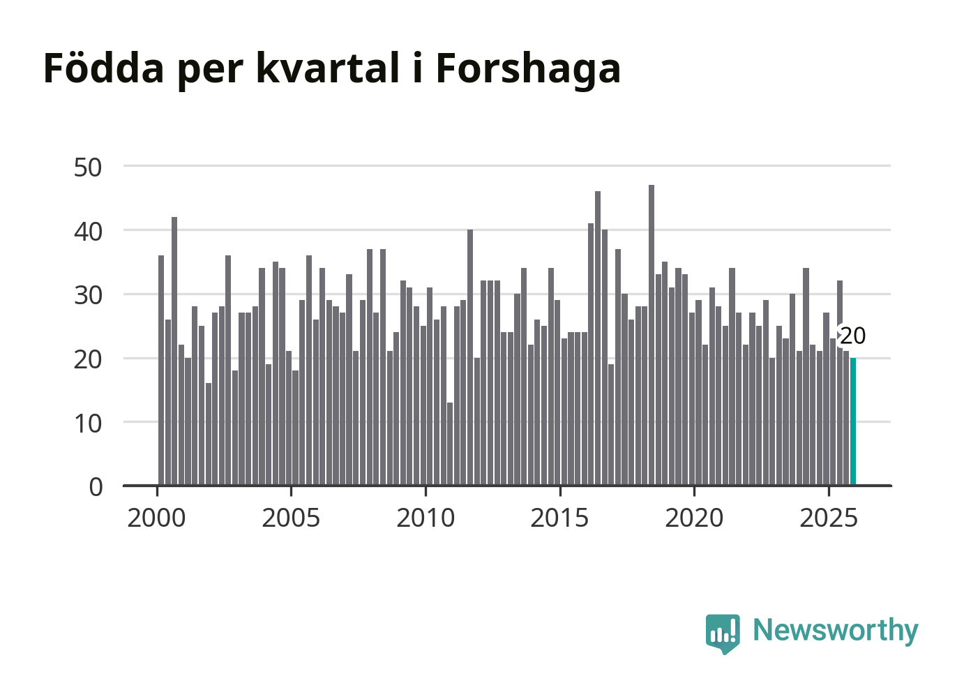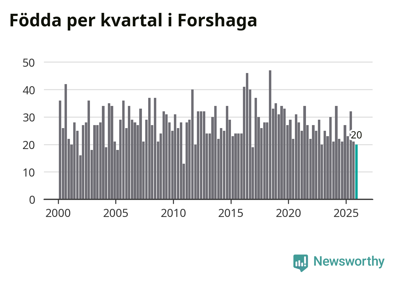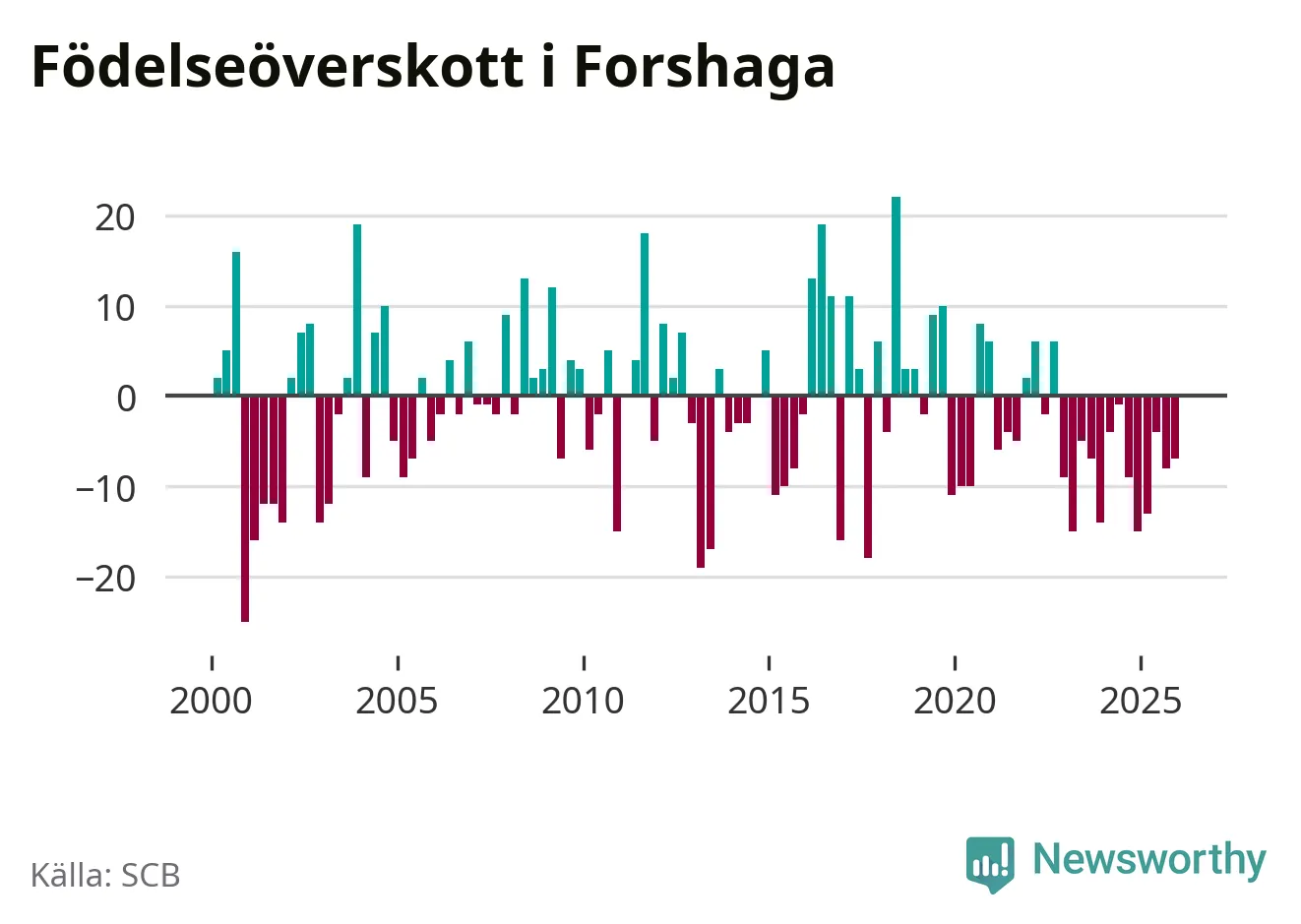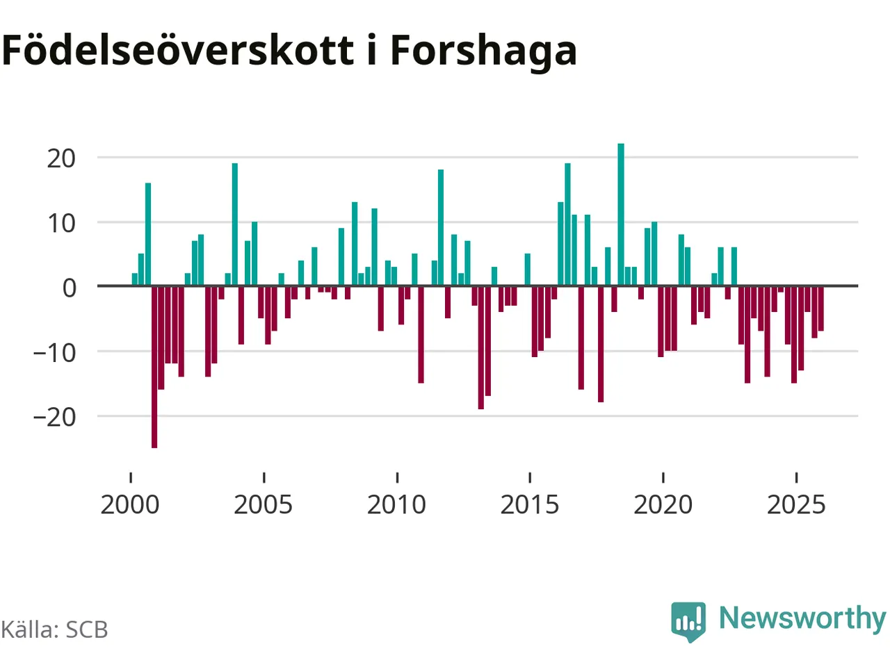 Enligt SCB:s siffror föddes 20 barn i Forshaga under det senaste kvartalet. Samtidigt avled 27 personer. Forshaga hade alltså ett negativt födelsenetto, vilket kommunen historiskt sett oftast har haft.