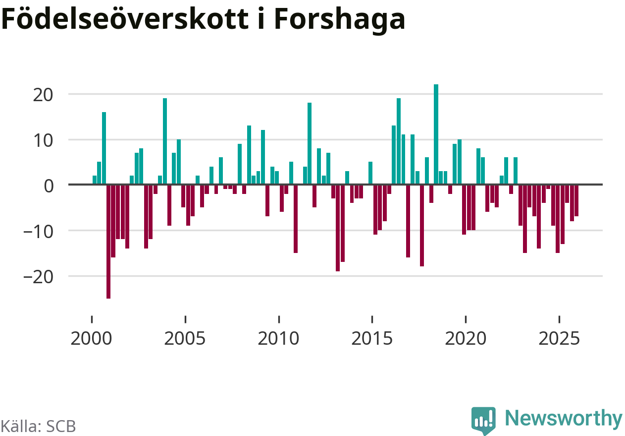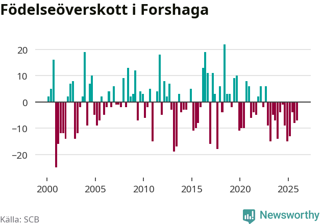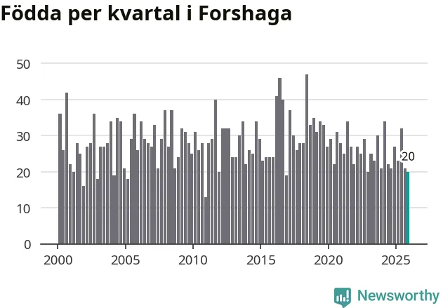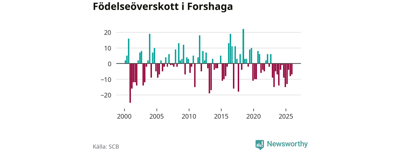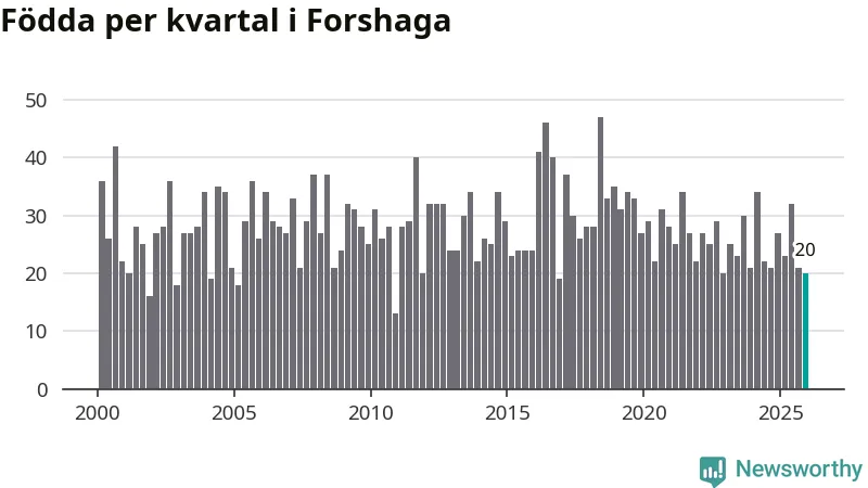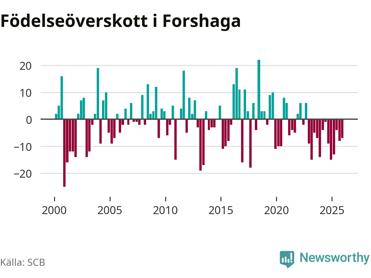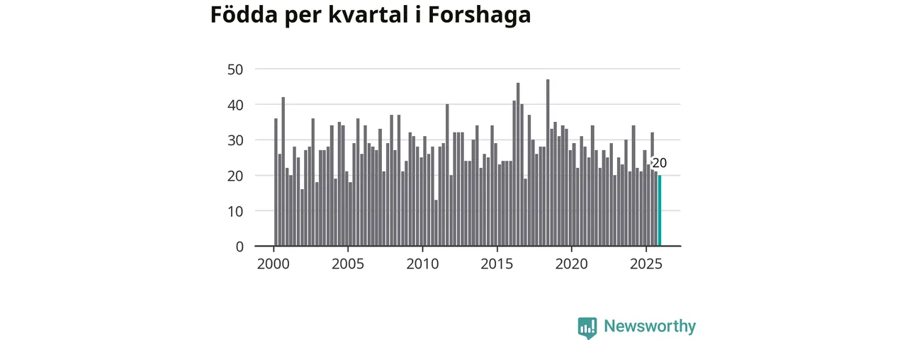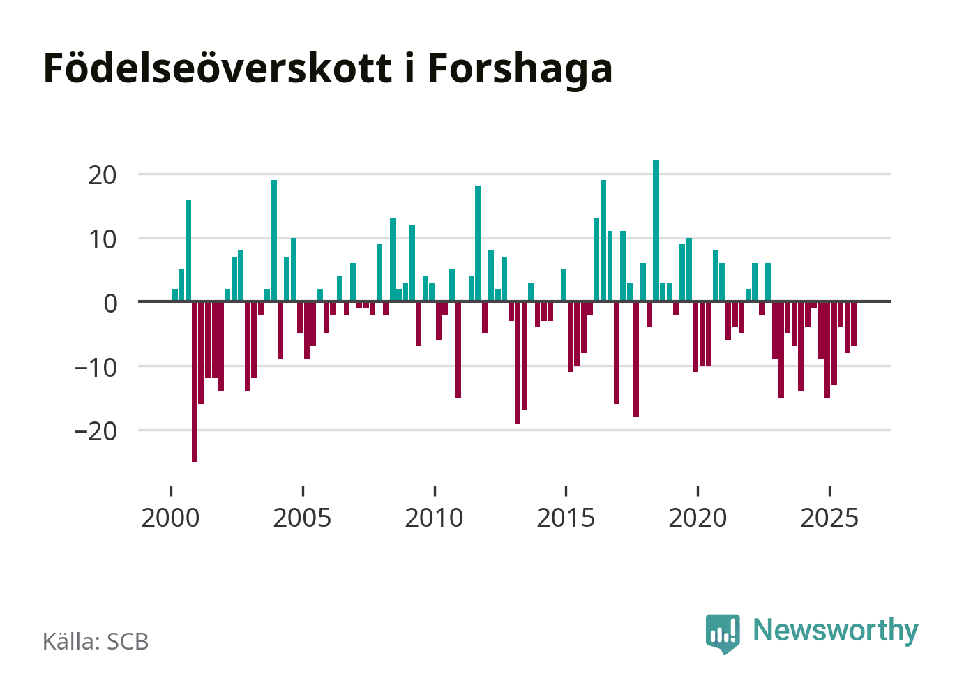 Enligt SCB:s siffror föddes 20 barn i Forshaga under det senaste kvartalet. Samtidigt avled 27 personer. Forshaga hade alltså ett negativt födelsenetto, vilket kommunen historiskt sett oftast har haft.