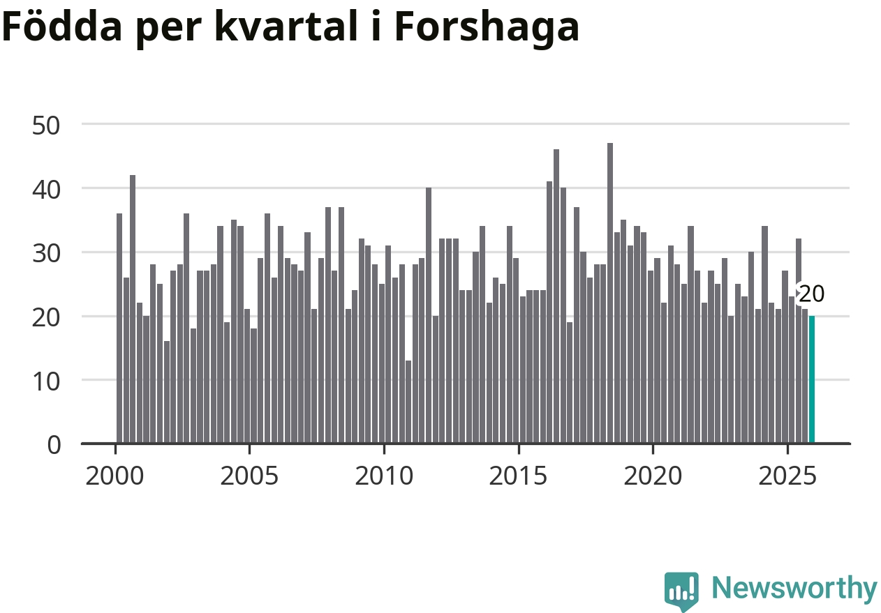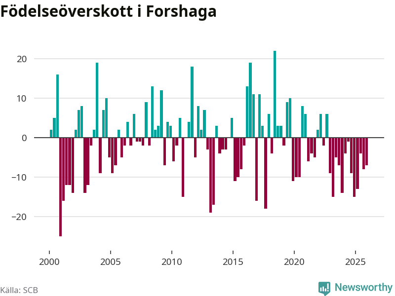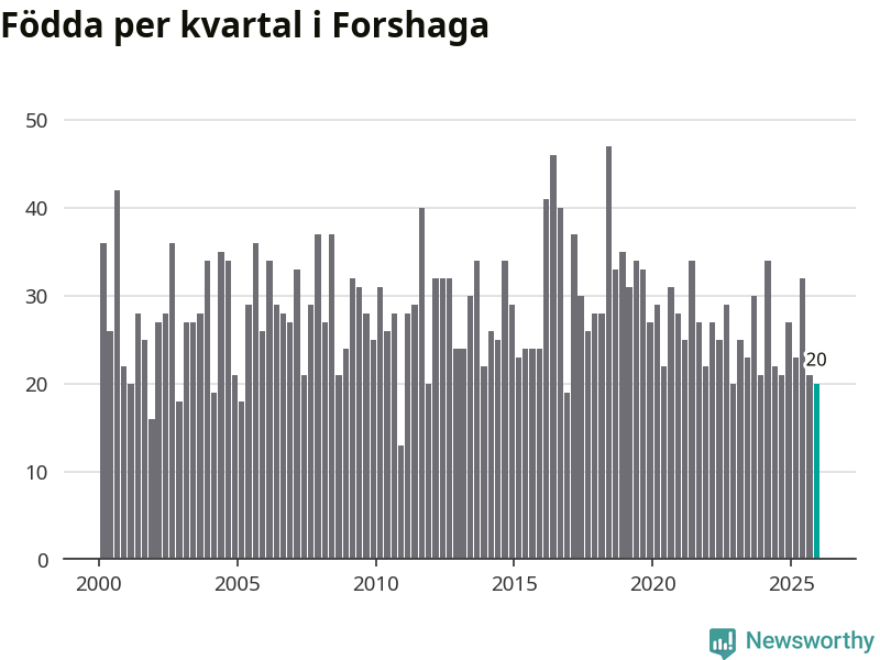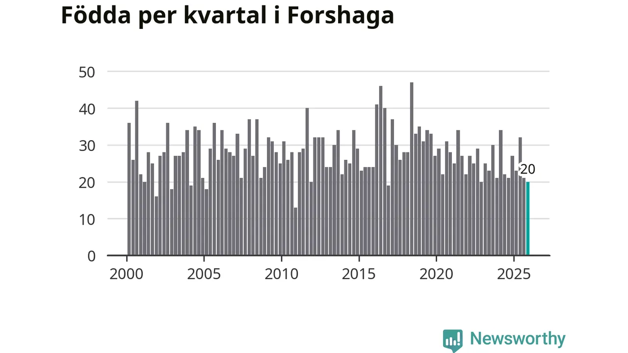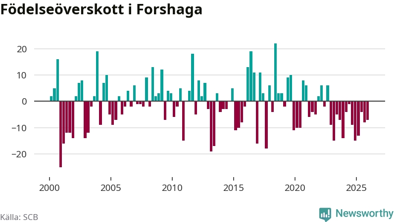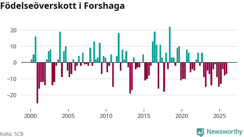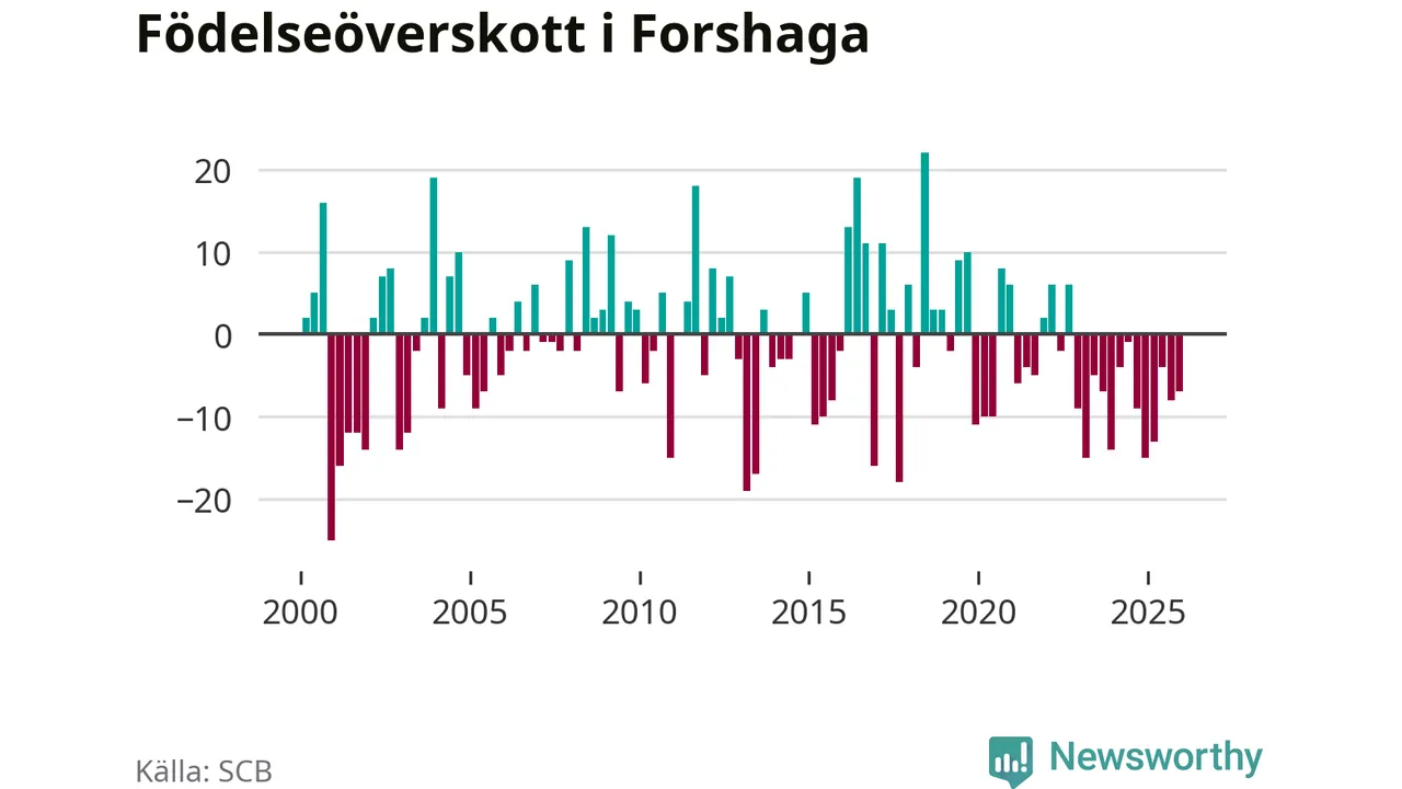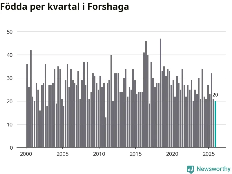 Enligt SCB:s siffror föddes 20 barn i Forshaga under det senaste kvartalet. Samtidigt avled 27 personer. Forshaga hade alltså ett negativt födelsenetto, vilket kommunen historiskt sett oftast har haft.