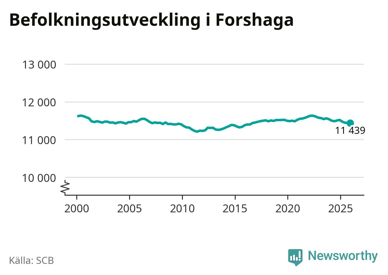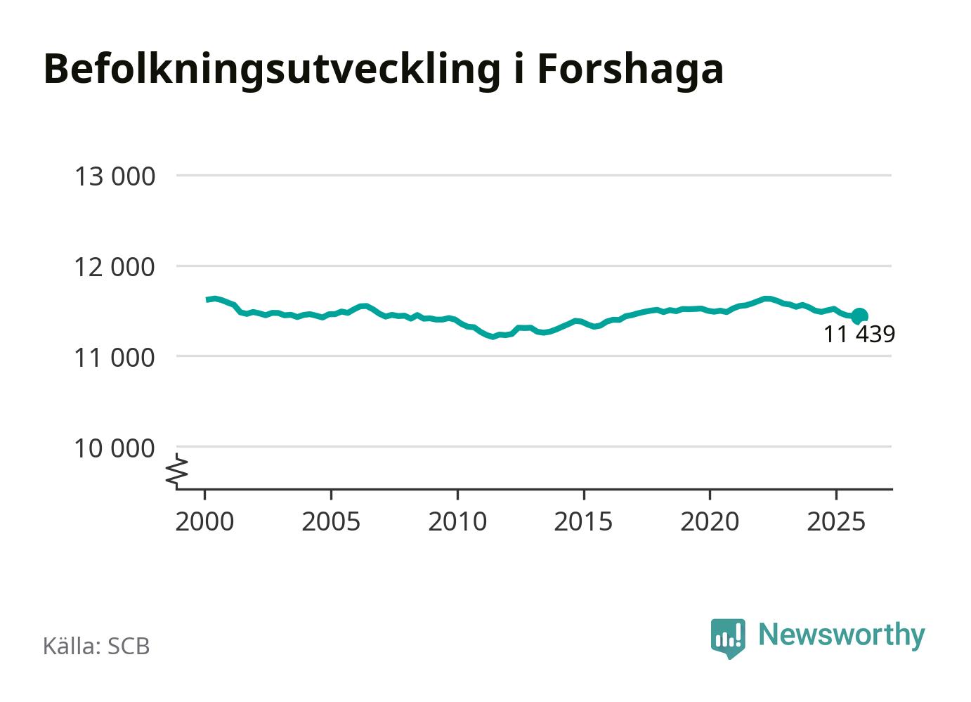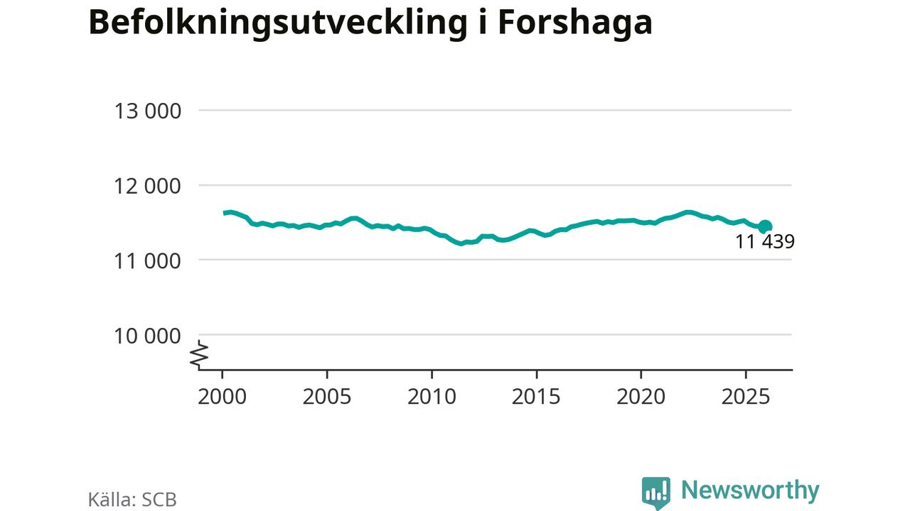 Den 31 december bodde 11 439 personer i Forshaga kommun, enligt SCB:s senaste siffror. Det är något färre än i slutet av tredje kvartalet, men skillnaden är så liten att den lika gärna kan bero på den lilla justering som SCB gör av siffrorna för att skydda enskilda individers identitet.