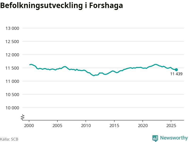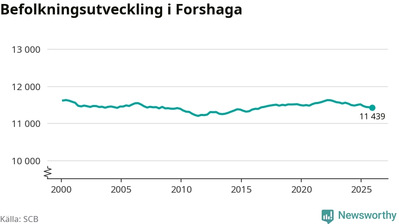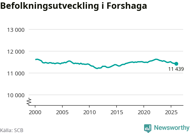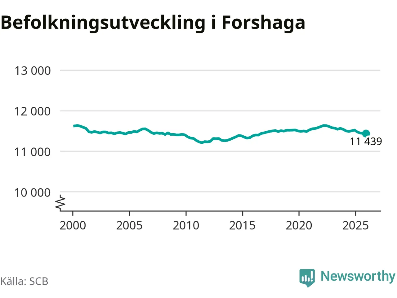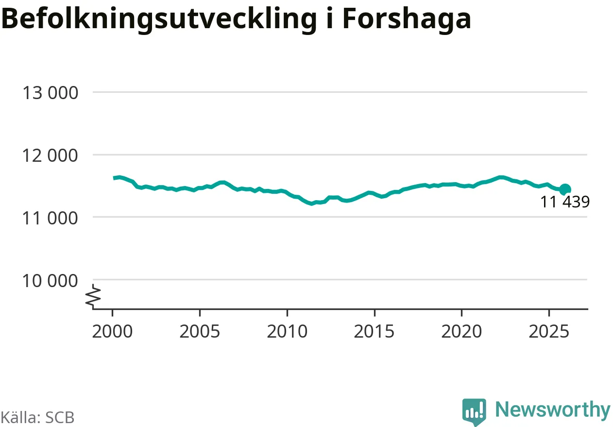 Den 31 december bodde 11 439 personer i Forshaga kommun, enligt SCB:s senaste siffror. Det är något färre än i slutet av tredje kvartalet, men skillnaden är så liten att den lika gärna kan bero på den lilla justering som SCB gör av siffrorna för att skydda enskilda individers identitet.