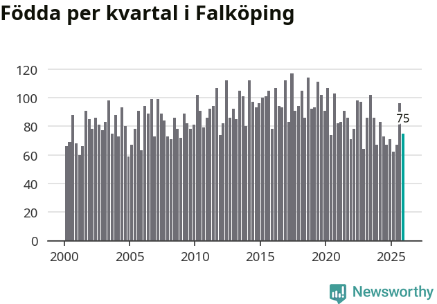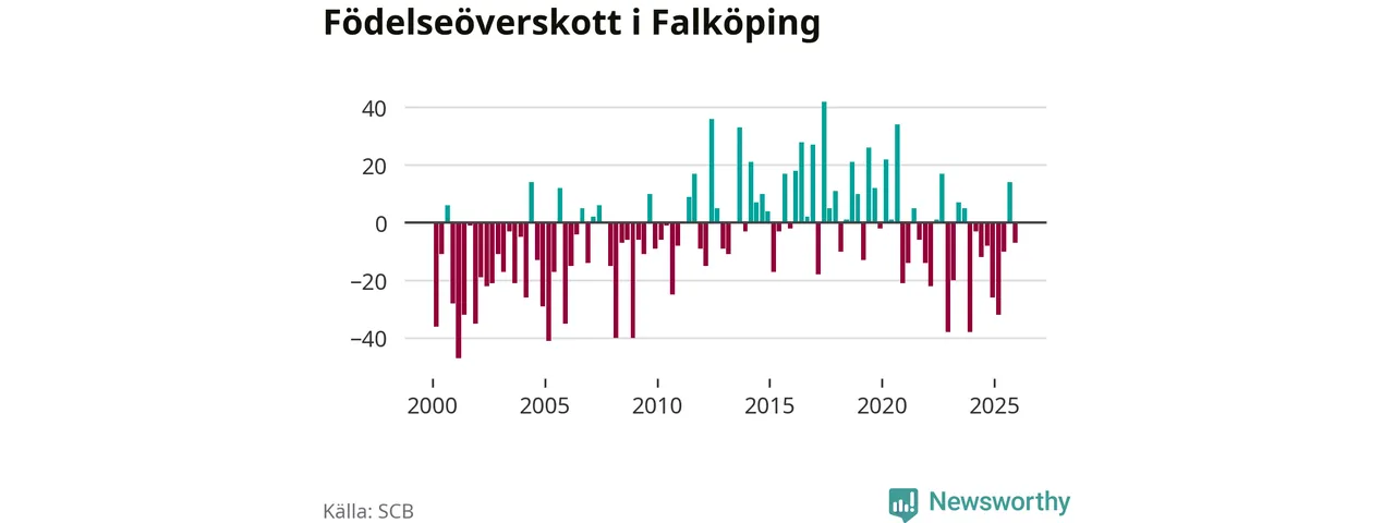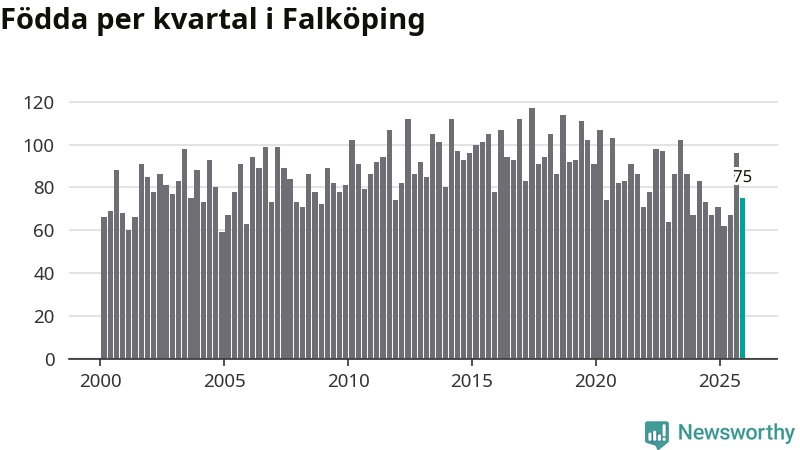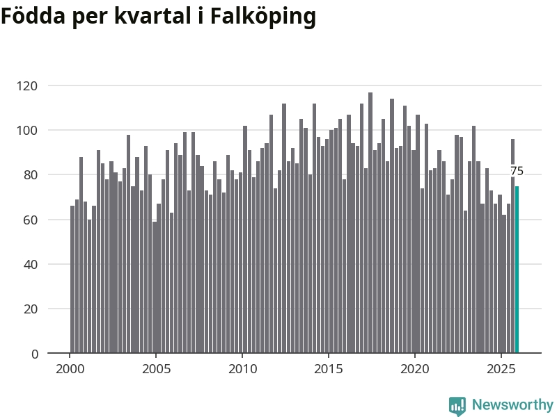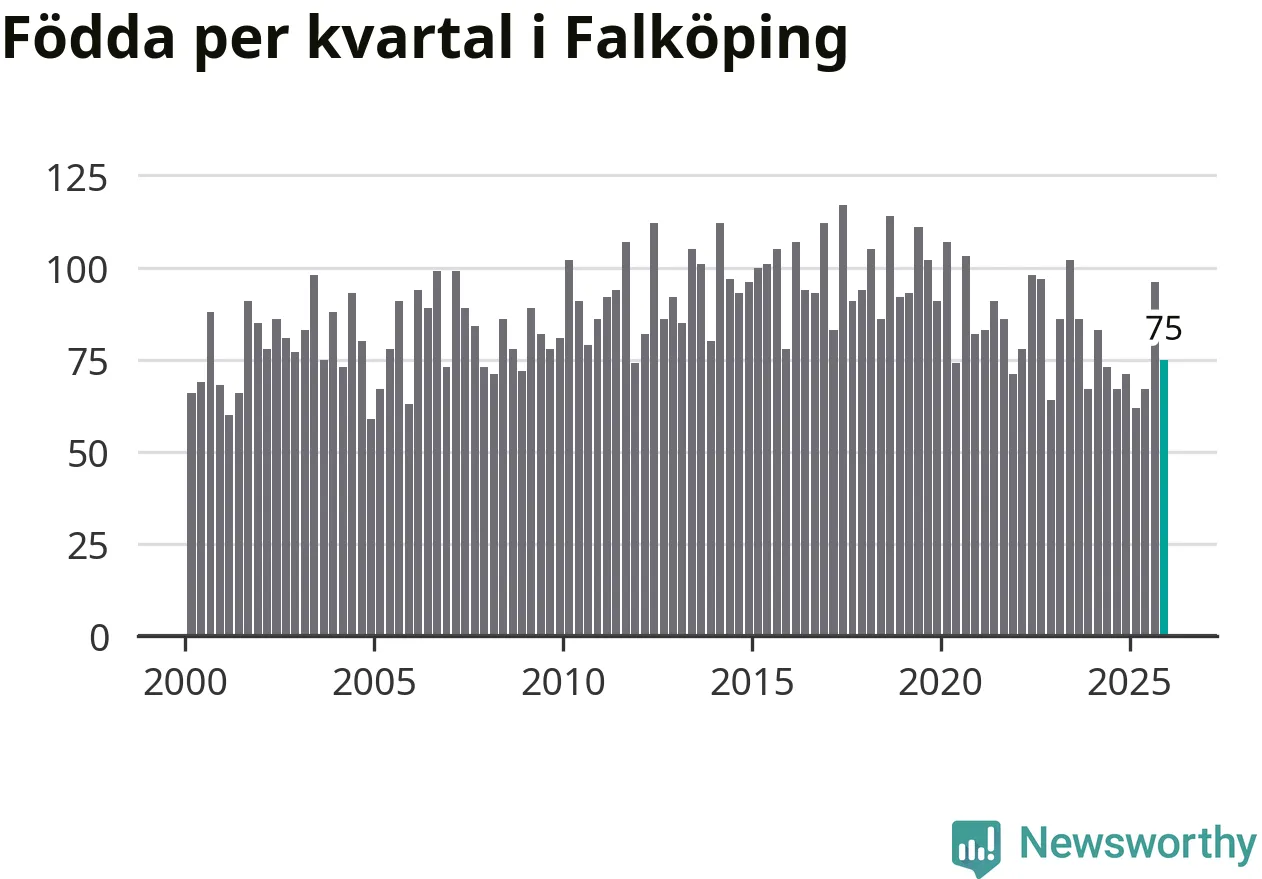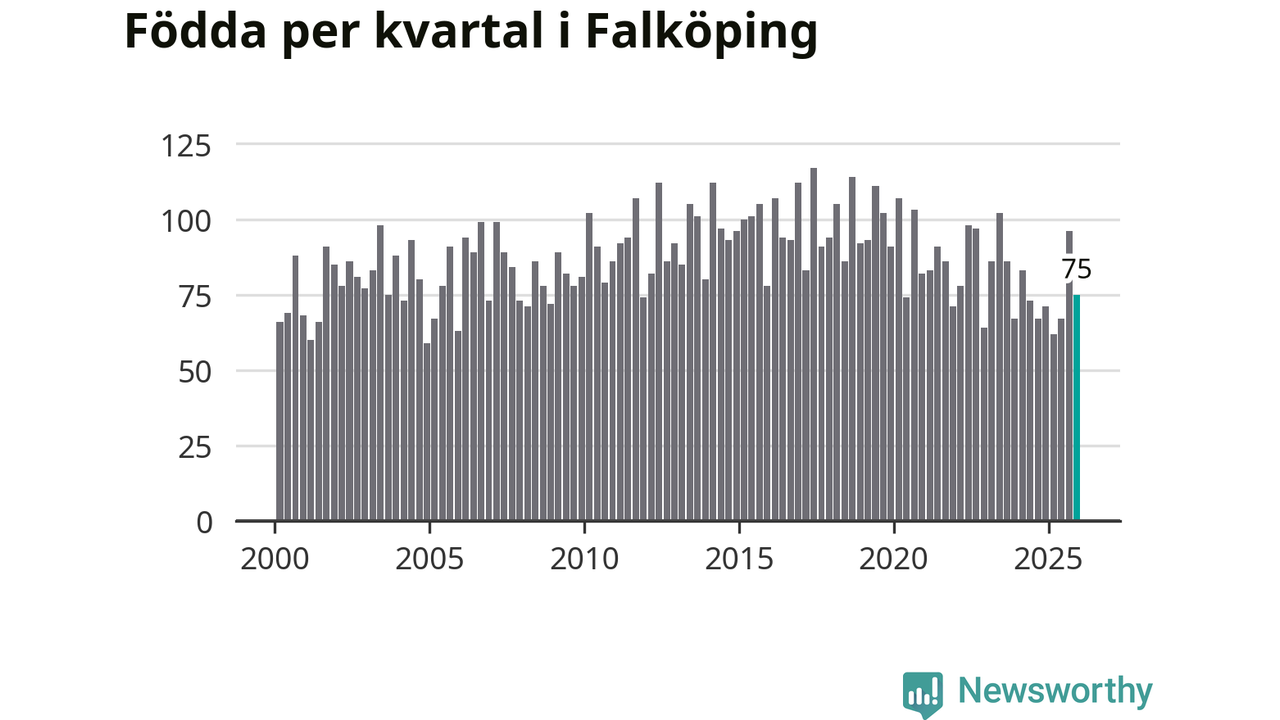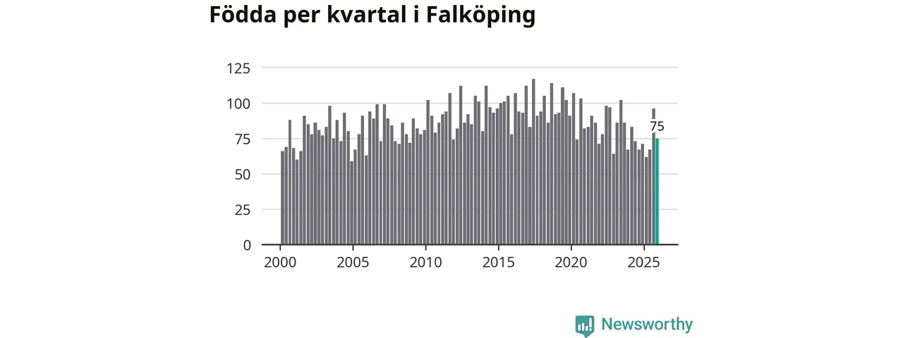 Enligt SCB:s siffror föddes 75 barn i Falköping under det senaste kvartalet. Samtidigt avled 82 personer. Falköping hade alltså ett negativt födelsenetto