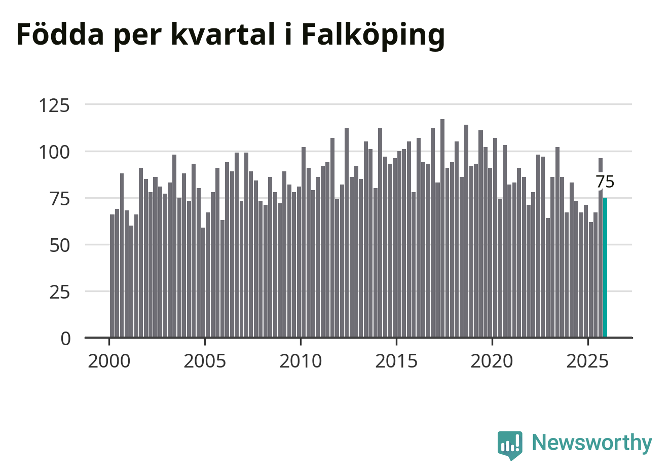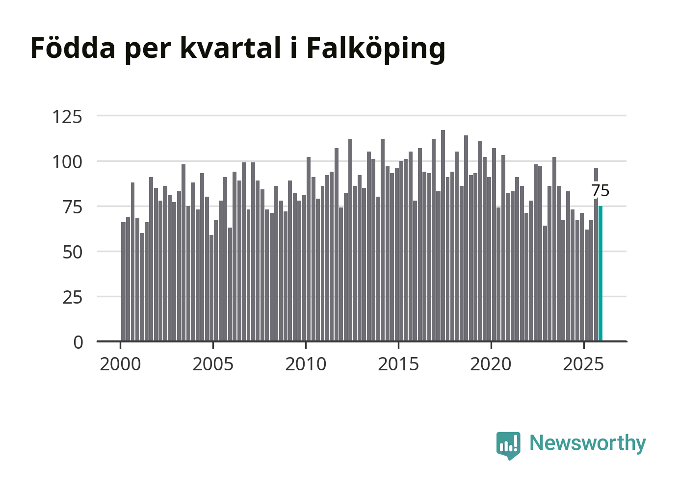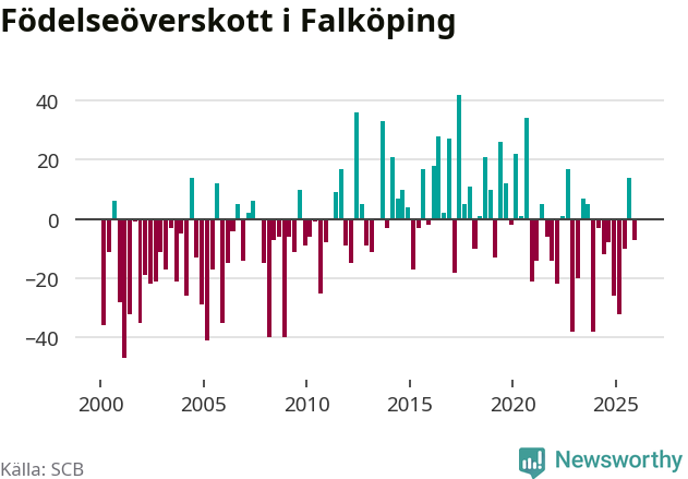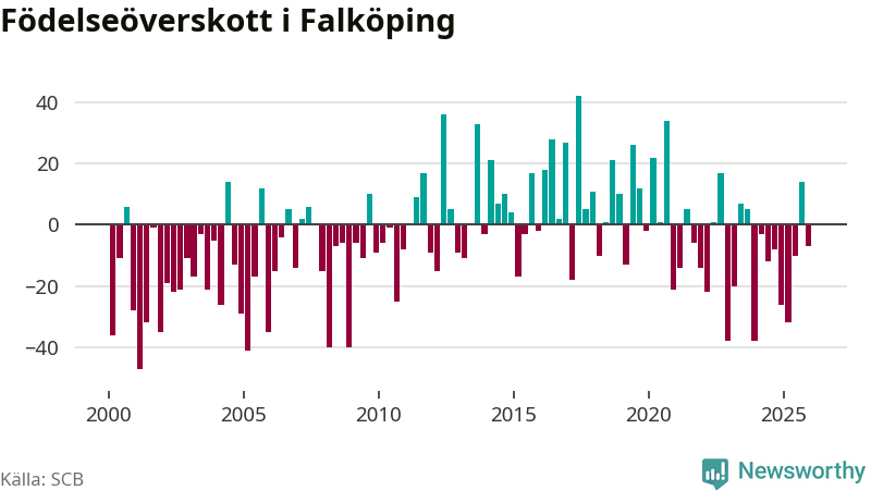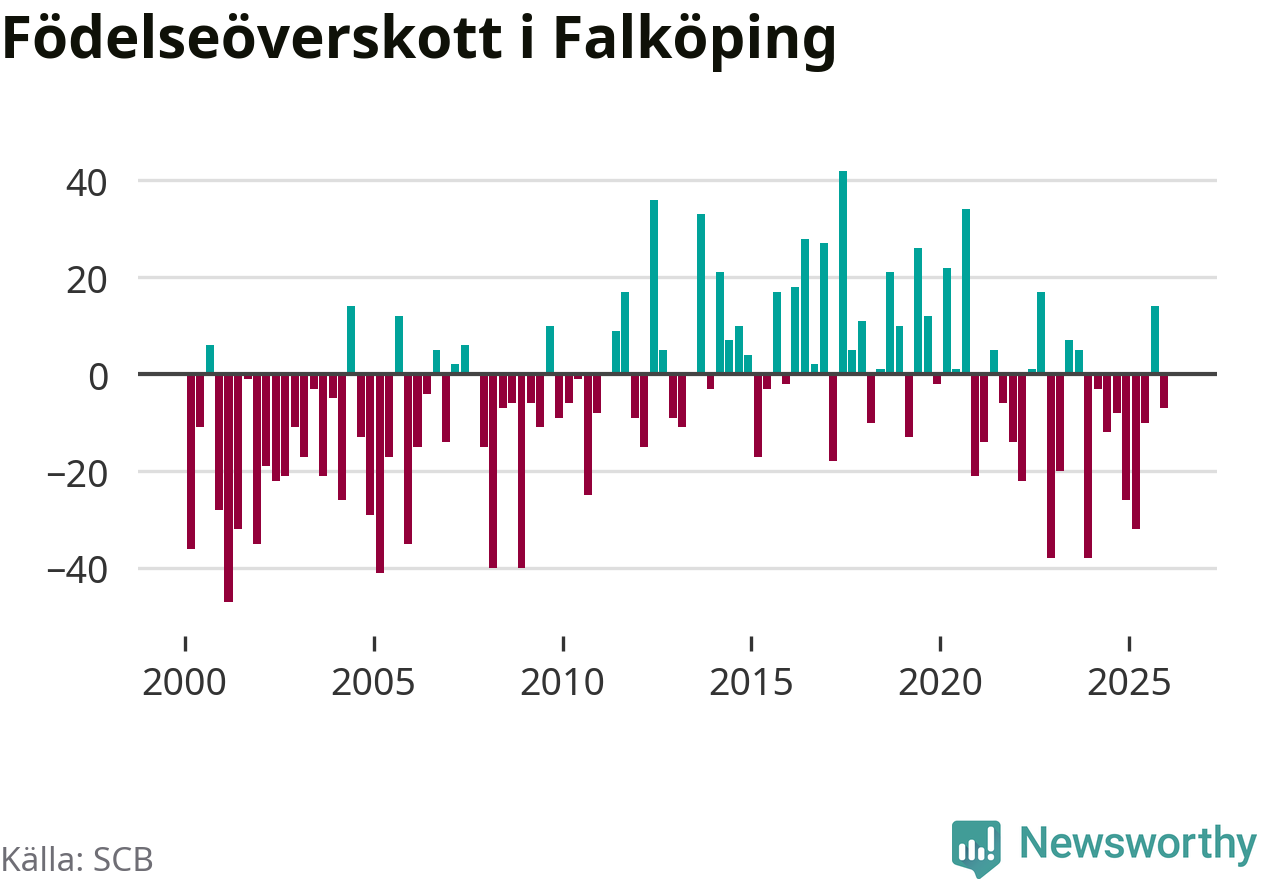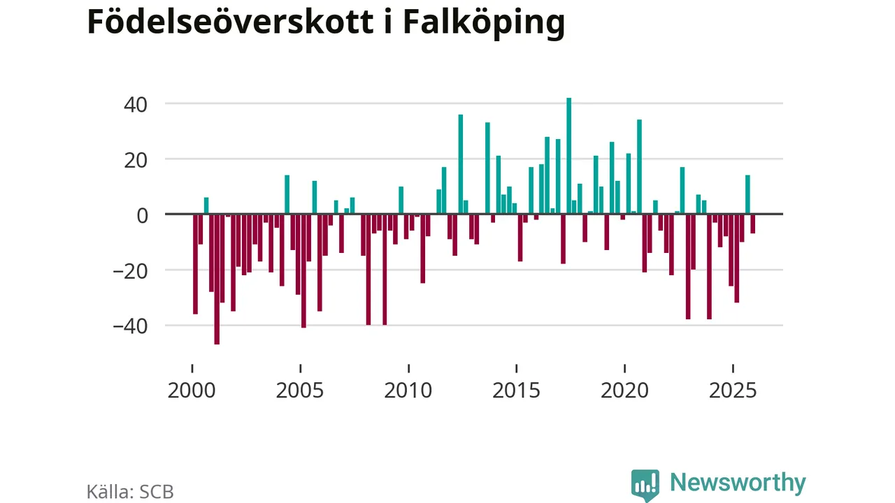 Enligt SCB:s siffror föddes 75 barn i Falköping under det senaste kvartalet. Samtidigt avled 82 personer. Falköping hade alltså ett negativt födelsenetto