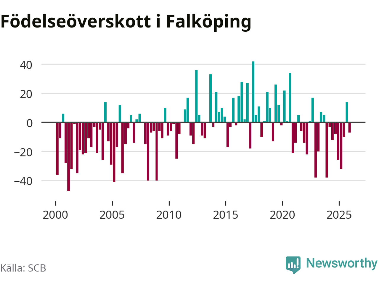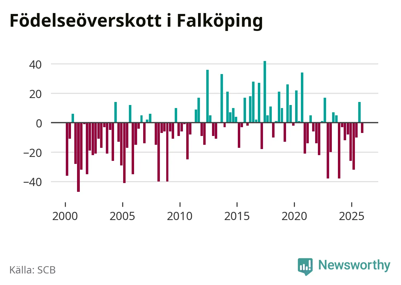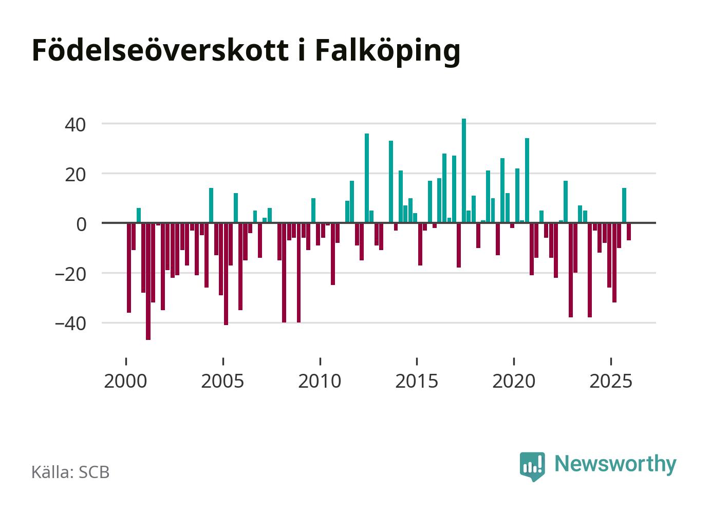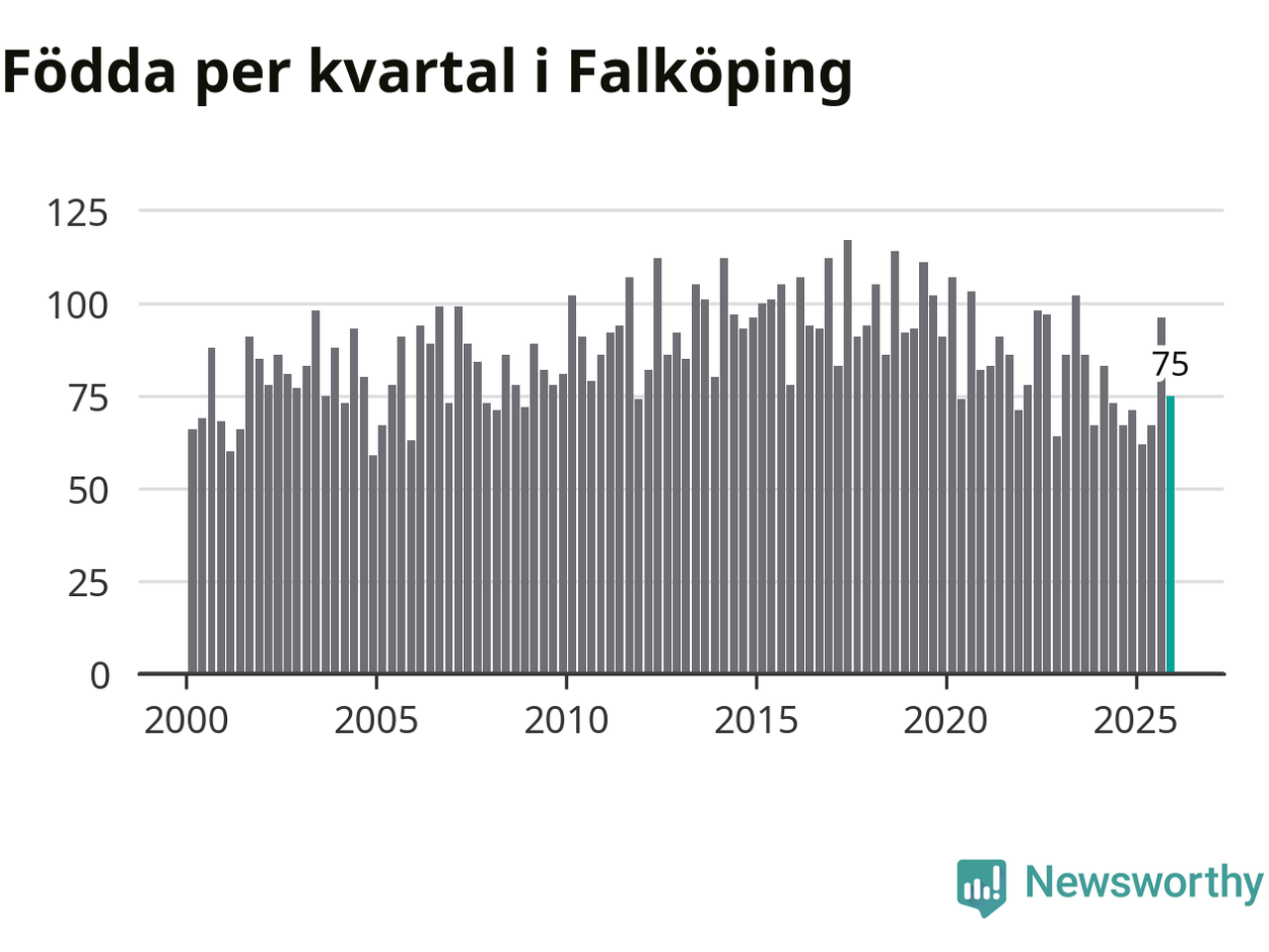 Enligt SCB:s siffror föddes 75 barn i Falköping under det senaste kvartalet. Samtidigt avled 82 personer. Falköping hade alltså ett negativt födelsenetto
