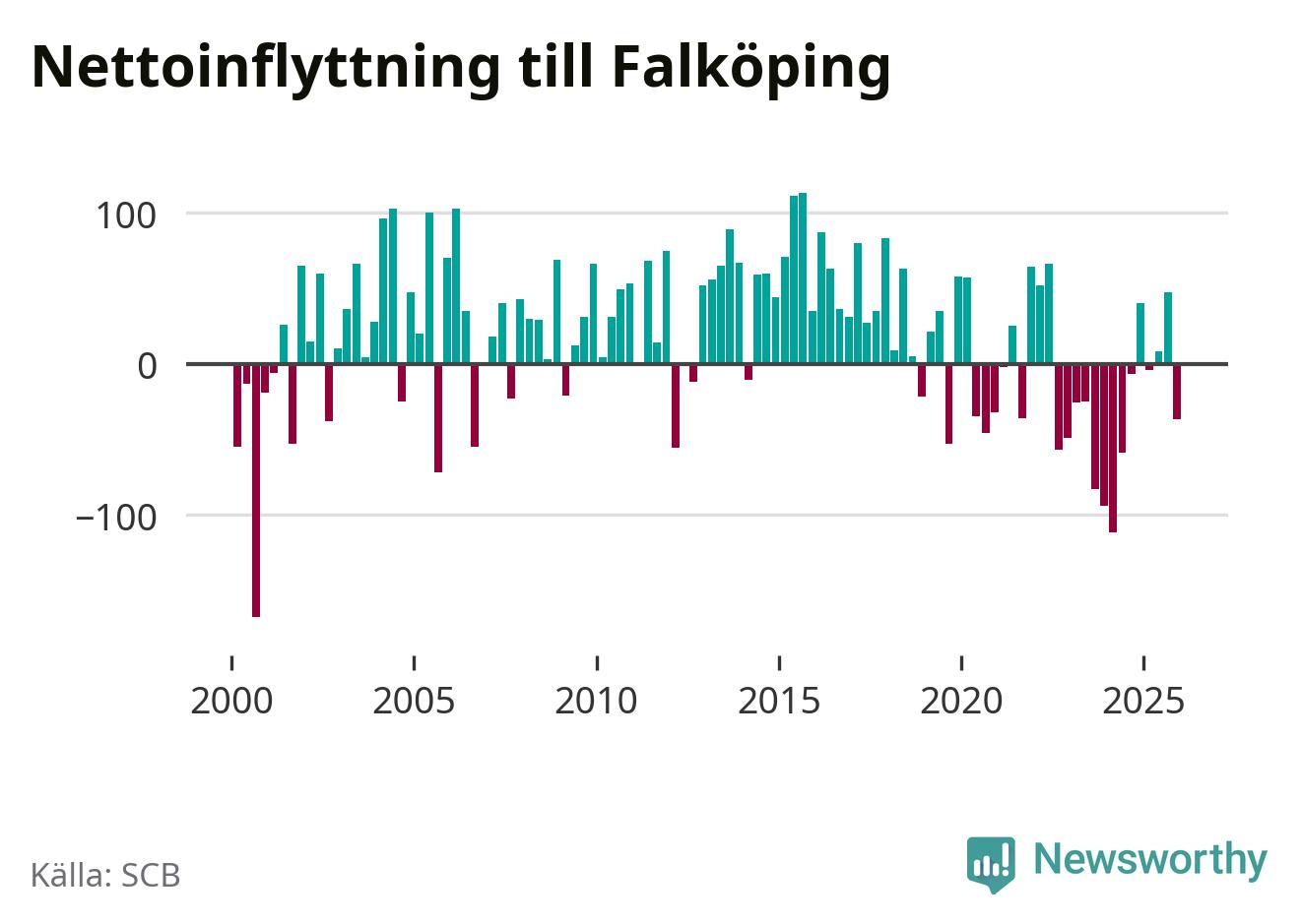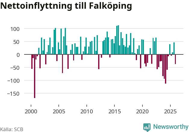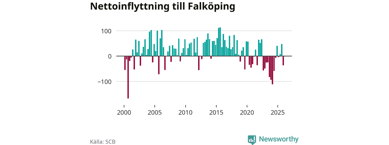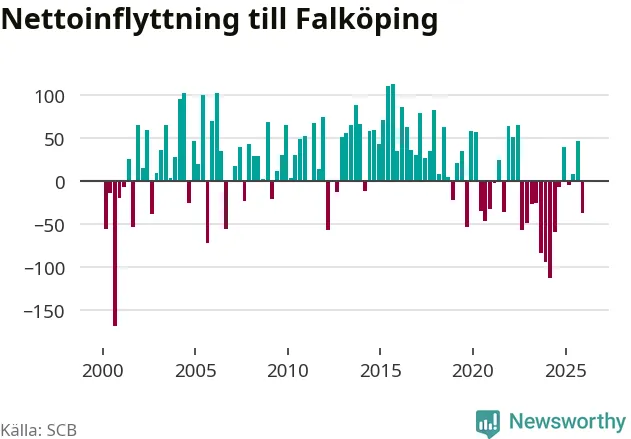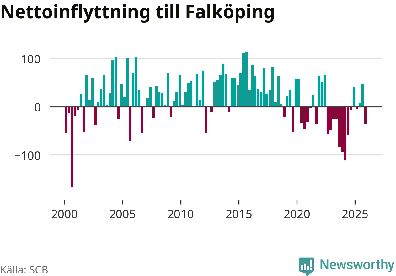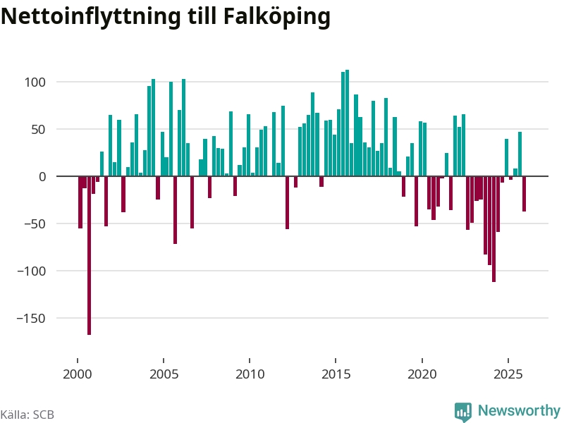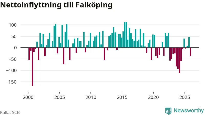 Under fjärde kvartalet 2025 flyttade 325 personer till kommunen medan 362 personer flyttade därifrån. Sedan seklets början har Falköping oftast haft ett positivt flyttnetto.