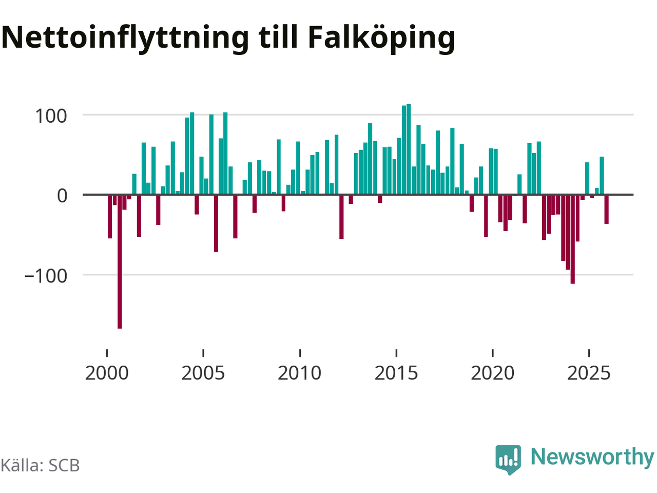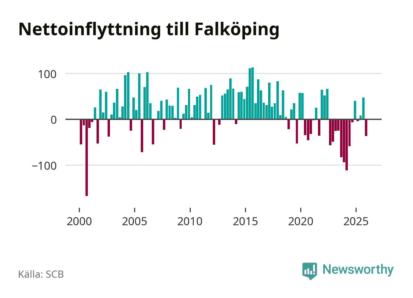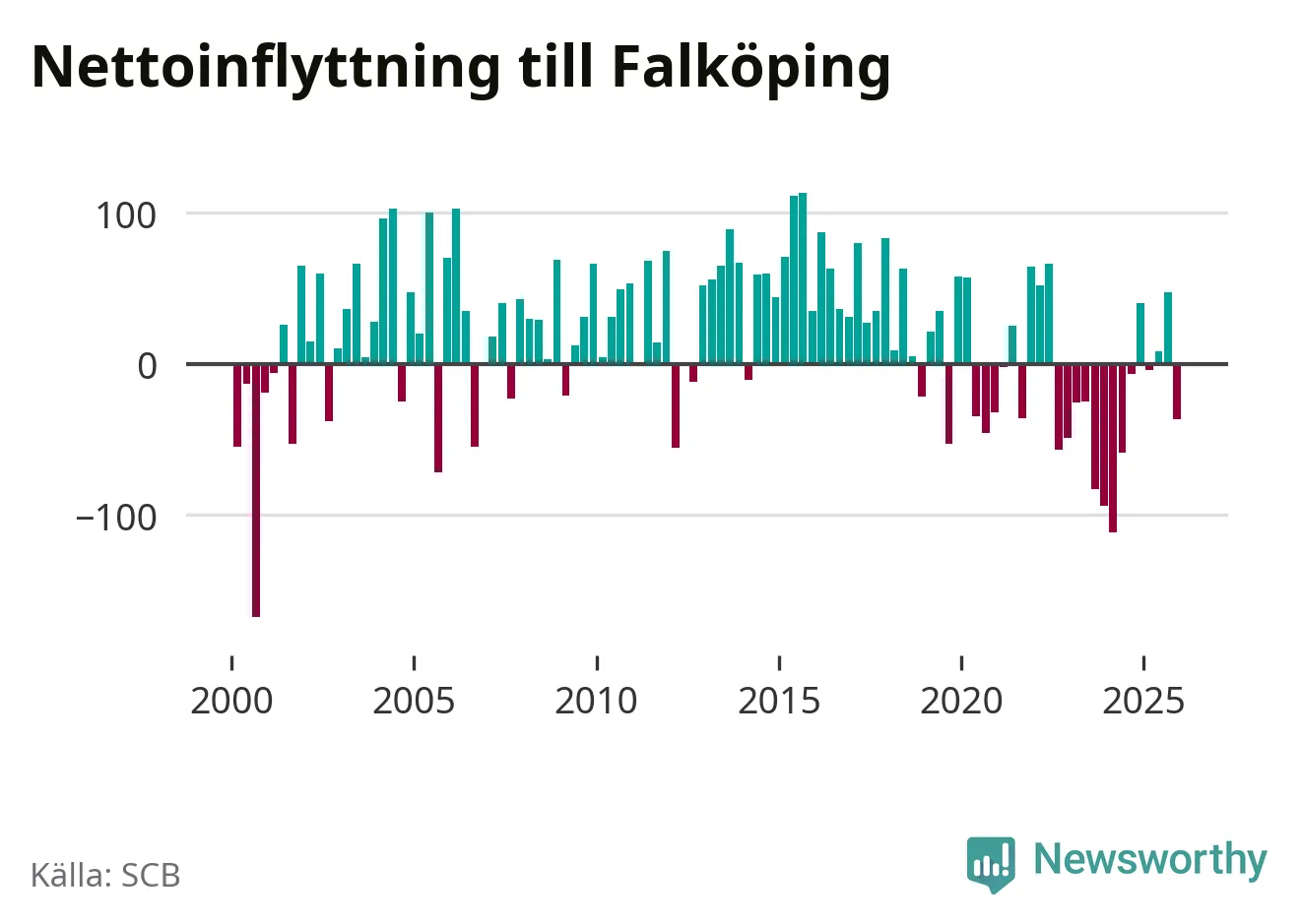 Under fjärde kvartalet 2025 flyttade 325 personer till kommunen medan 362 personer flyttade därifrån. Sedan seklets början har Falköping oftast haft ett positivt flyttnetto.