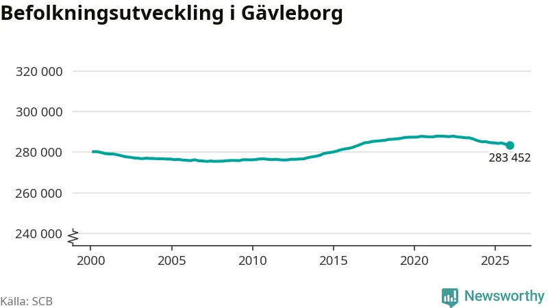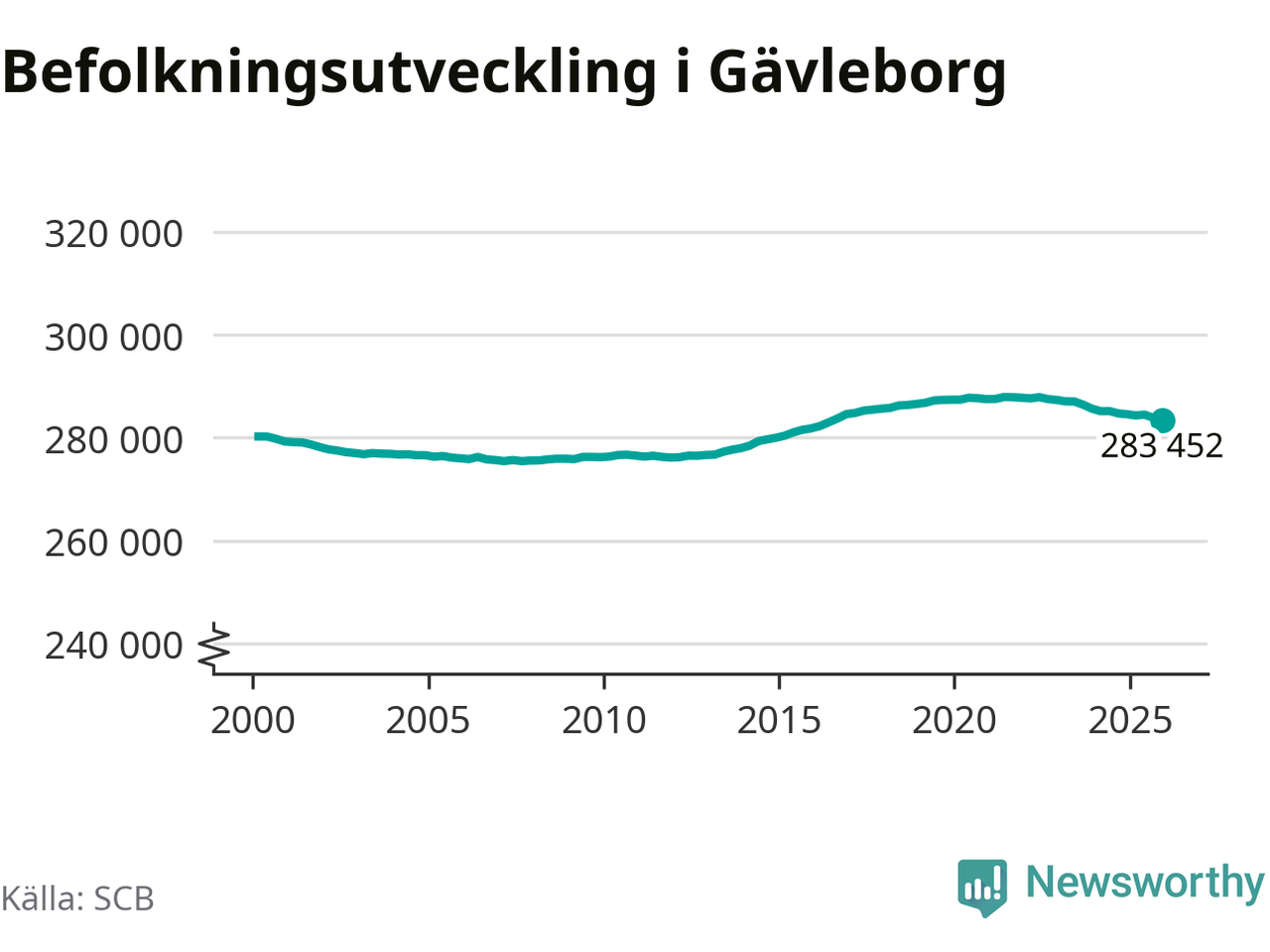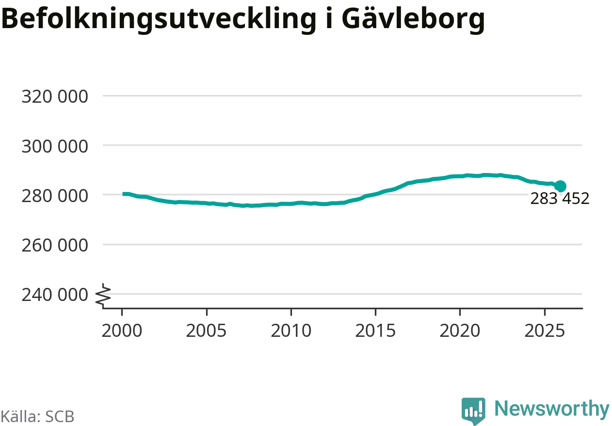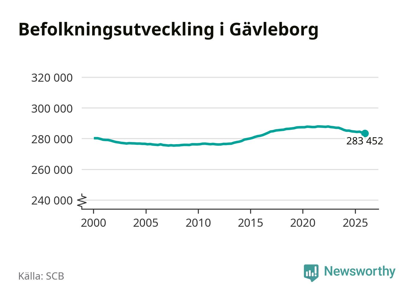 Jämfört med för ett år sedan har befolkningen i Gävleborg minskat med ungefär 1 110 personer. Sedan millennieskiftet har folkmängden ökat med runt 3 220 personer, eller en procent.