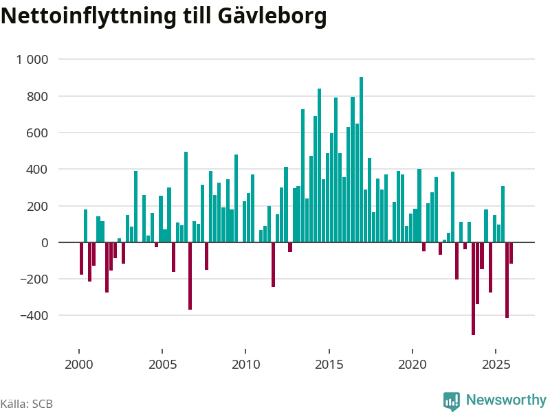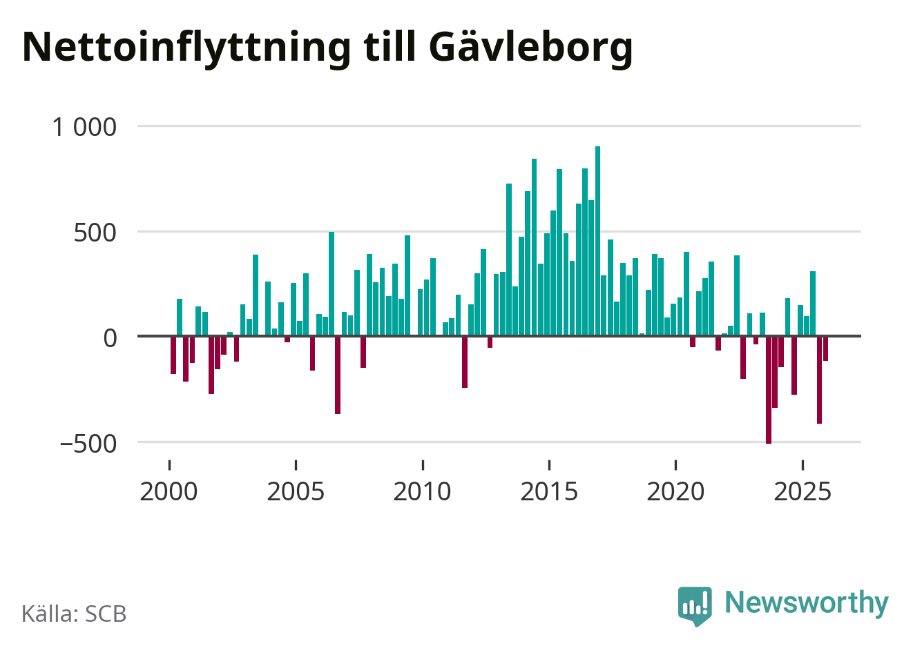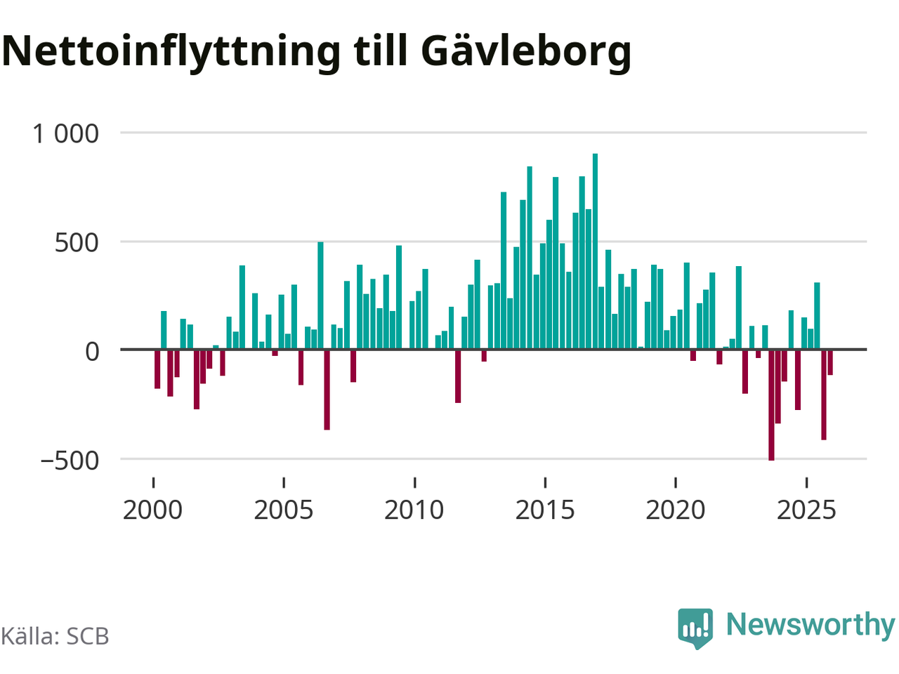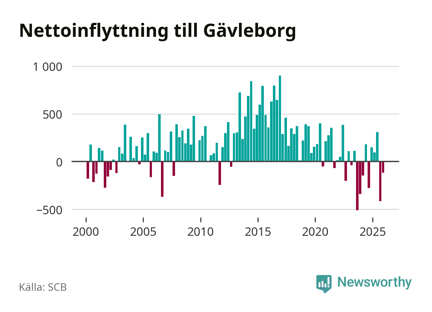 Under fjärde kvartalet 2025 flyttade 1 676 personer till länet medan 1 792 personer flyttade därifrån. Sedan seklets början har Gävleborg oftast haft ett positivt flyttnetto.