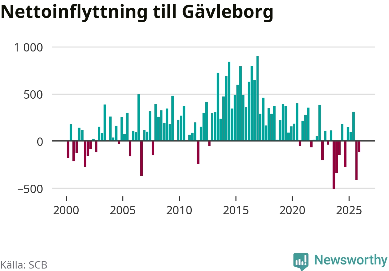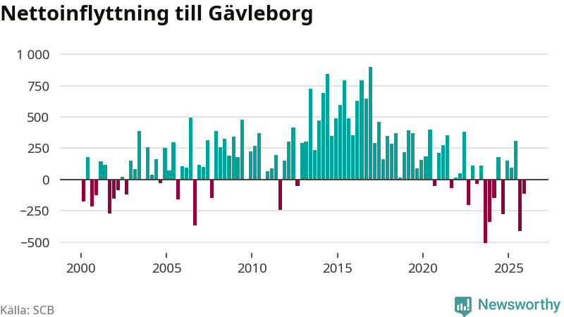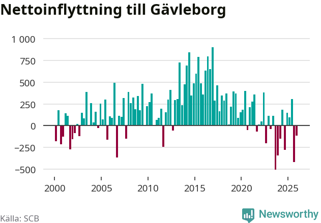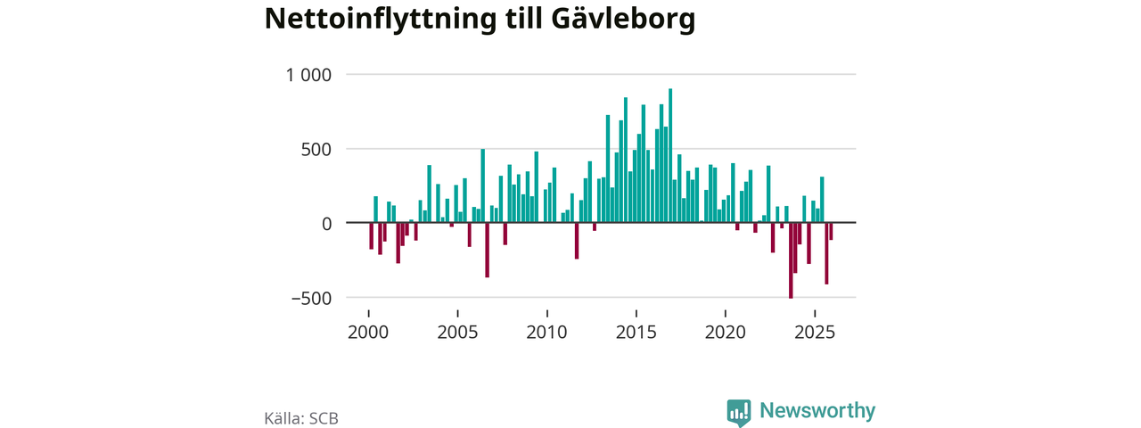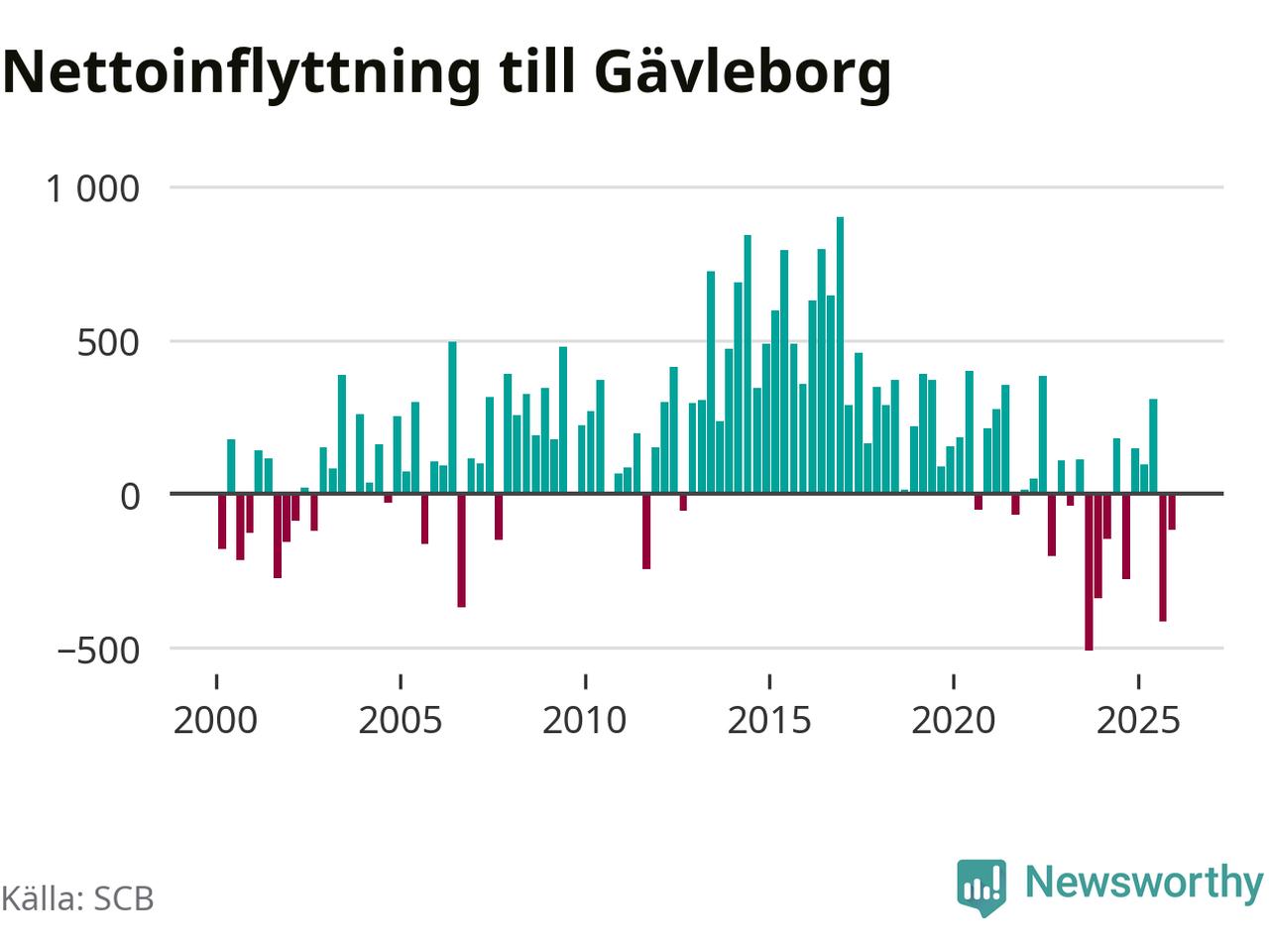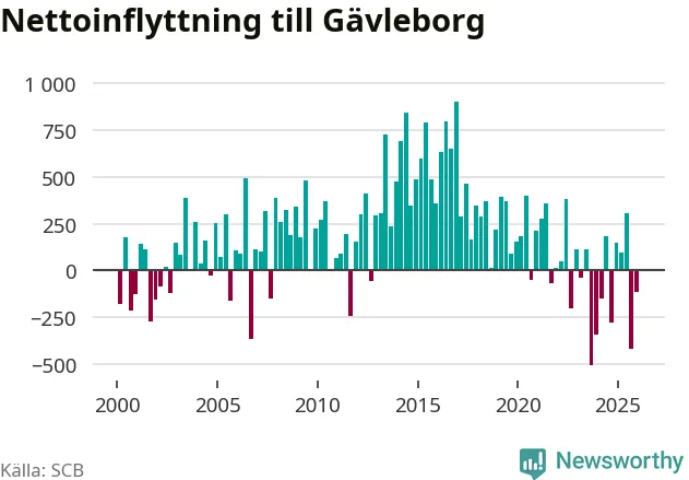 Under fjärde kvartalet 2025 flyttade 1 676 personer till länet medan 1 792 personer flyttade därifrån. Sedan seklets början har Gävleborg oftast haft ett positivt flyttnetto.
