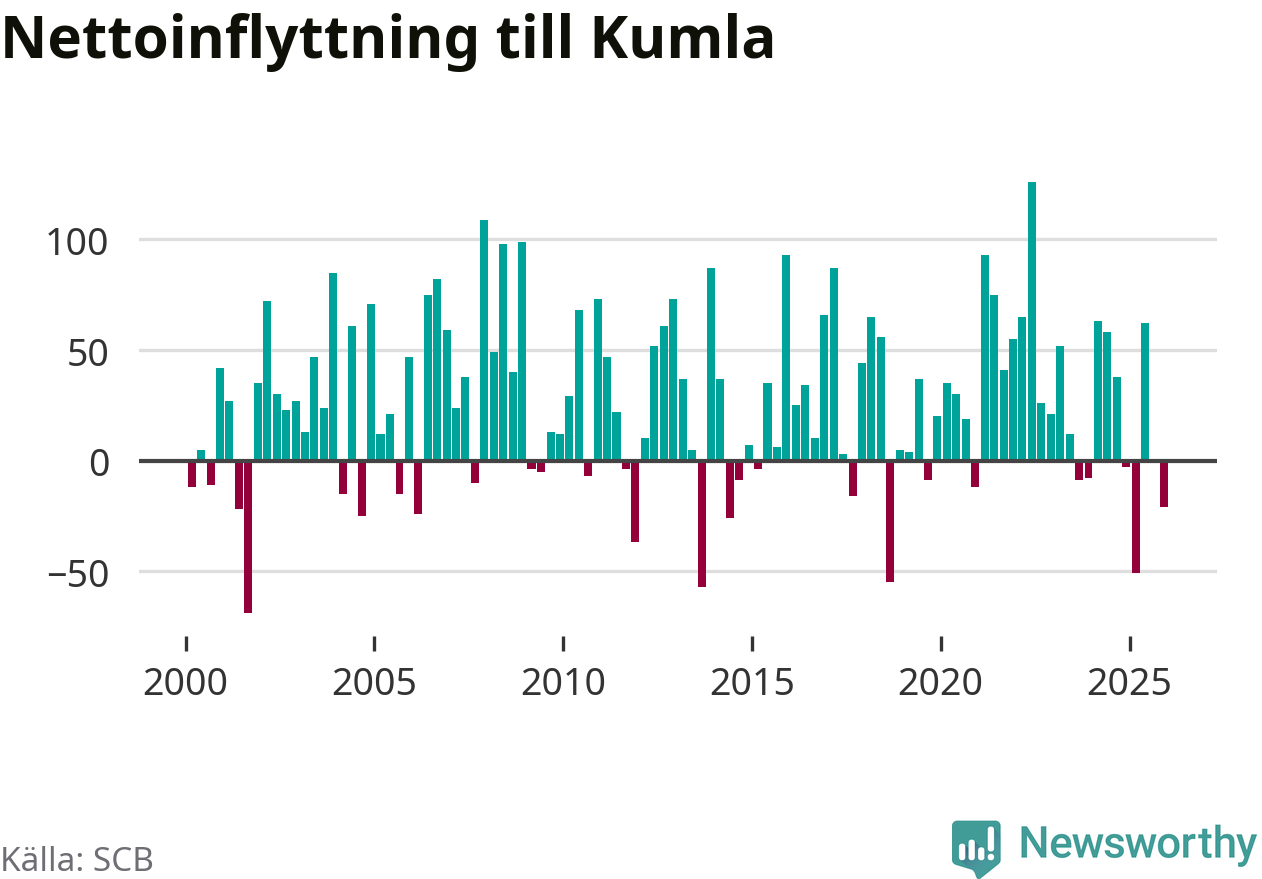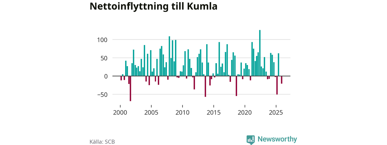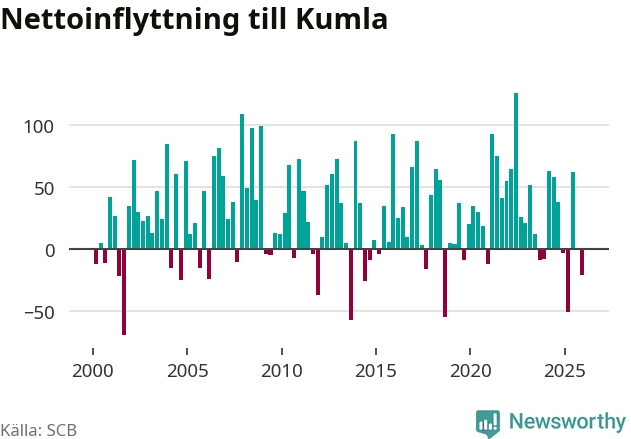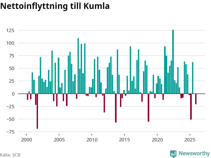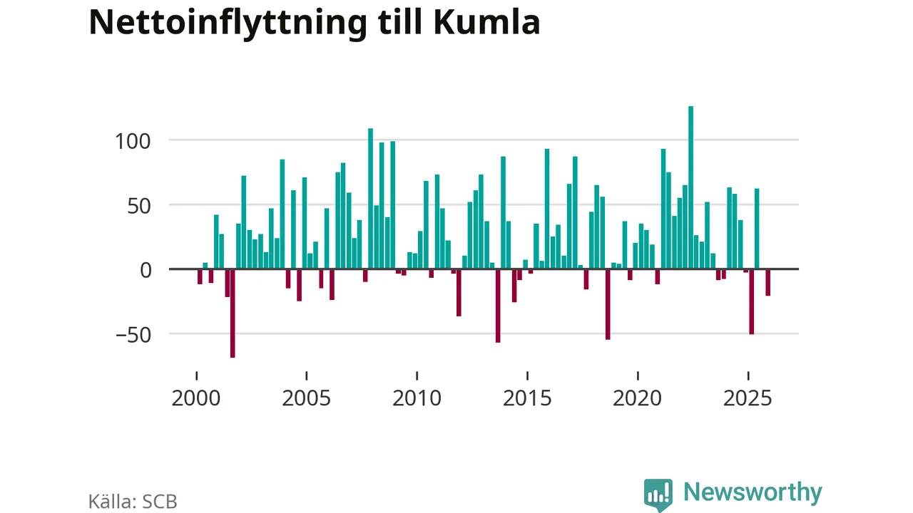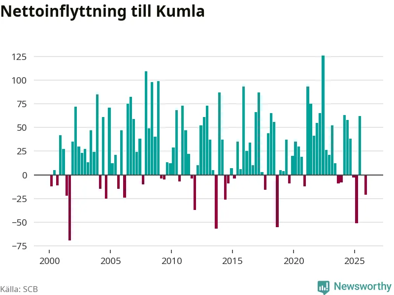 Under fjärde kvartalet 2025 flyttade 261 personer till kommunen medan 282 personer flyttade därifrån. Sedan seklets början har Kumla oftast haft ett positivt flyttnetto.