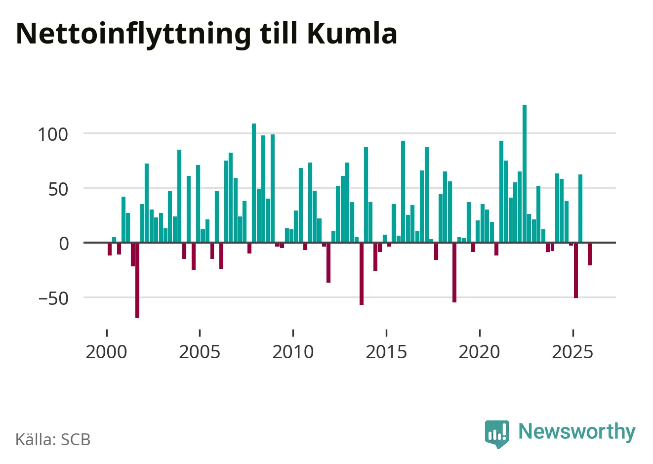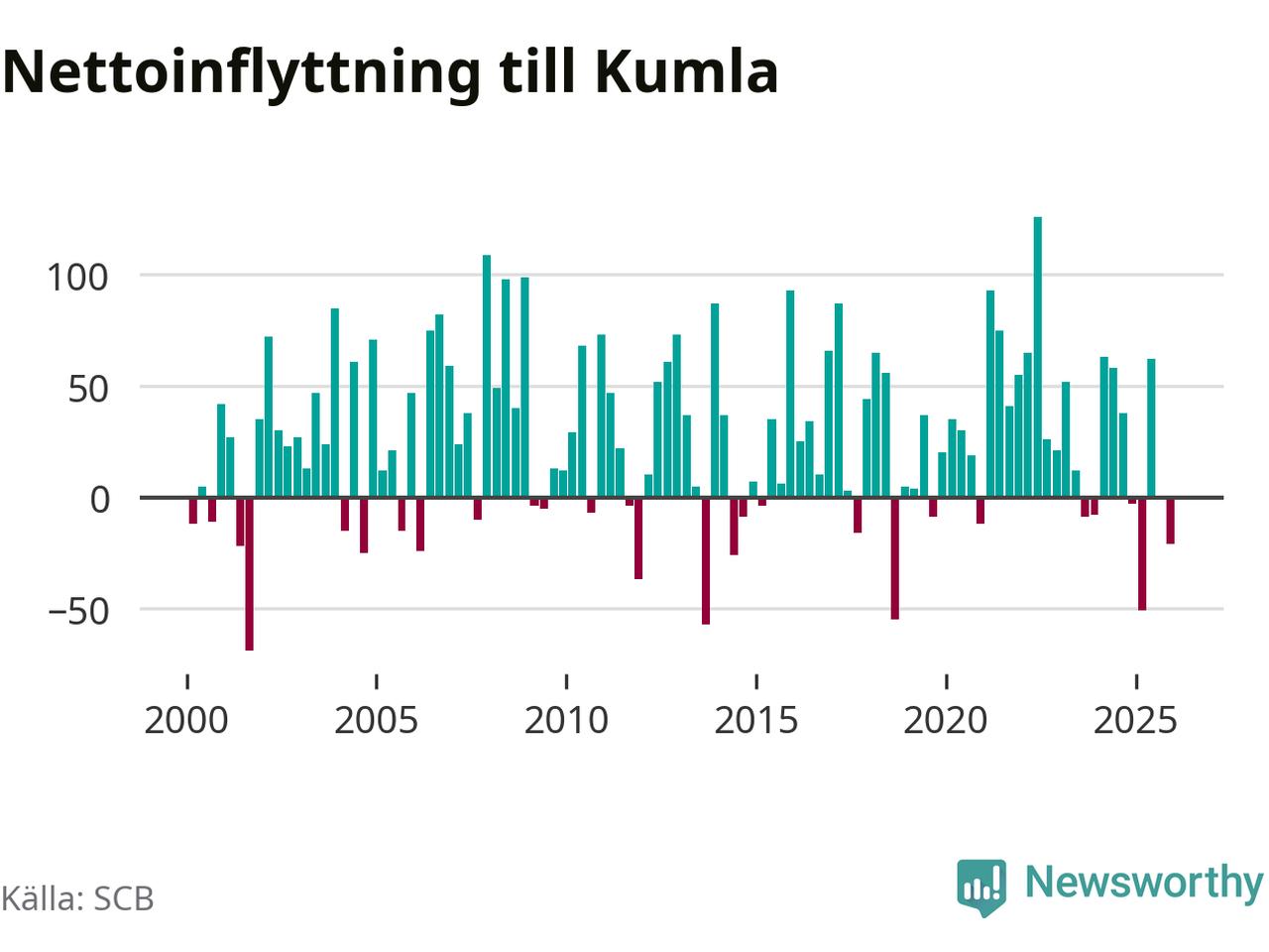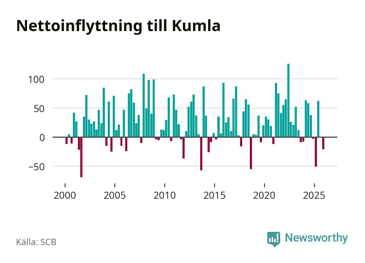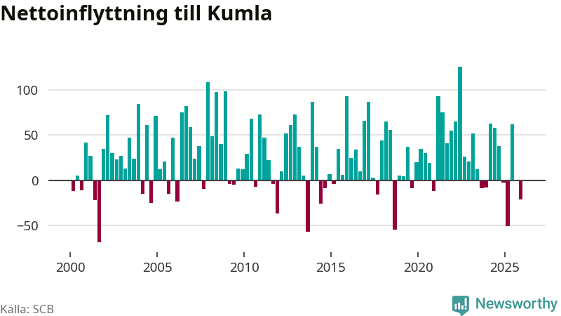 Under fjärde kvartalet 2025 flyttade 261 personer till kommunen medan 282 personer flyttade därifrån. Sedan seklets början har Kumla oftast haft ett positivt flyttnetto.