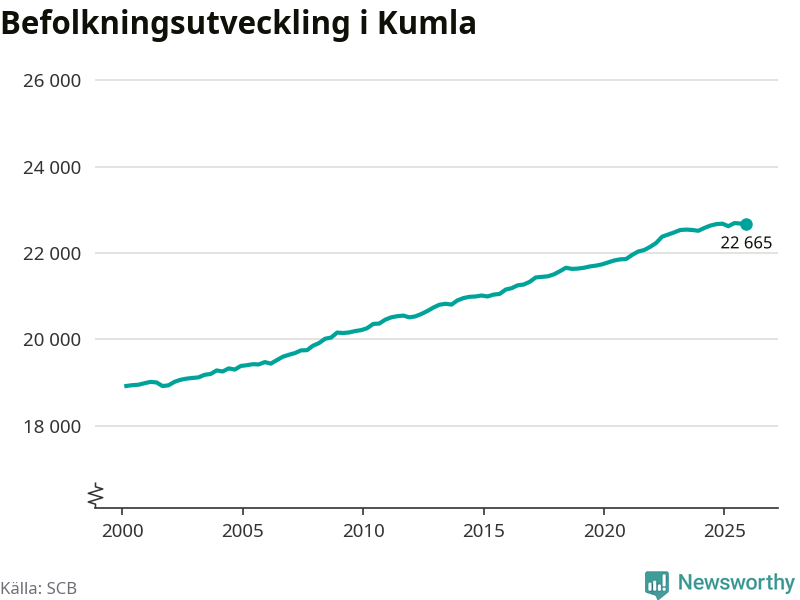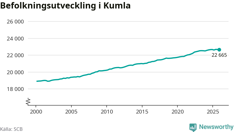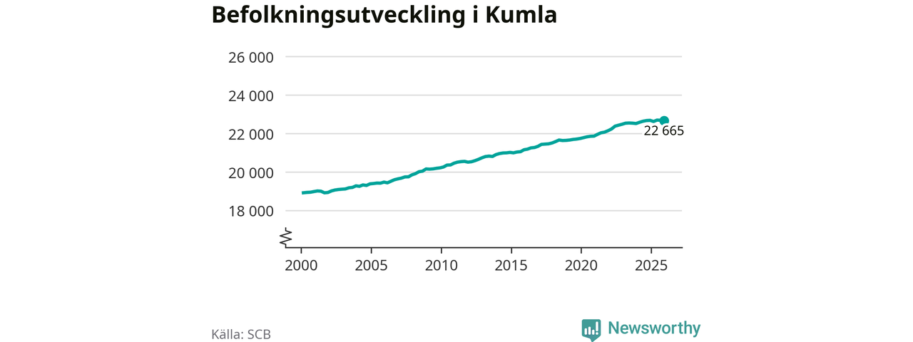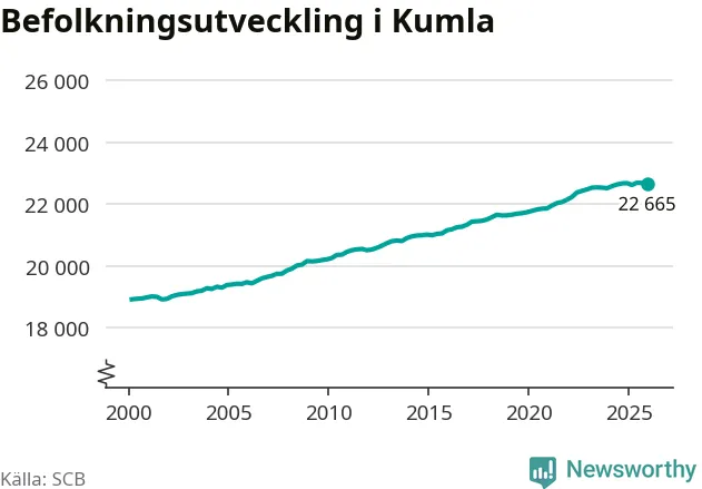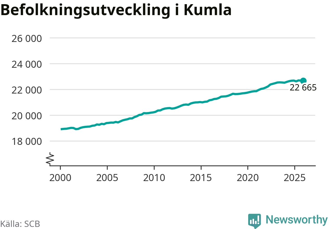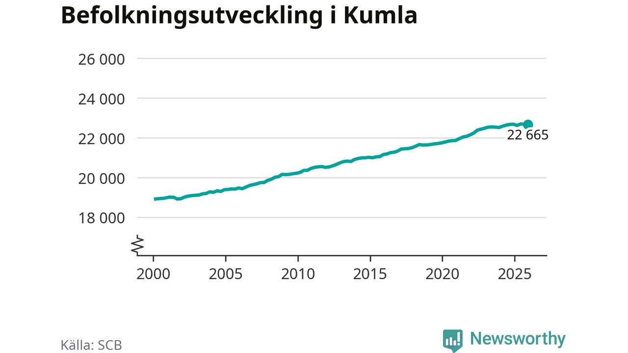 Jämfört med för ett år sedan har befolkningen i Kumla minskat med knappt 20 personer. Sedan millennieskiftet har folkmängden ökat med runt 3 750 personer, eller 20 procent.