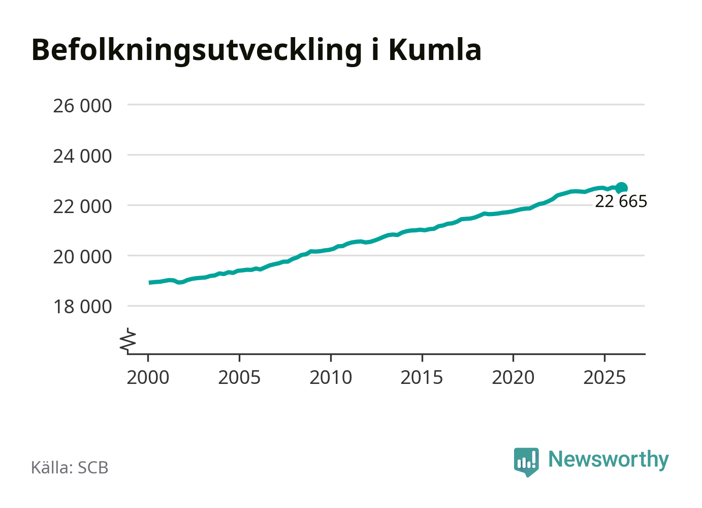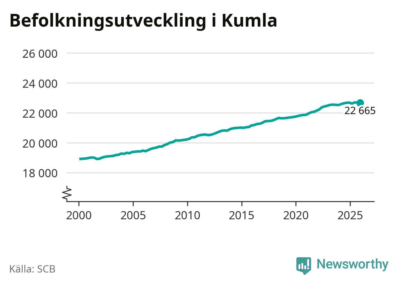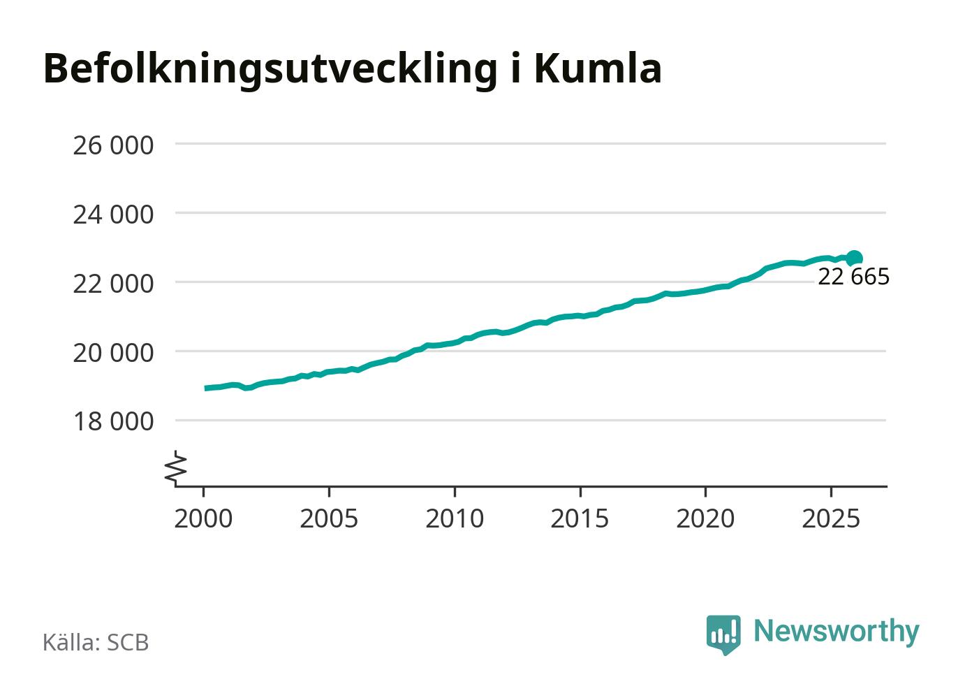 Jämfört med för ett år sedan har befolkningen i Kumla minskat med knappt 20 personer. Sedan millennieskiftet har folkmängden ökat med runt 3 750 personer, eller 20 procent.