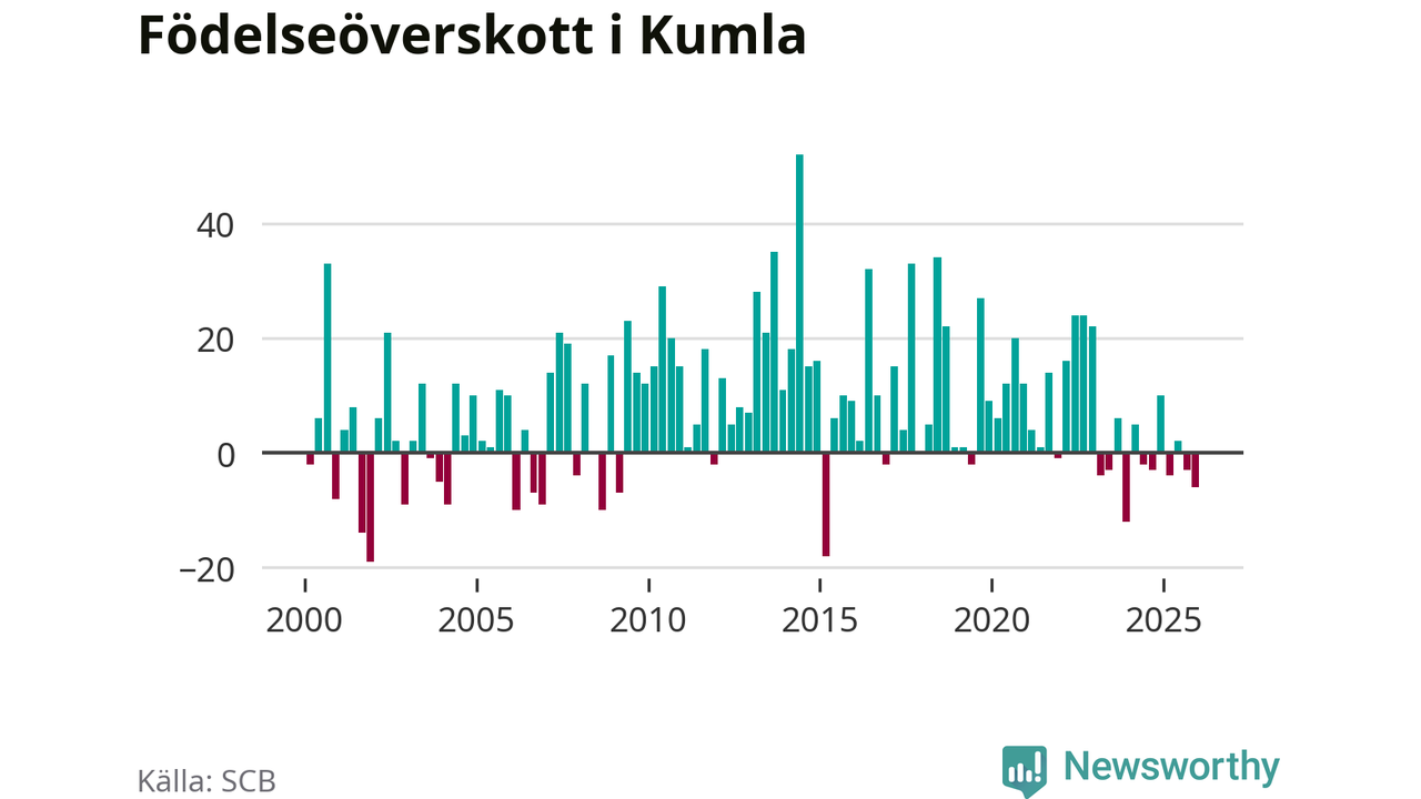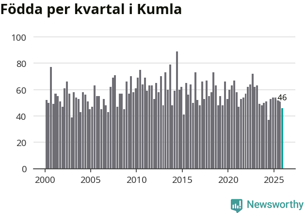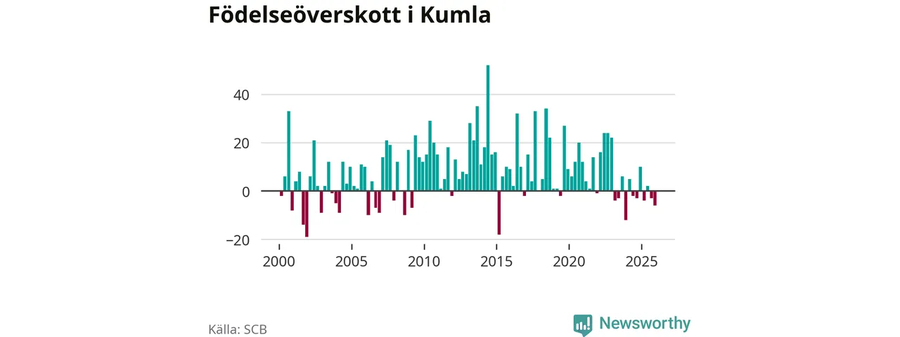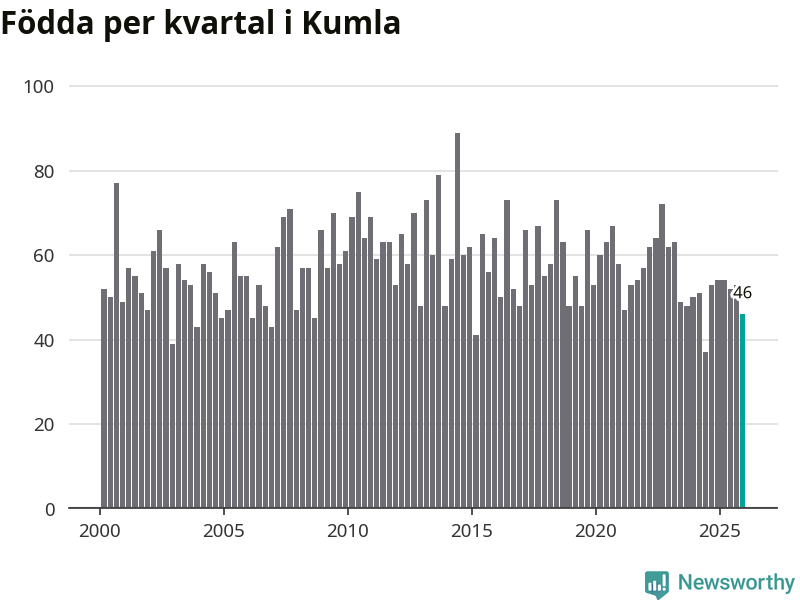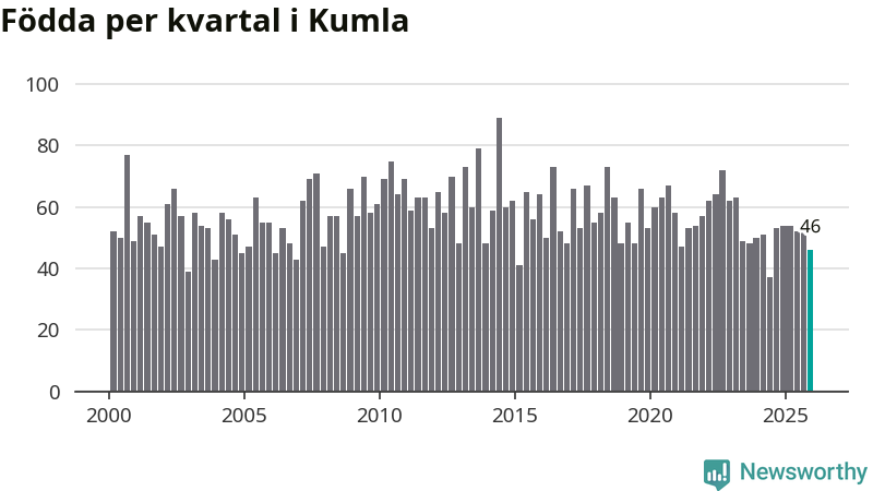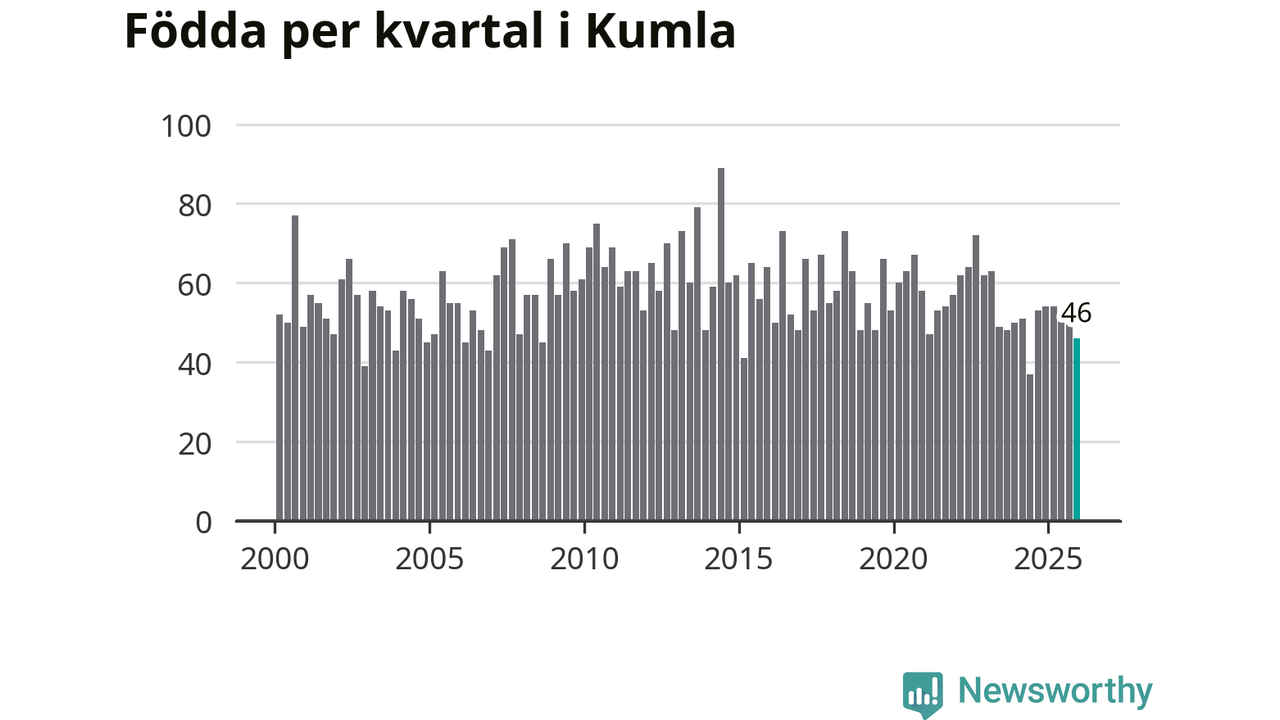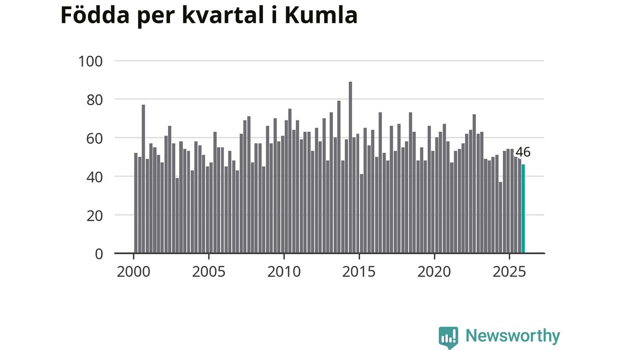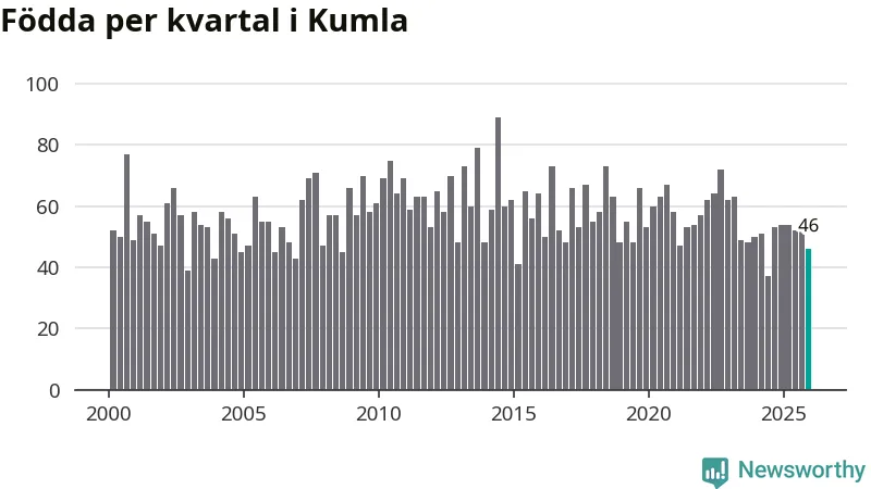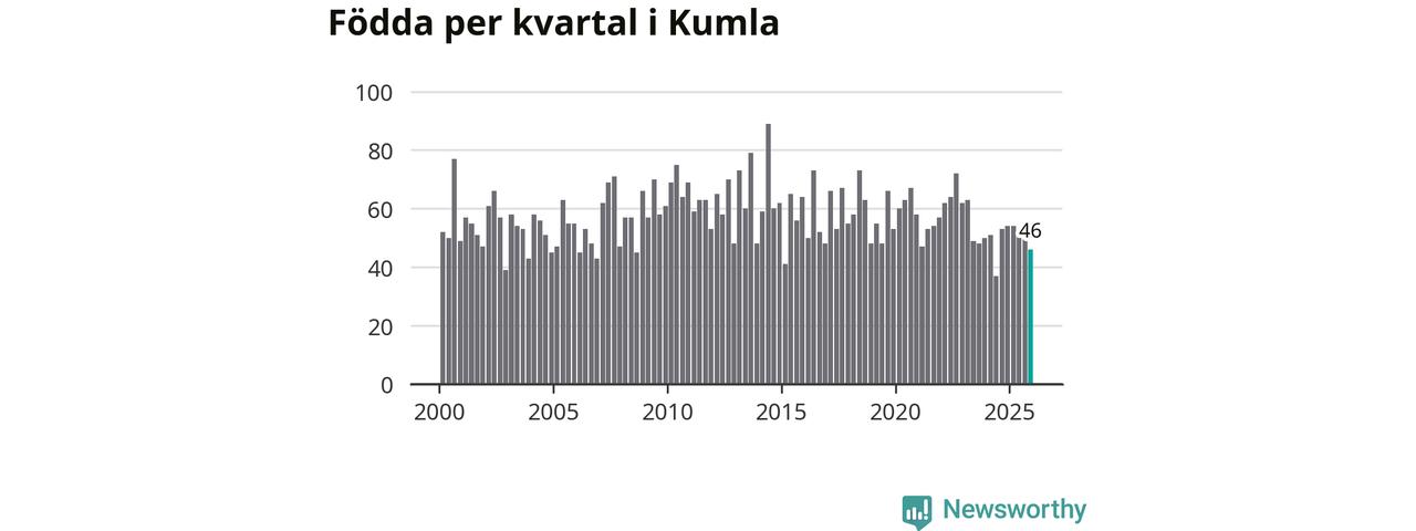 Enligt SCB:s siffror föddes 46 barn i Kumla under det senaste kvartalet. Samtidigt avled 52 personer. Skillnaden mellan antal födda och döda är så liten att det inte går att säga om det beror på något annat än SCB:s röjandeskydd. Kommunen har oftast haft positivt födelsenetto tidigare.