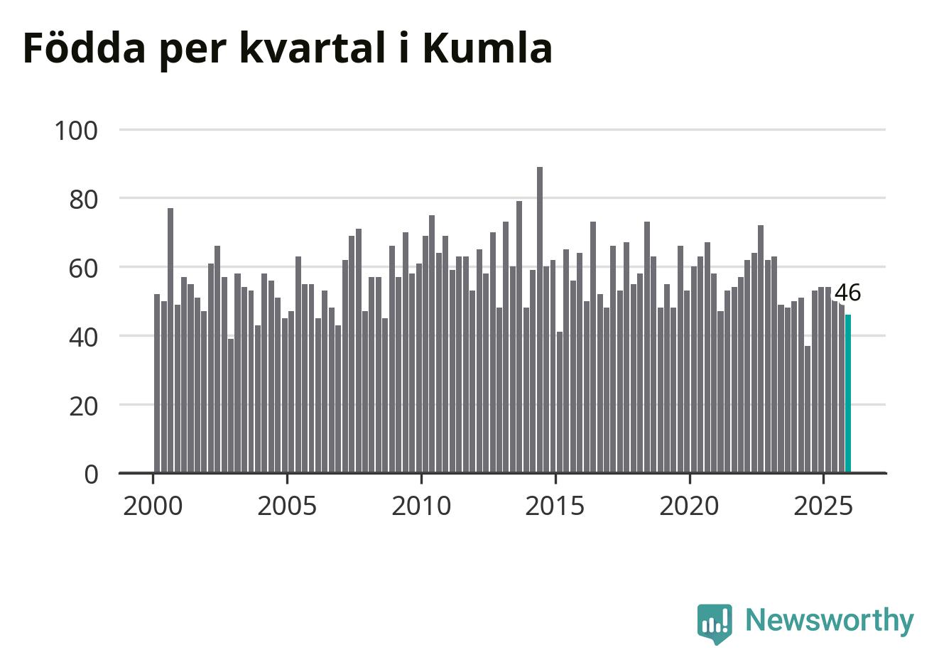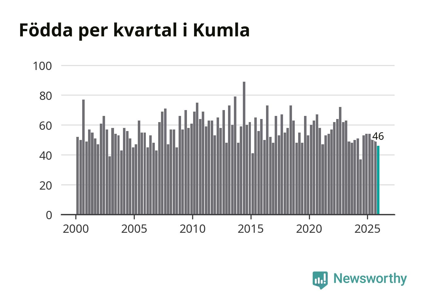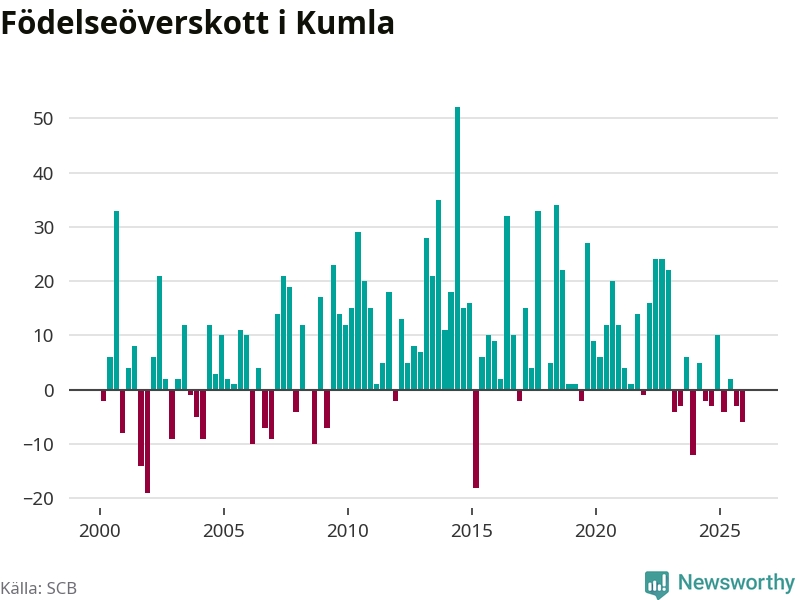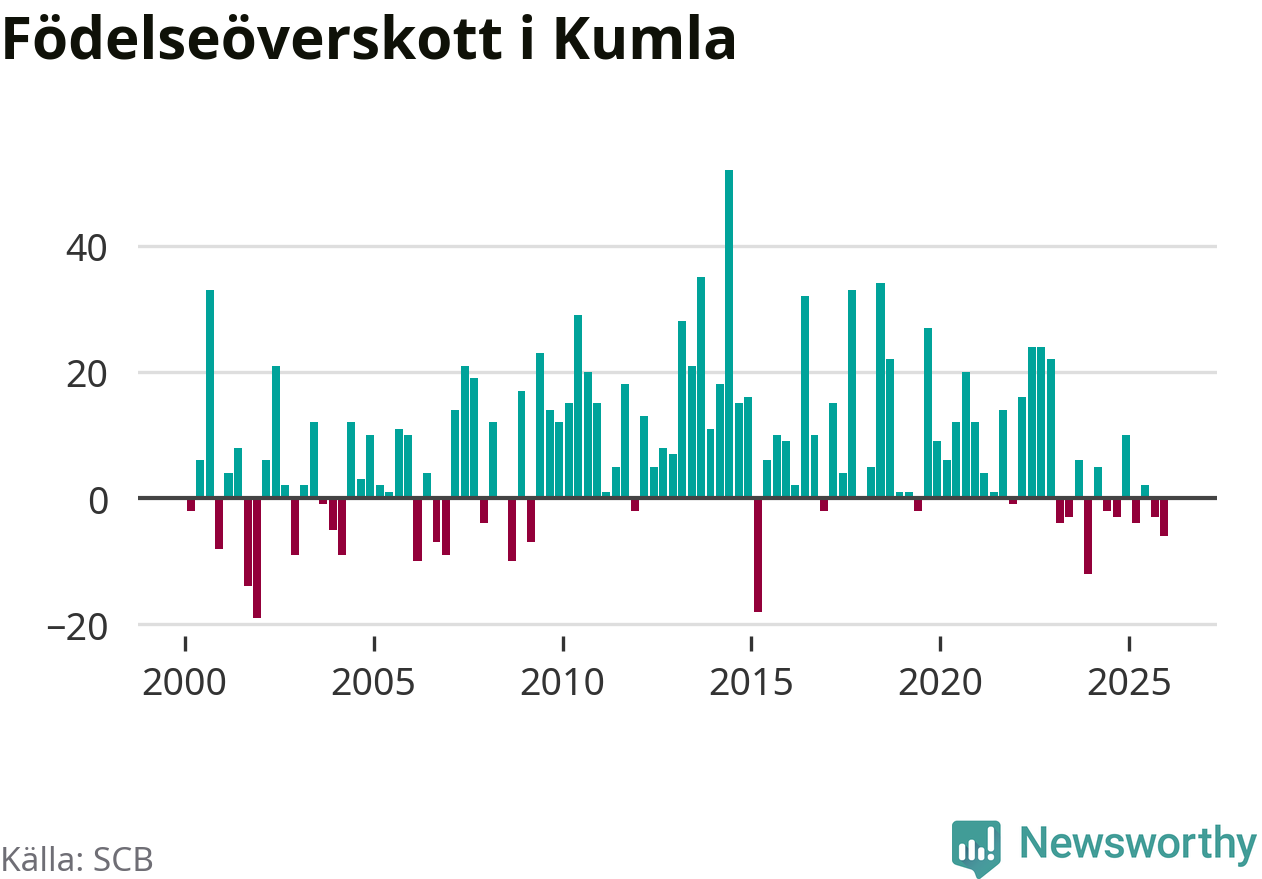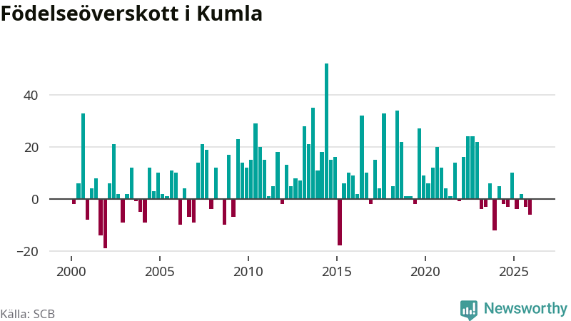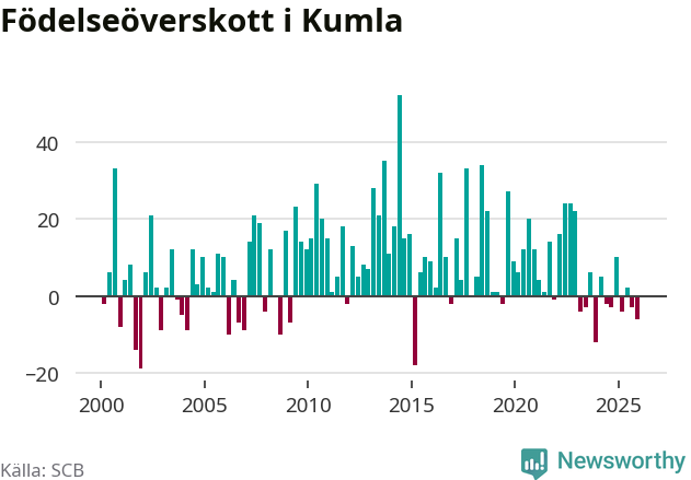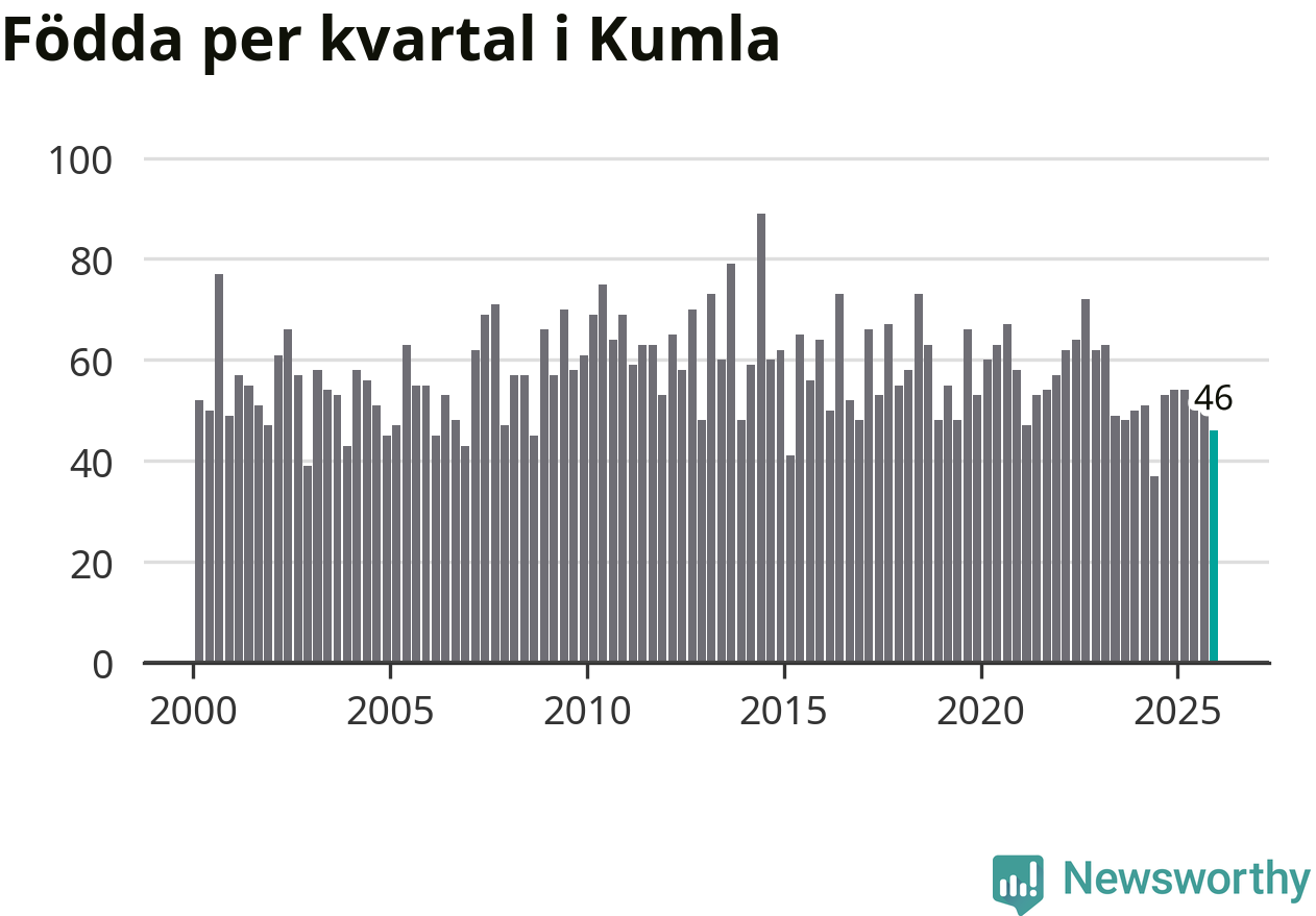 Enligt SCB:s siffror föddes 46 barn i Kumla under det senaste kvartalet. Samtidigt avled 52 personer. Skillnaden mellan antal födda och döda är så liten att det inte går att säga om det beror på något annat än SCB:s röjandeskydd. Kommunen har oftast haft positivt födelsenetto tidigare.