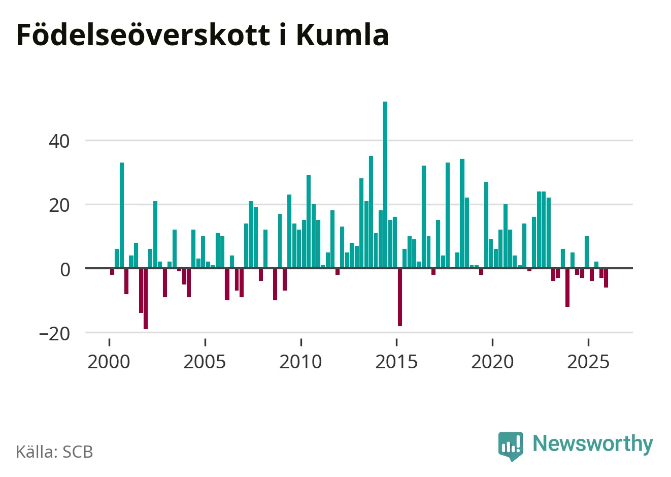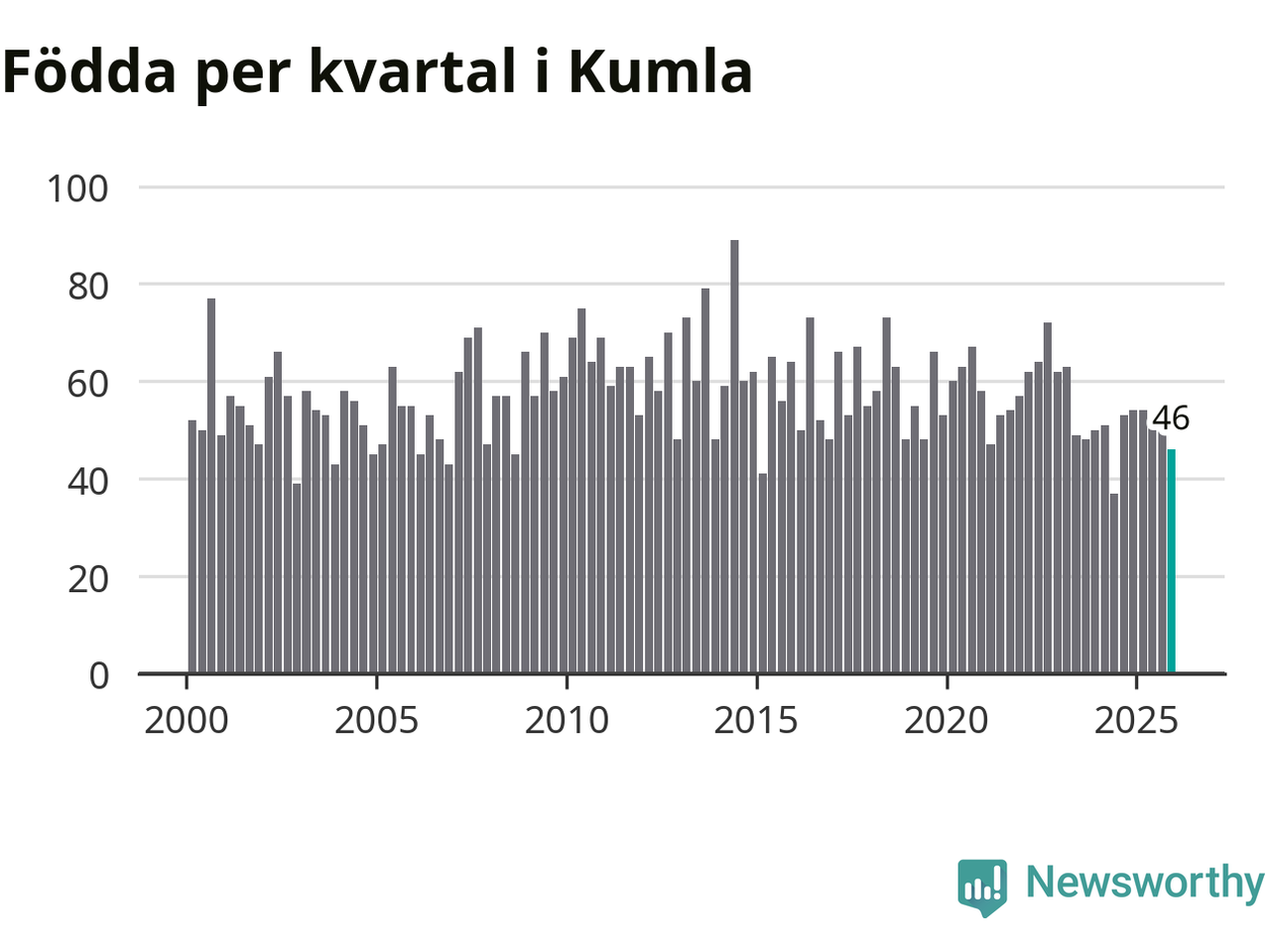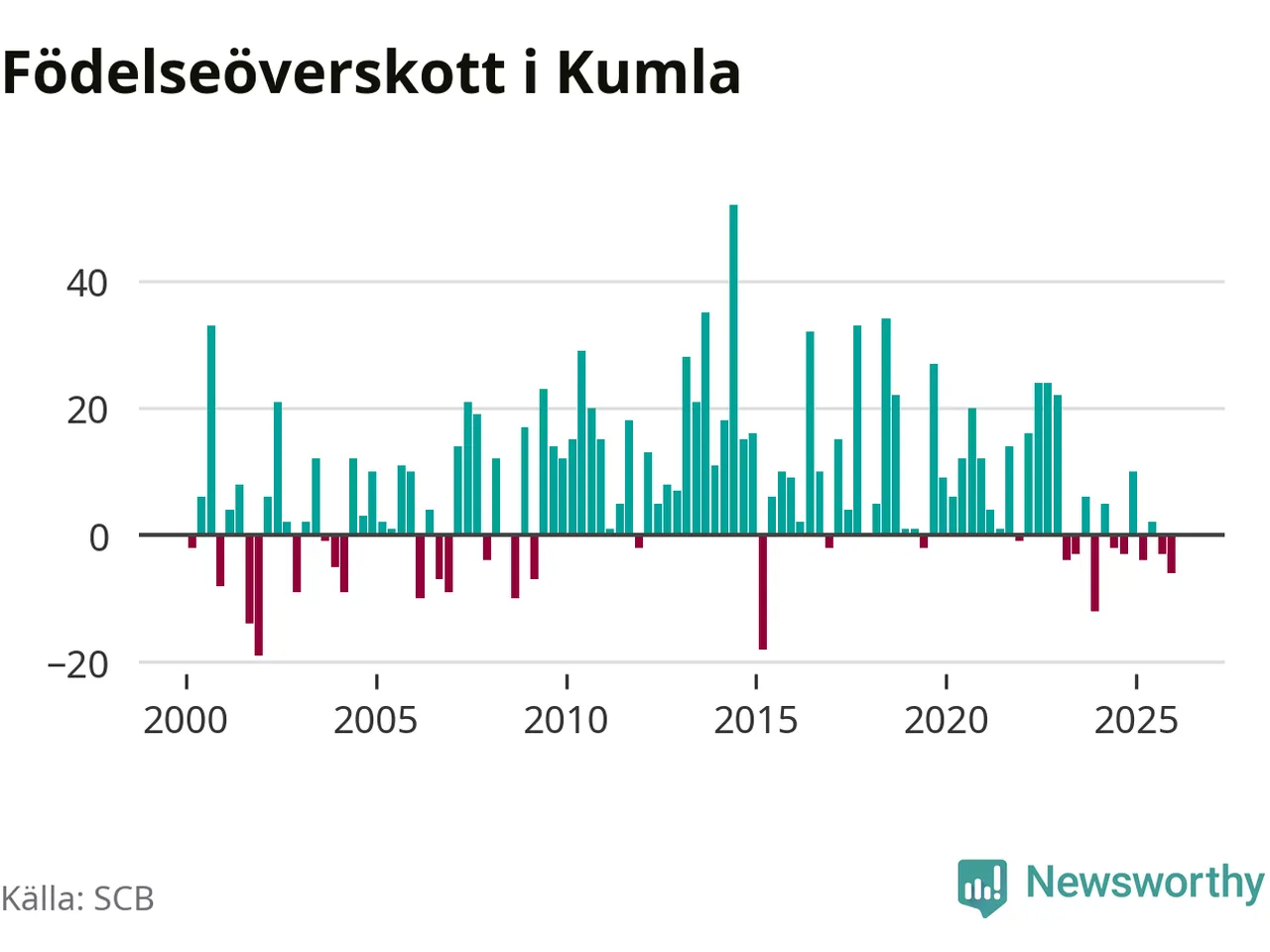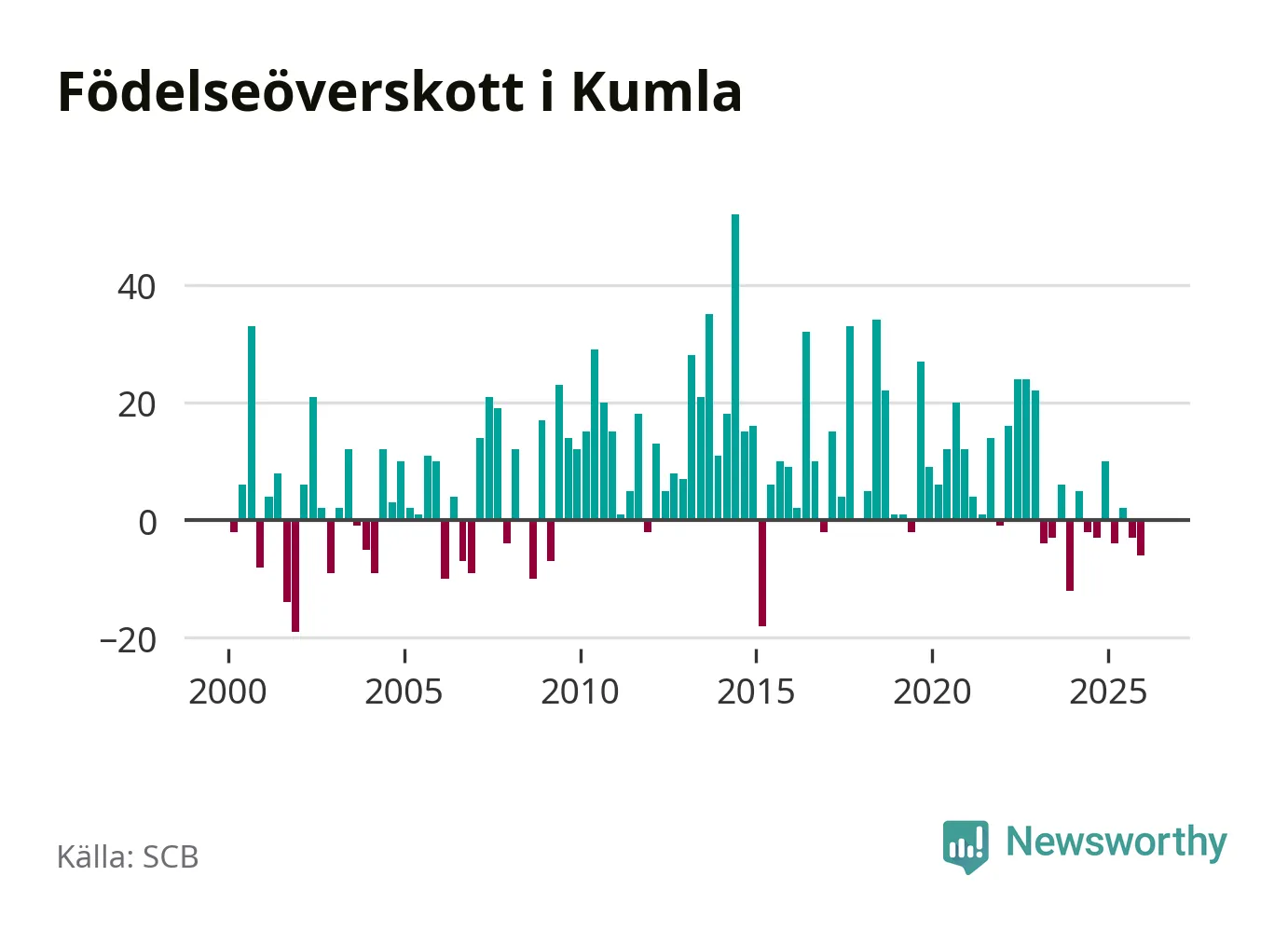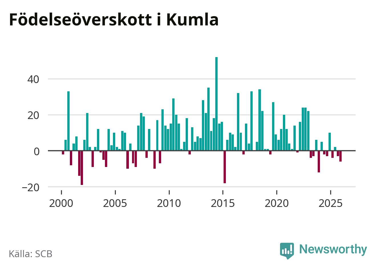 Enligt SCB:s siffror föddes 46 barn i Kumla under det senaste kvartalet. Samtidigt avled 52 personer. Skillnaden mellan antal födda och döda är så liten att det inte går att säga om det beror på något annat än SCB:s röjandeskydd. Kommunen har oftast haft positivt födelsenetto tidigare.