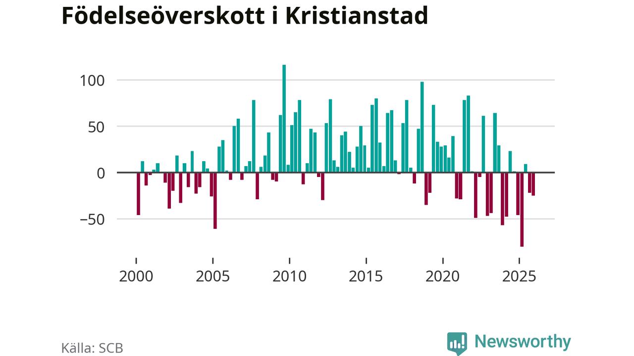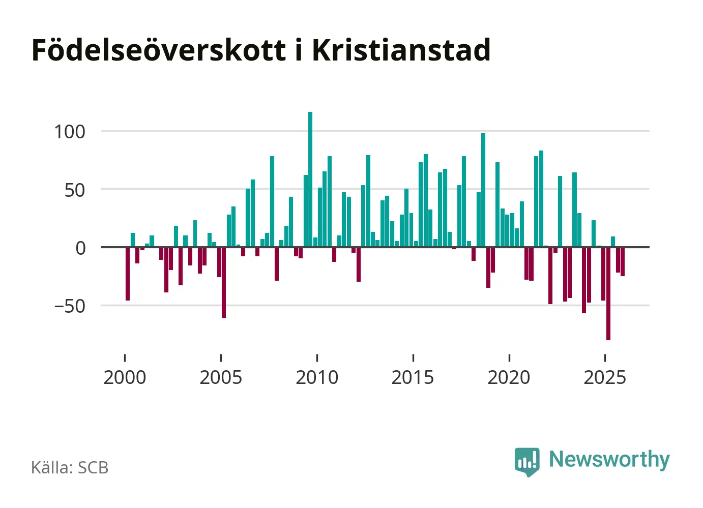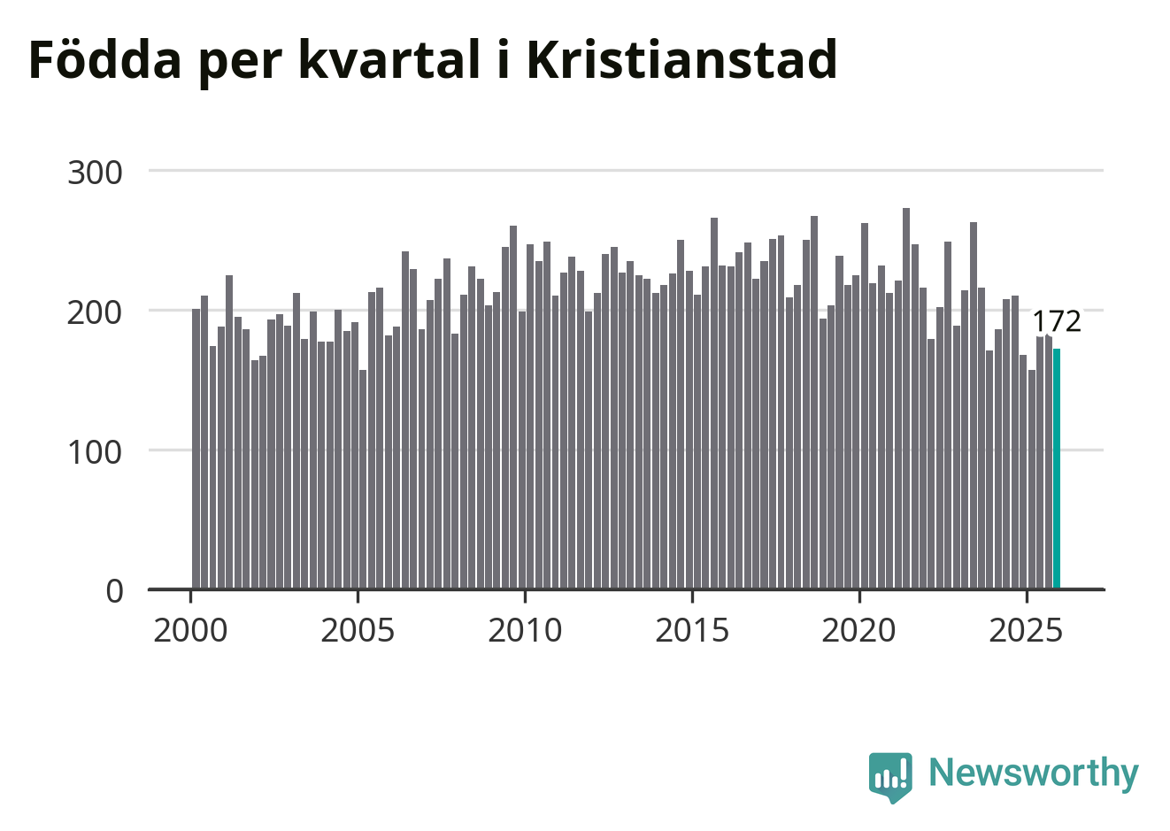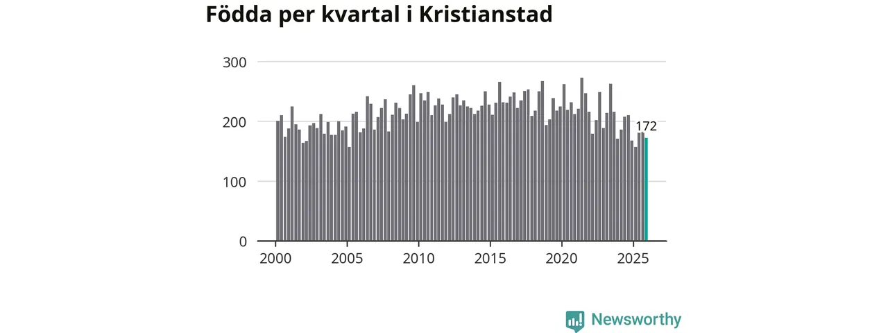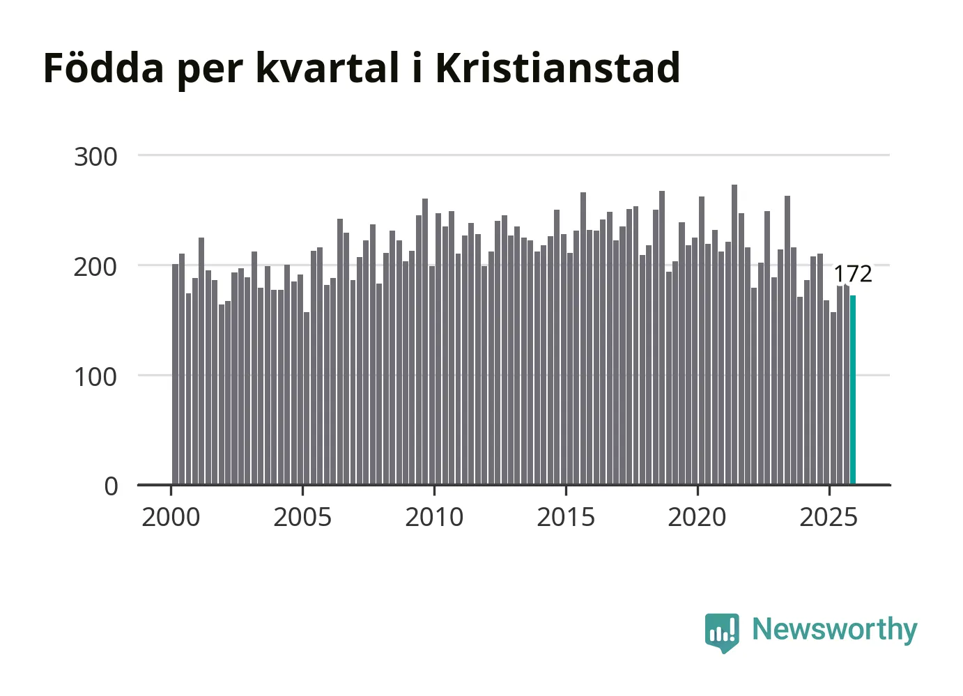 Enligt SCB:s siffror föddes 172 barn i Kristianstad under det senaste kvartalet. Samtidigt avled 197 personer. Kristianstad hade alltså ett negativt födelsenetto under fjärde kvartalet. Historiskt har dock födelsenettot oftast varit positivt.