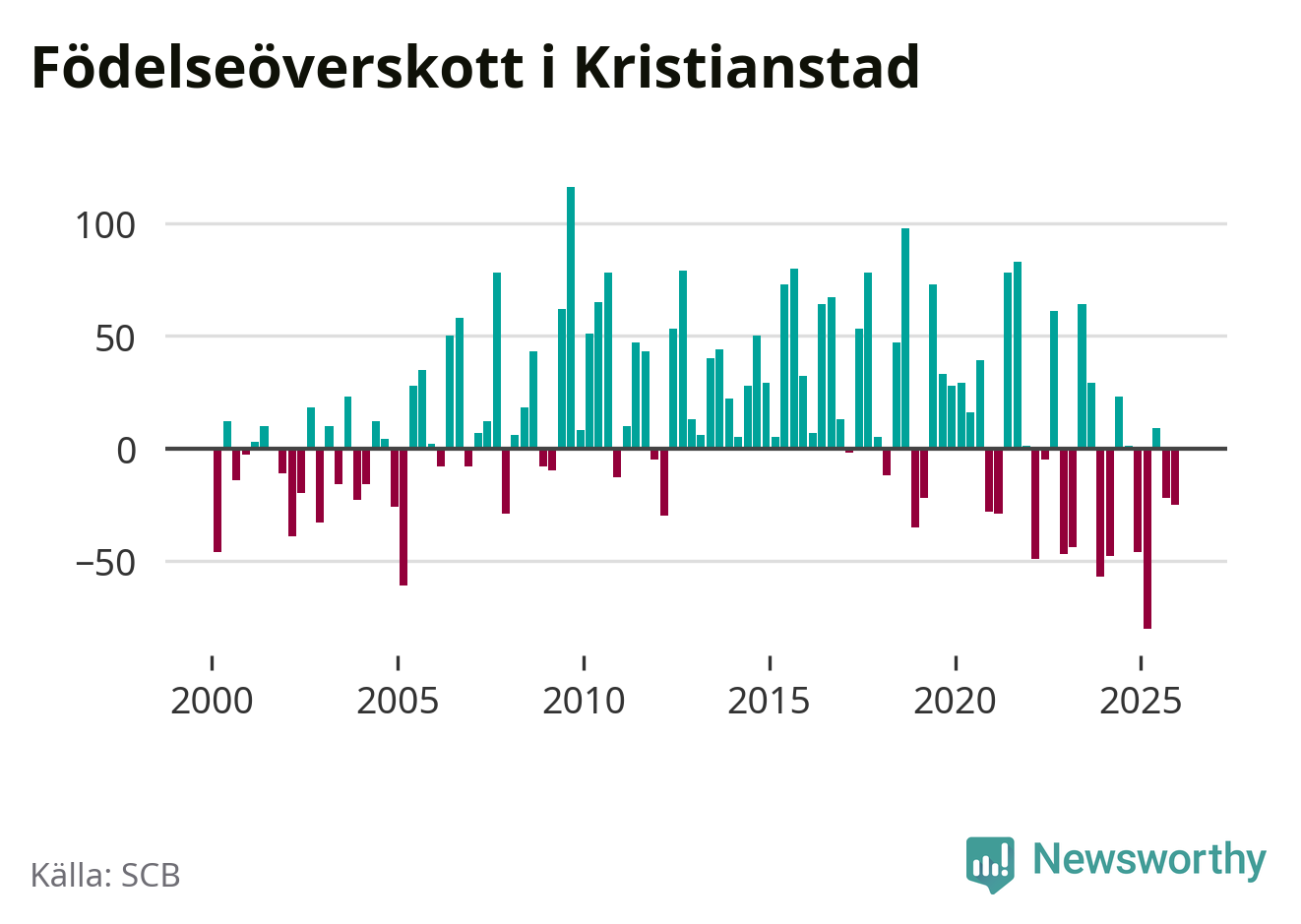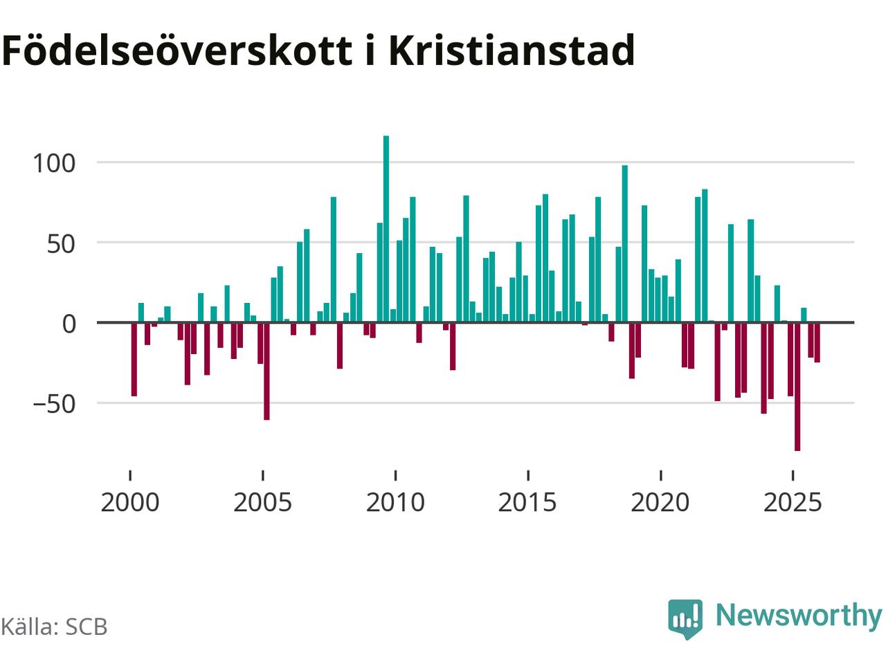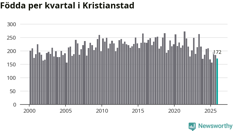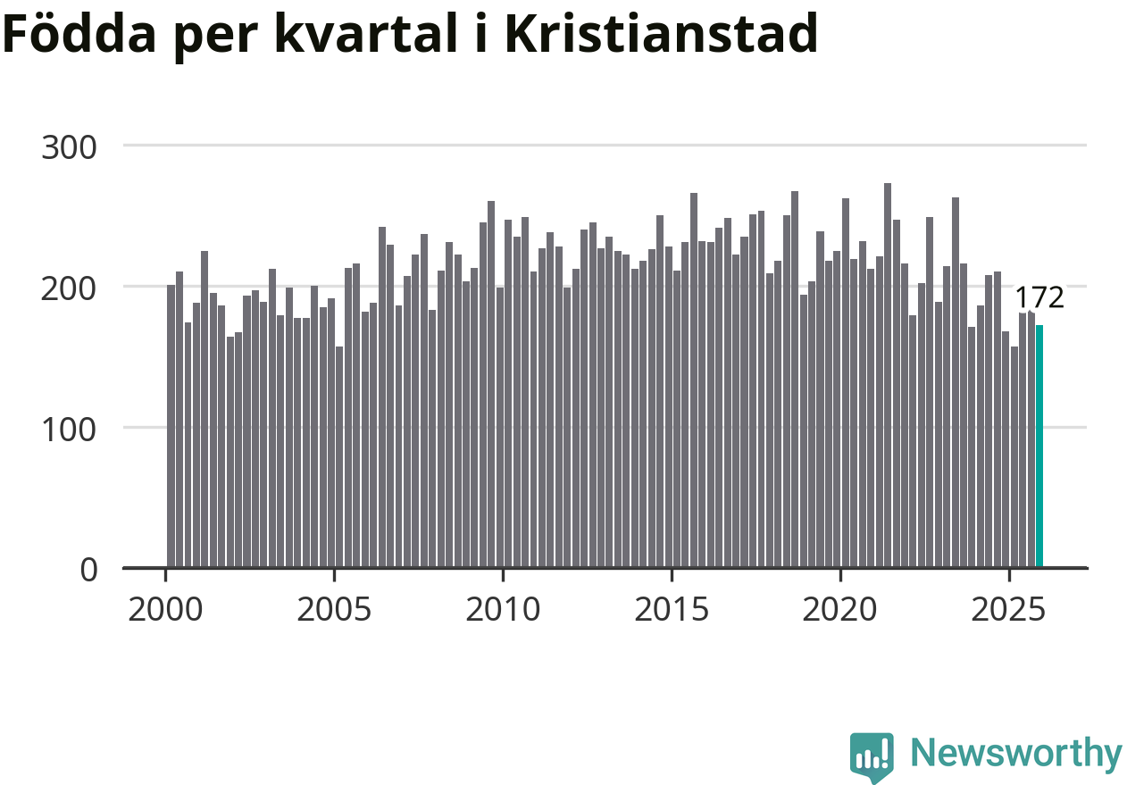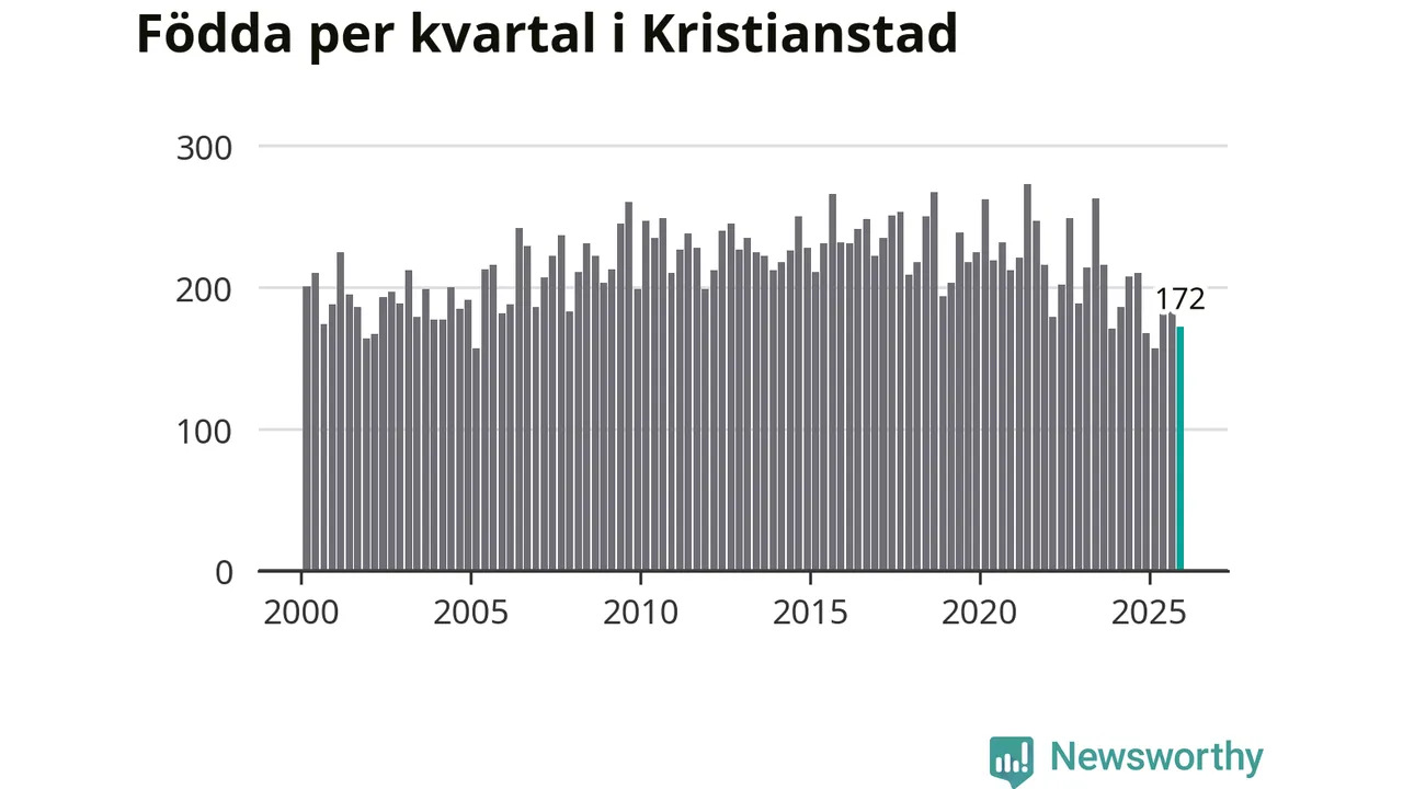 Enligt SCB:s siffror föddes 172 barn i Kristianstad under det senaste kvartalet. Samtidigt avled 197 personer. Kristianstad hade alltså ett negativt födelsenetto under fjärde kvartalet. Historiskt har dock födelsenettot oftast varit positivt.