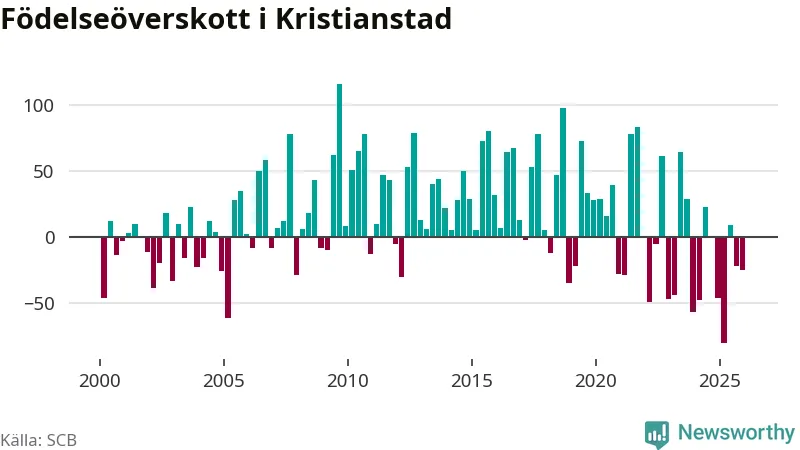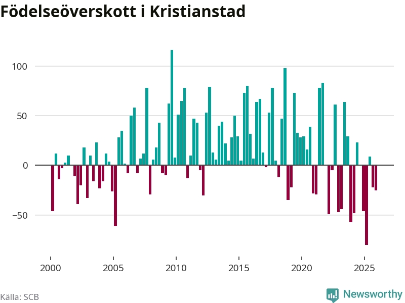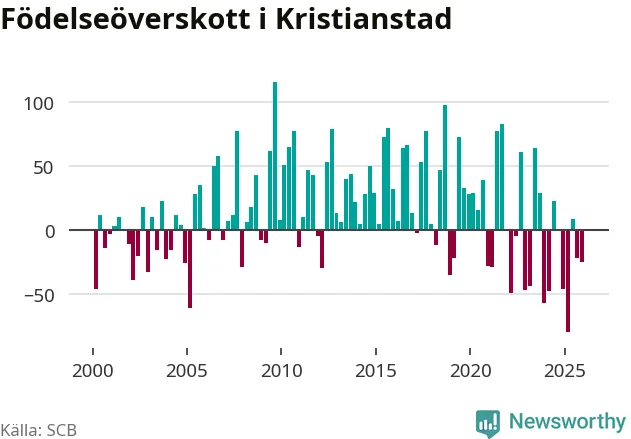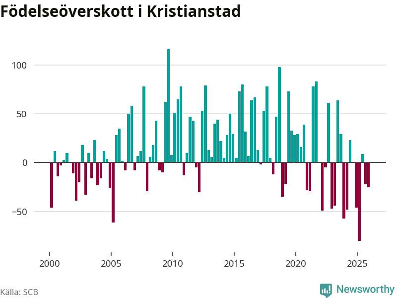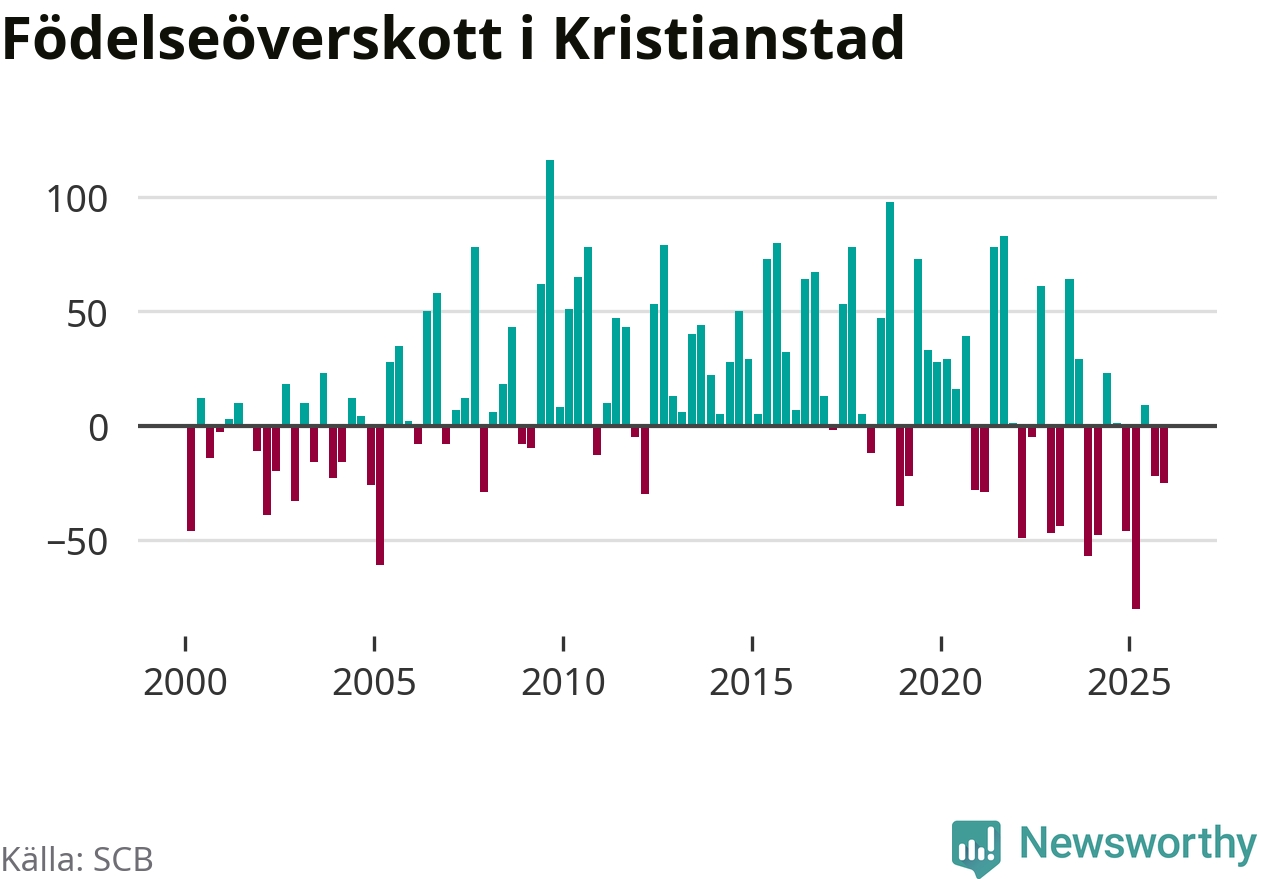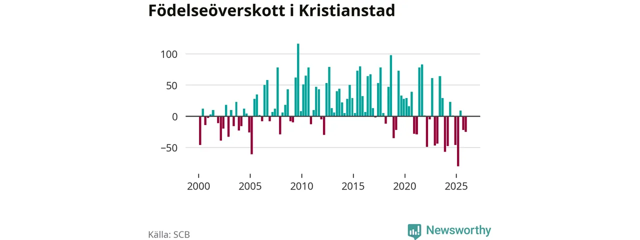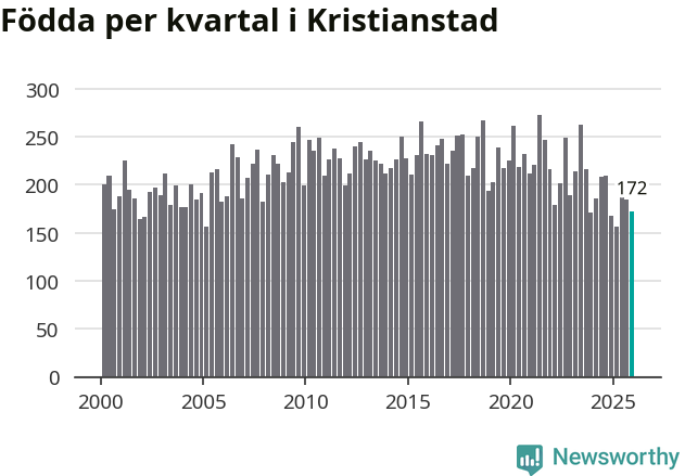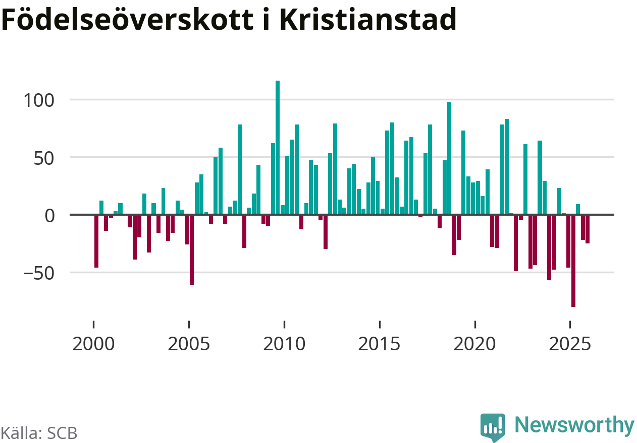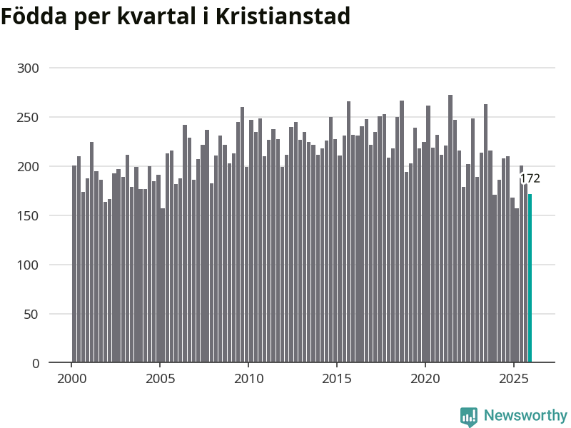 Enligt SCB:s siffror föddes 172 barn i Kristianstad under det senaste kvartalet. Samtidigt avled 197 personer. Kristianstad hade alltså ett negativt födelsenetto under fjärde kvartalet. Historiskt har dock födelsenettot oftast varit positivt.