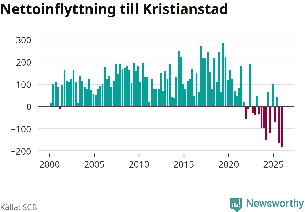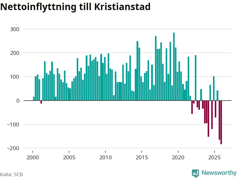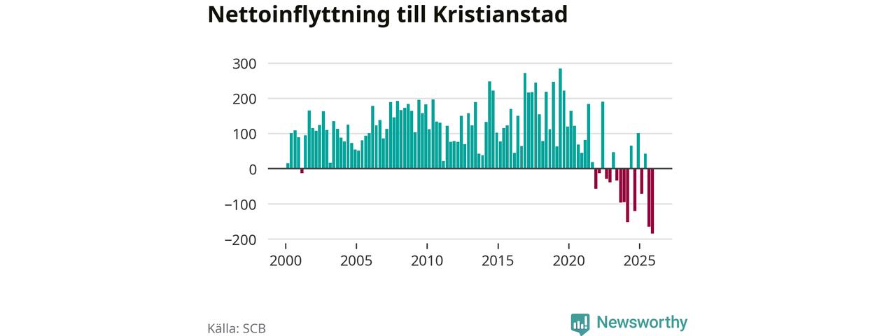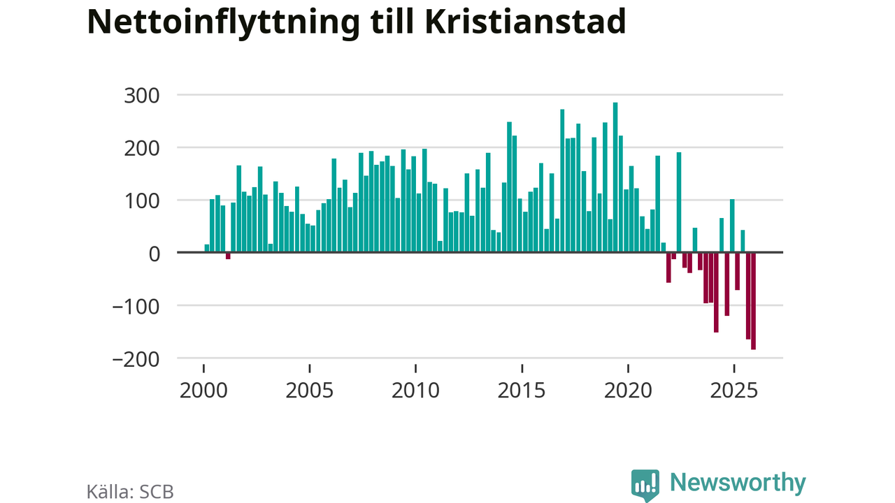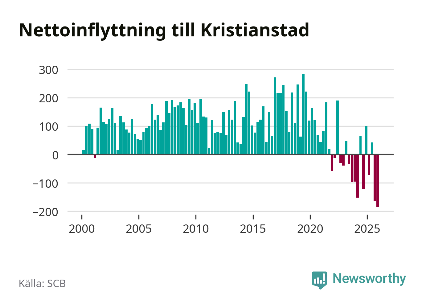 Under fjärde kvartalet 2025 flyttade 775 personer till kommunen medan 959 personer flyttade därifrån. Det ger den största nettoutflyttningen under ett kvartal sedan åtminstone år 2000. Sedan seklets början har Kristianstad oftast haft ett positivt flyttnetto.