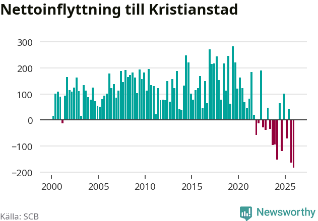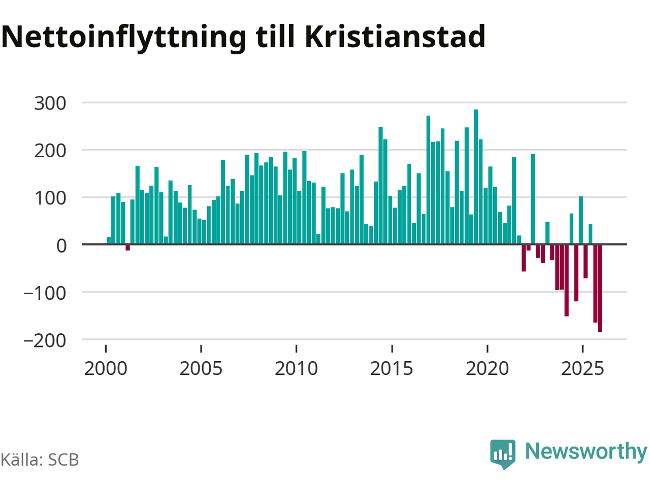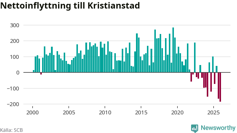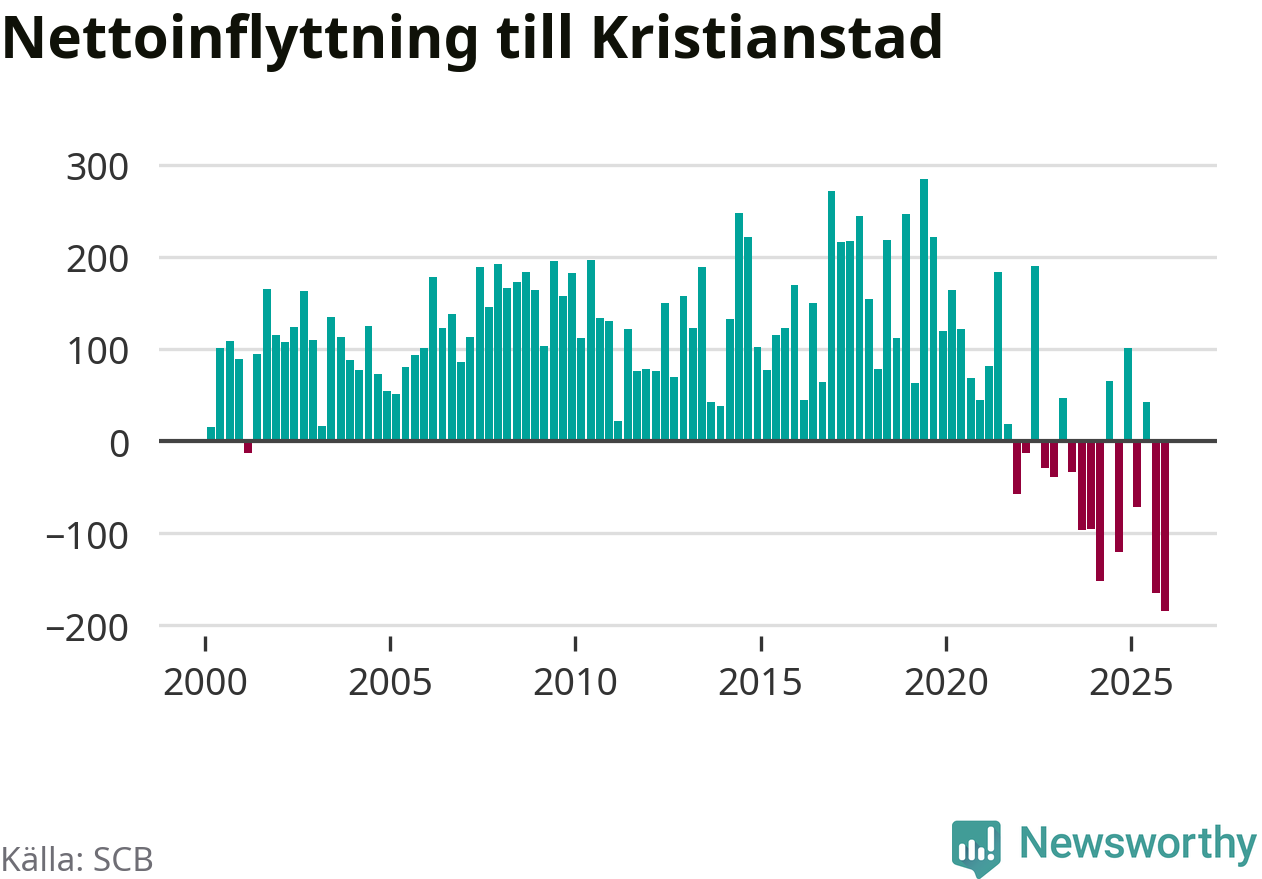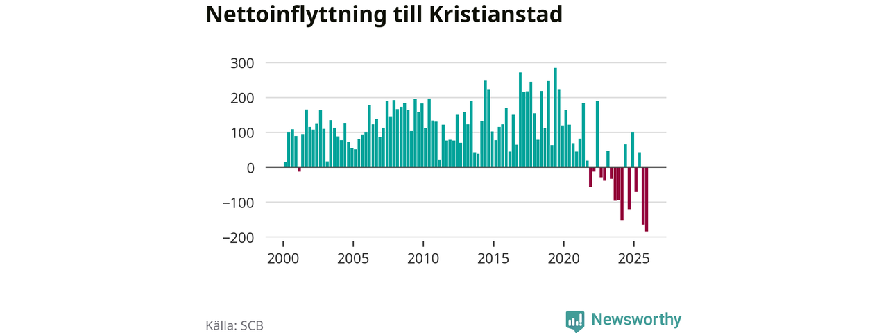 Under fjärde kvartalet 2025 flyttade 775 personer till kommunen medan 959 personer flyttade därifrån. Det ger den största nettoutflyttningen under ett kvartal sedan åtminstone år 2000. Sedan seklets början har Kristianstad oftast haft ett positivt flyttnetto.