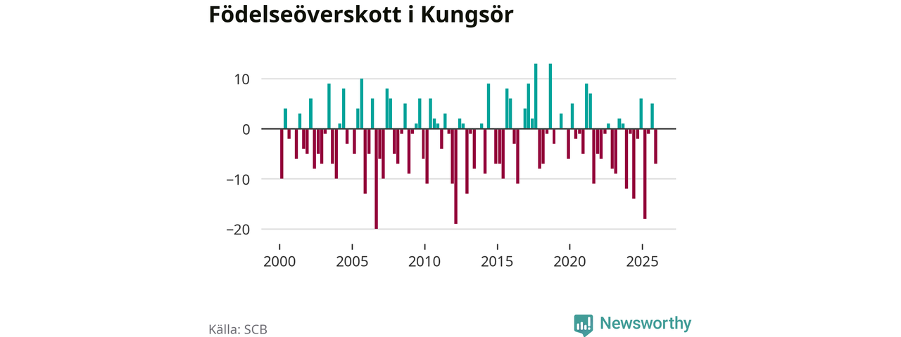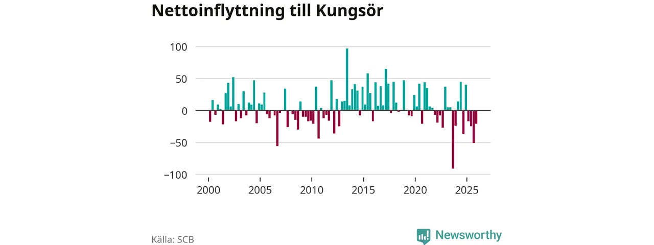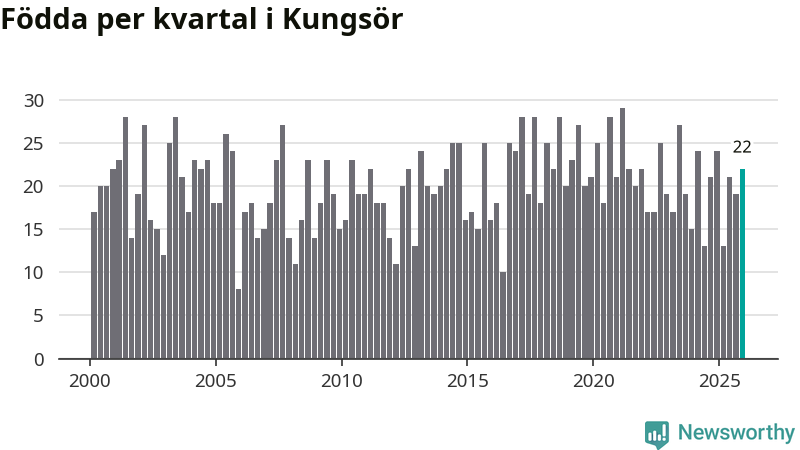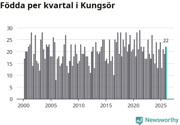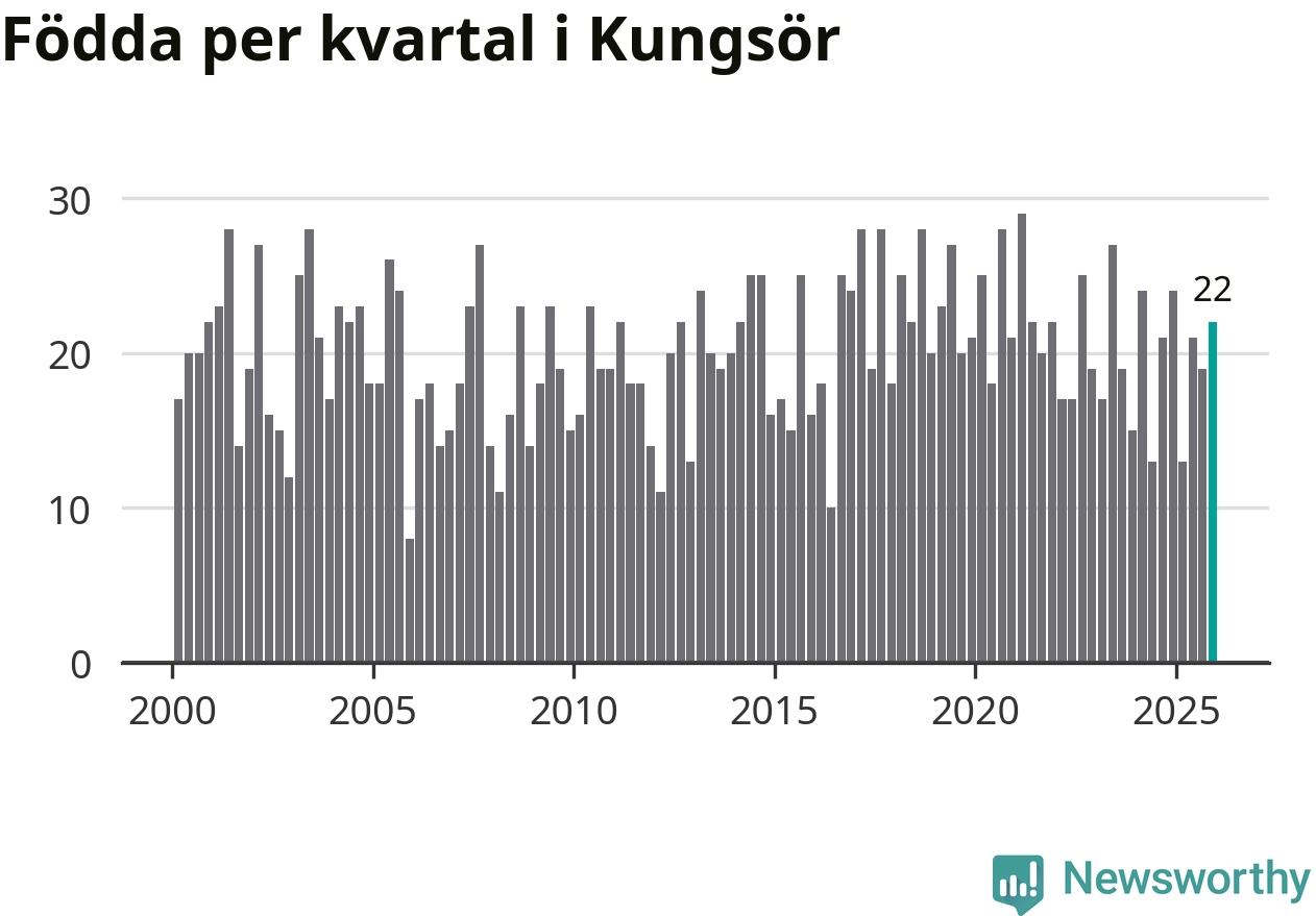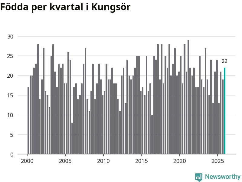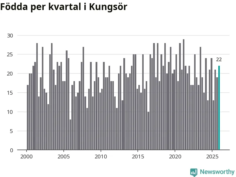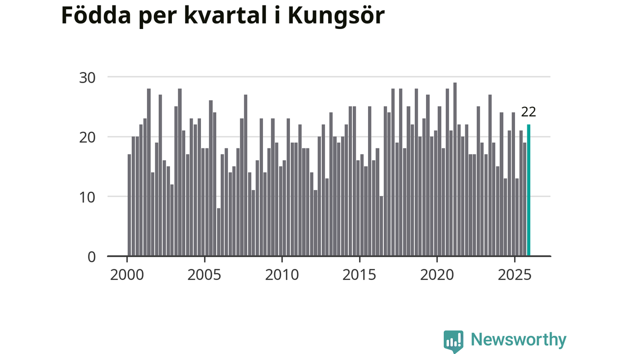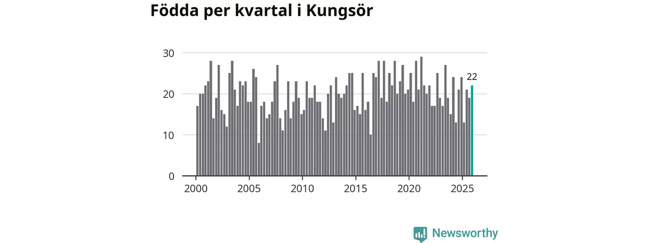 Enligt SCB:s siffror föddes 22 barn i Kungsör under det senaste kvartalet. Samtidigt avled relativt många – 29 personer. Kungsör hade alltså ett negativt födelsenetto. Historiskt sett har kommunen haft ungefär lika många kvartal med positivt flyttnetto som negativt.