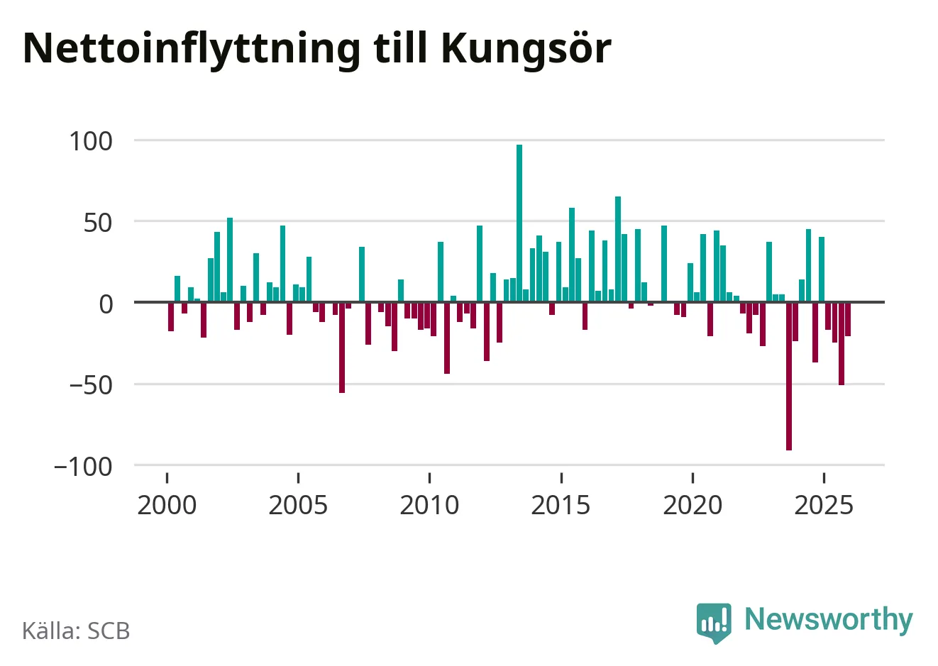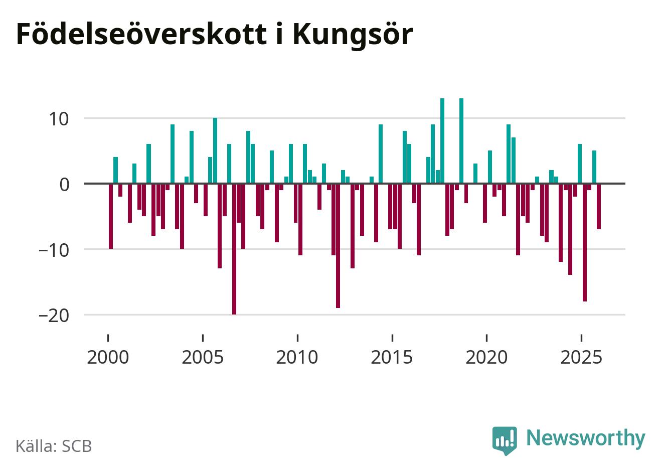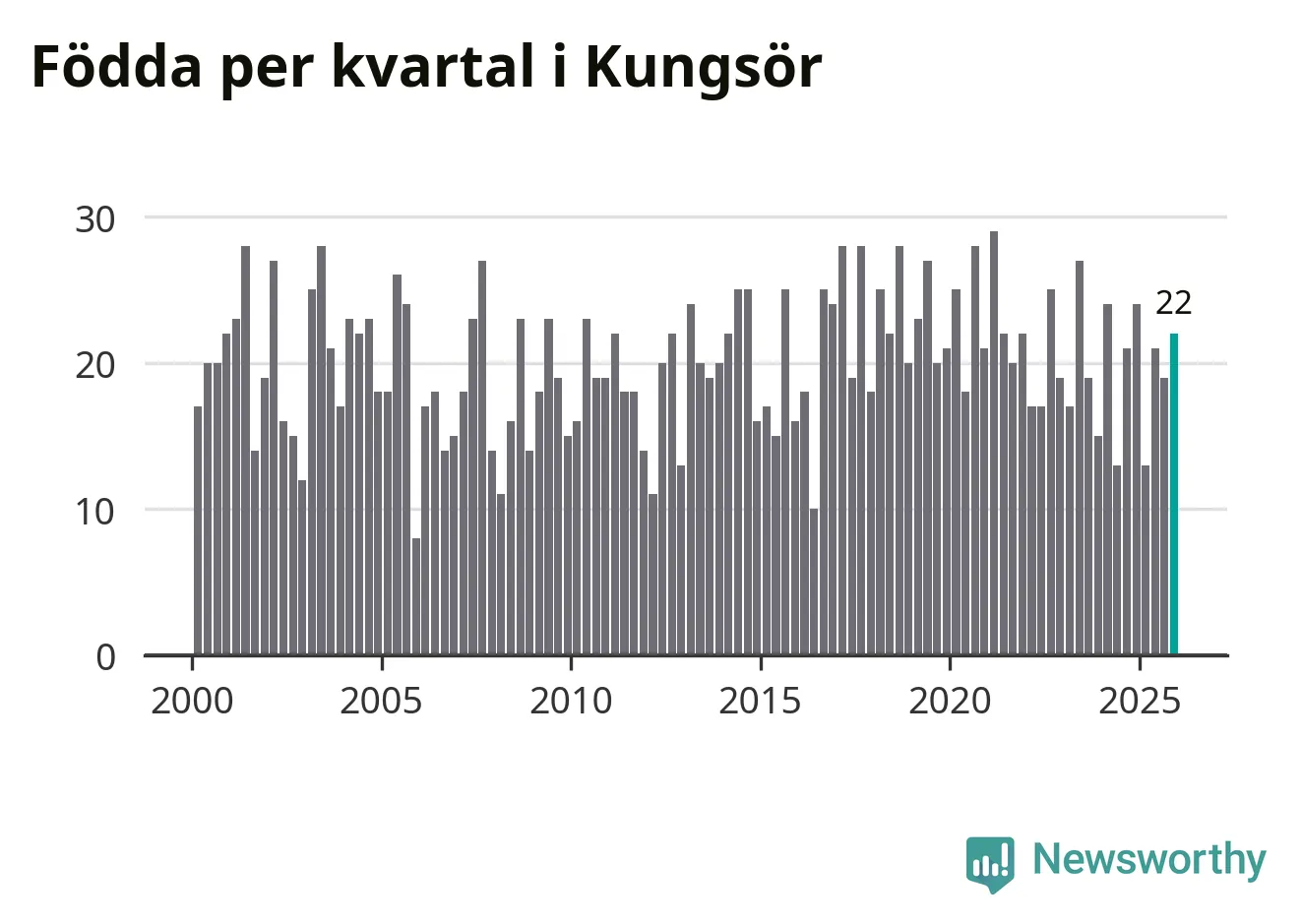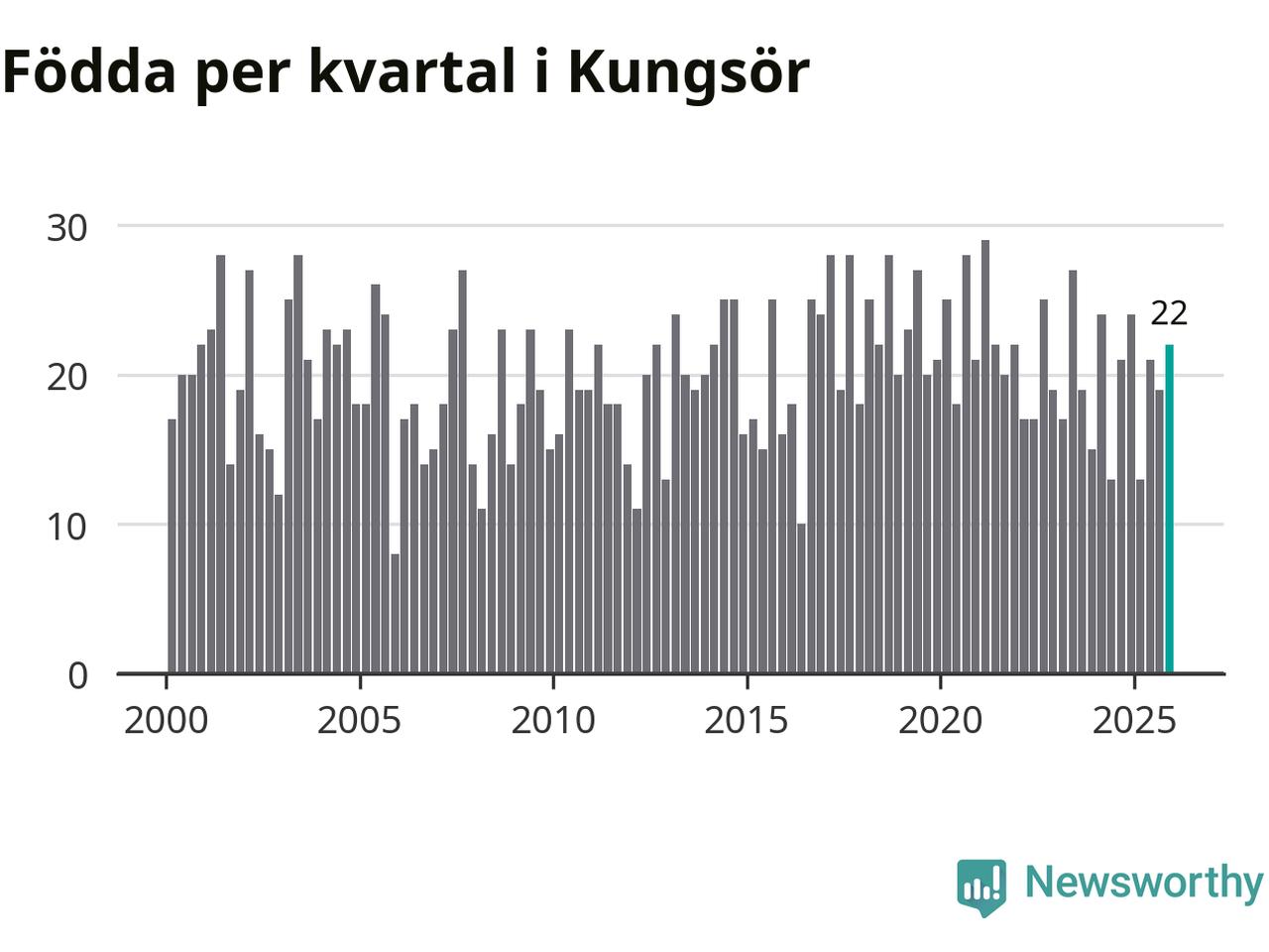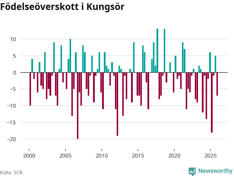 Enligt SCB:s siffror föddes 22 barn i Kungsör under det senaste kvartalet. Samtidigt avled relativt många – 29 personer. Kungsör hade alltså ett negativt födelsenetto. Historiskt sett har kommunen haft ungefär lika många kvartal med positivt flyttnetto som negativt.