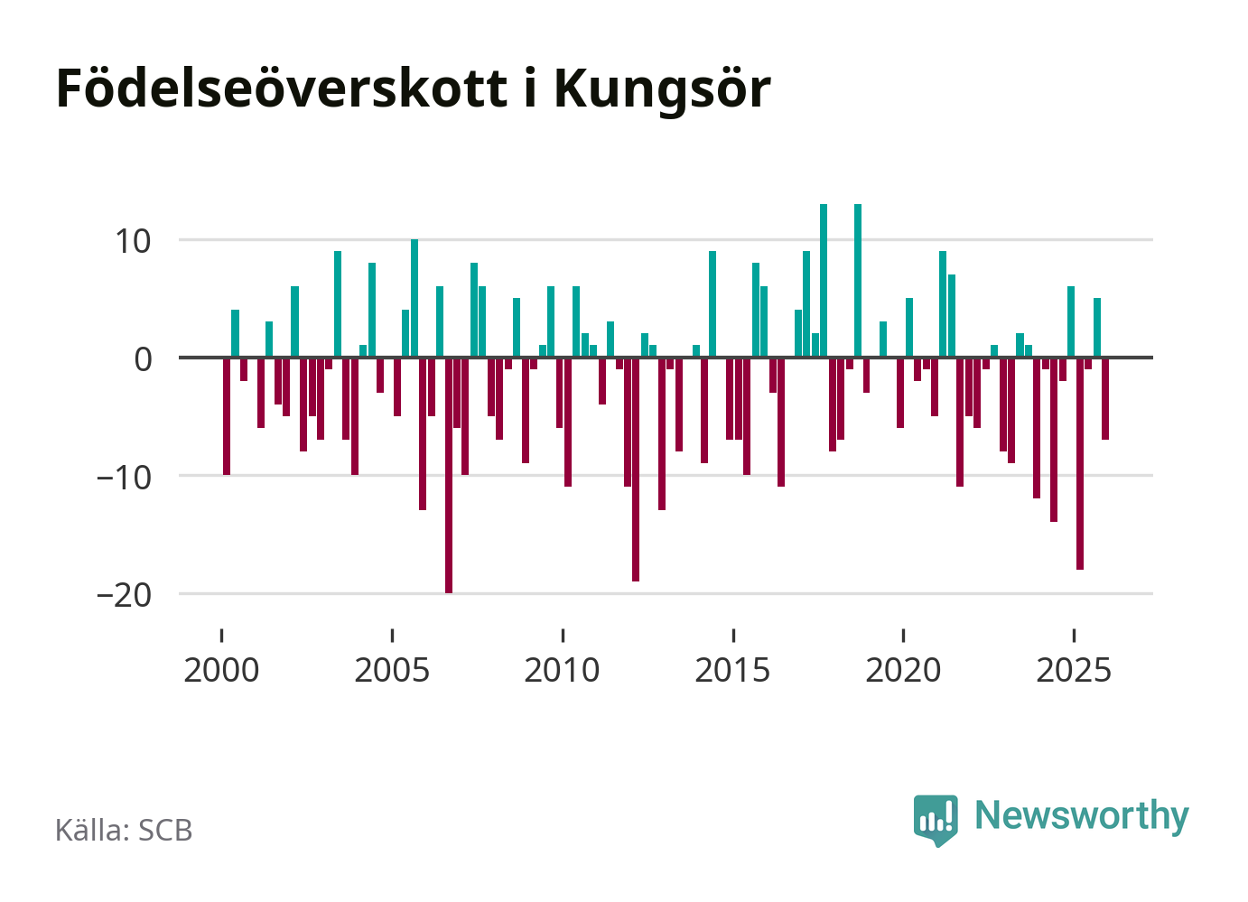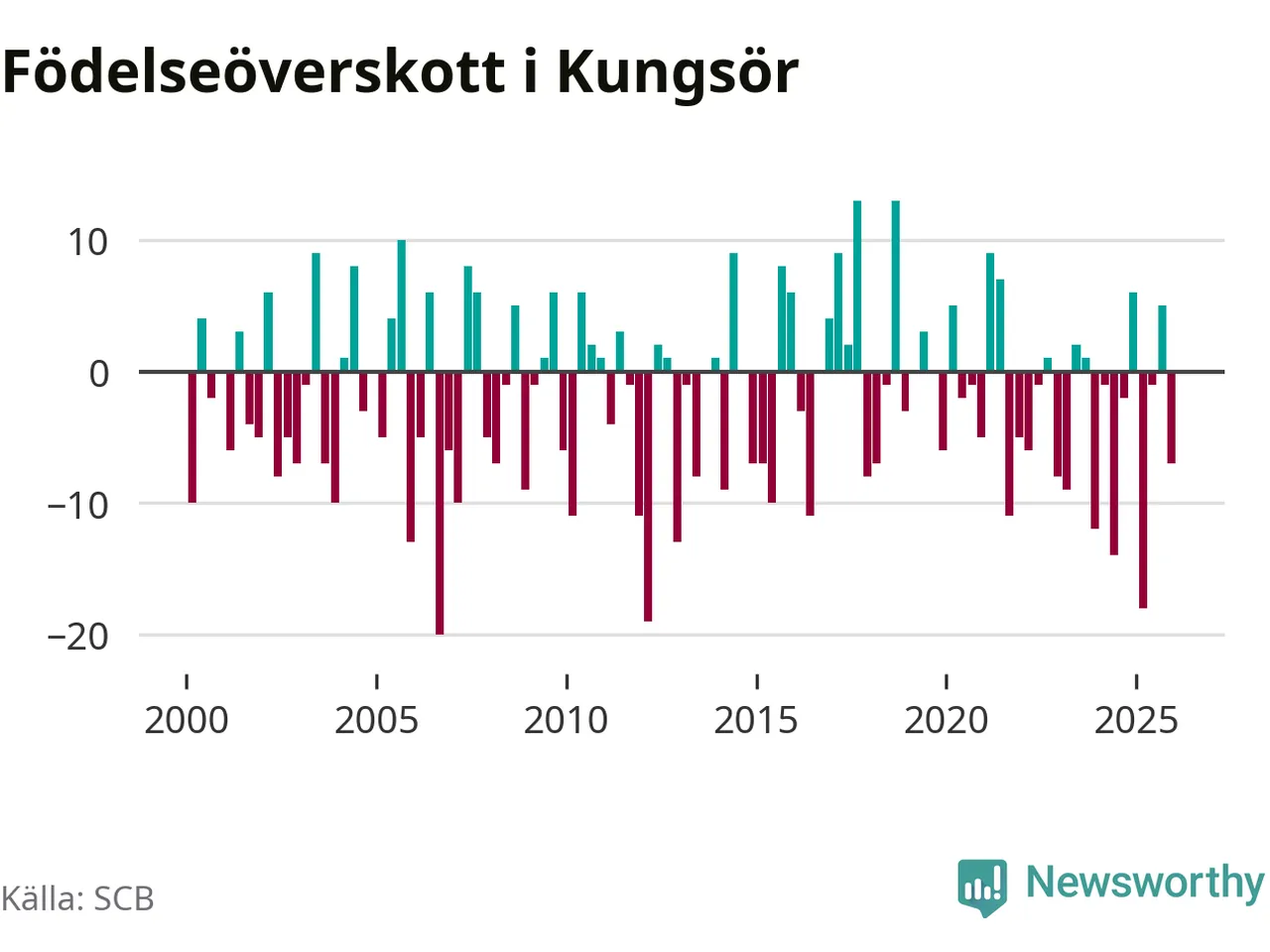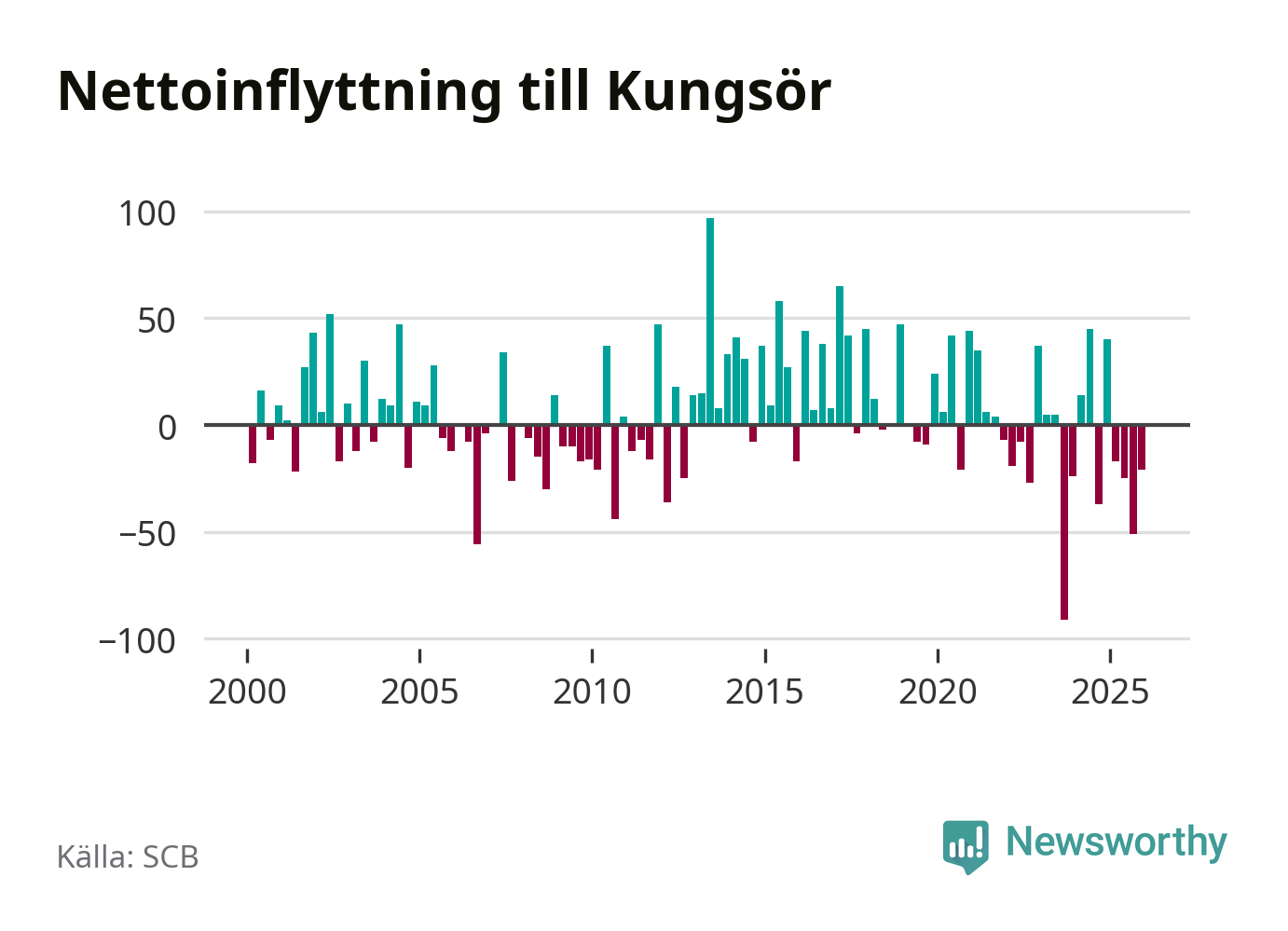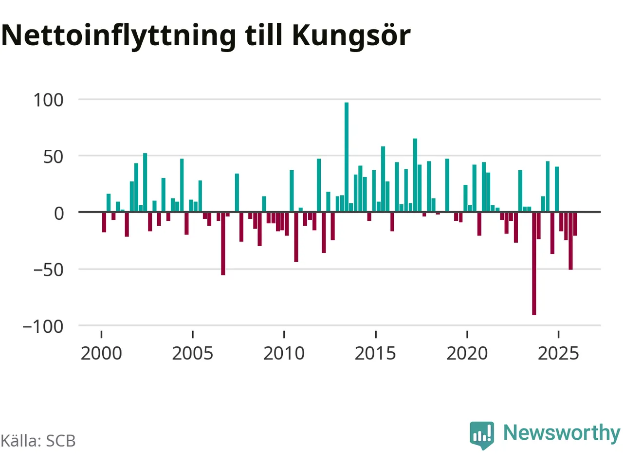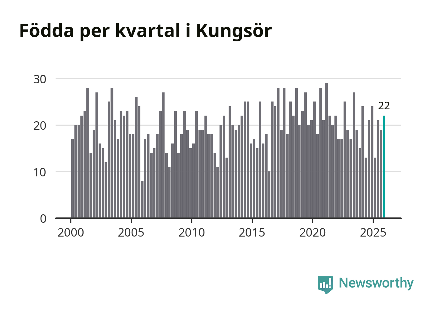 Enligt SCB:s siffror föddes 22 barn i Kungsör under det senaste kvartalet. Samtidigt avled relativt många – 29 personer. Kungsör hade alltså ett negativt födelsenetto. Historiskt sett har kommunen haft ungefär lika många kvartal med positivt flyttnetto som negativt.