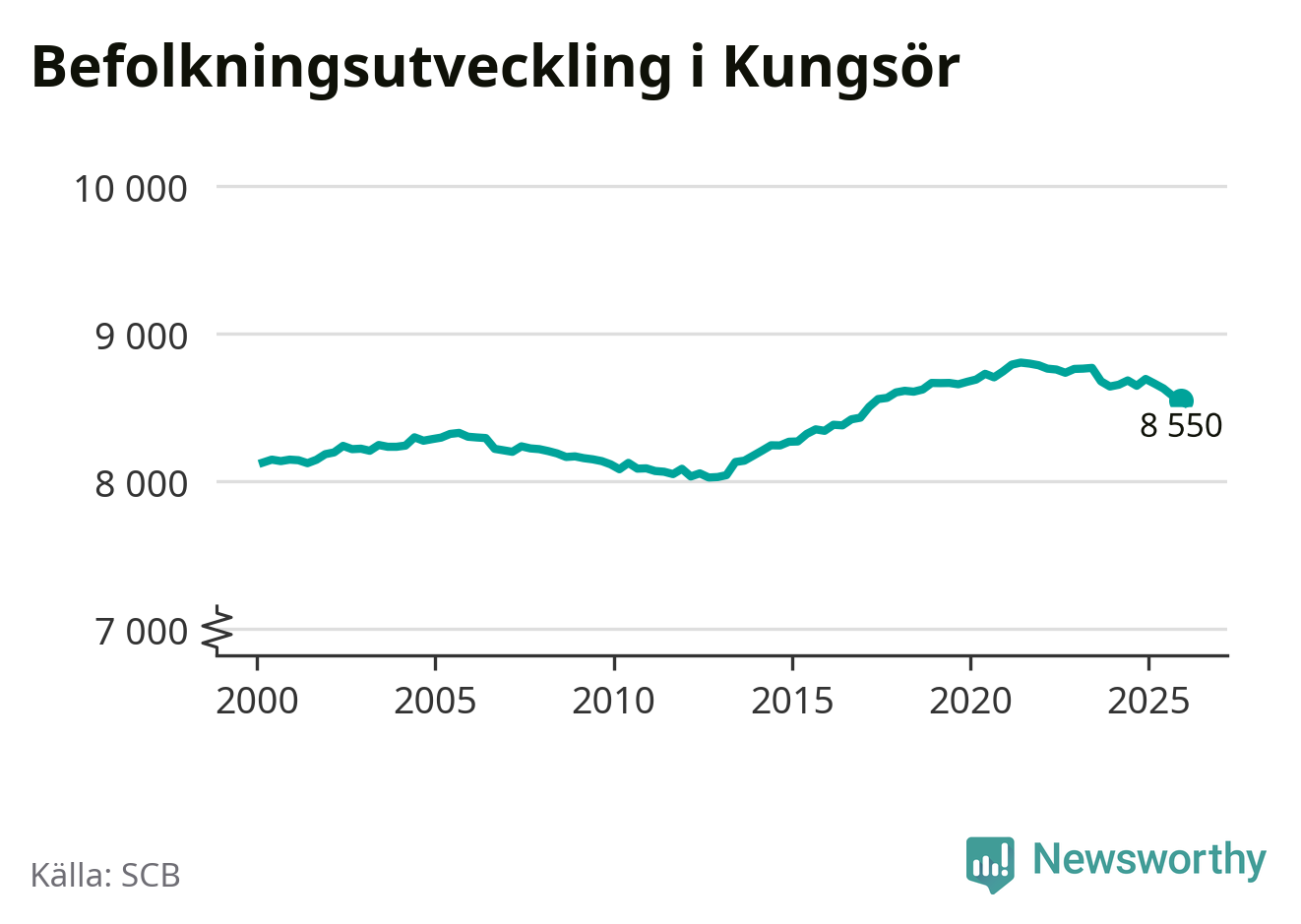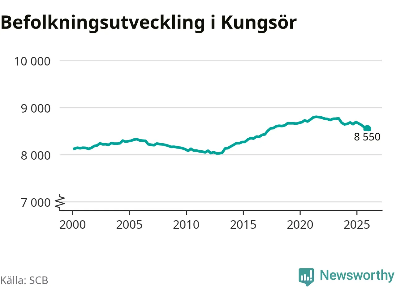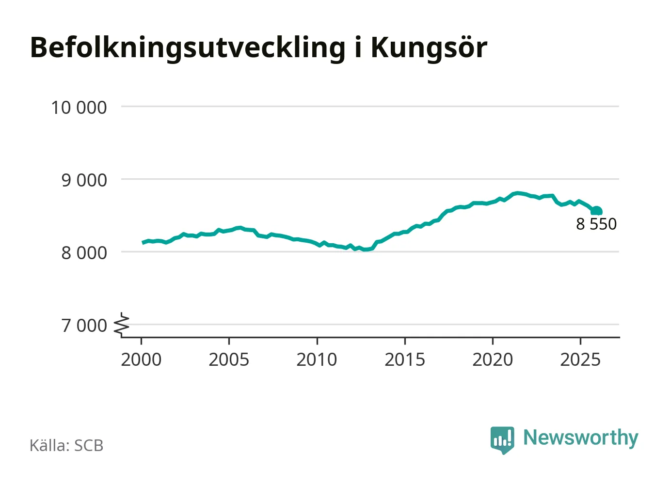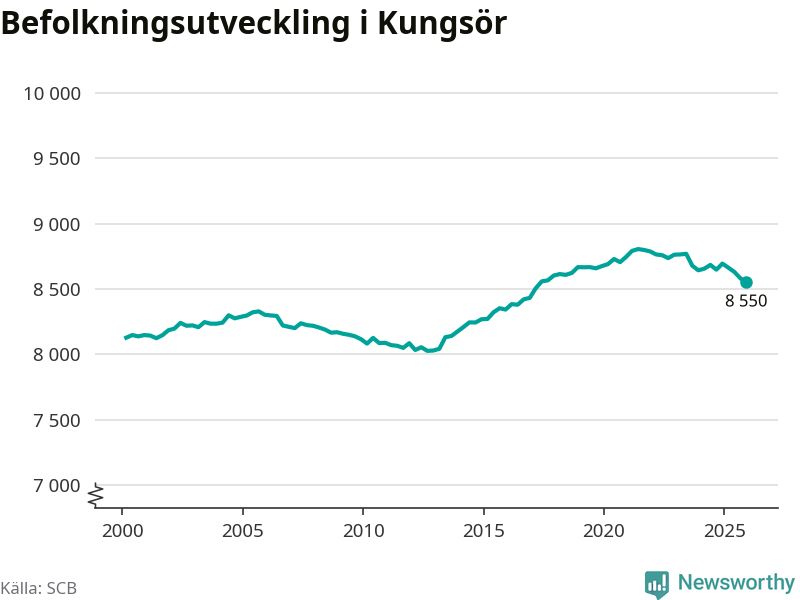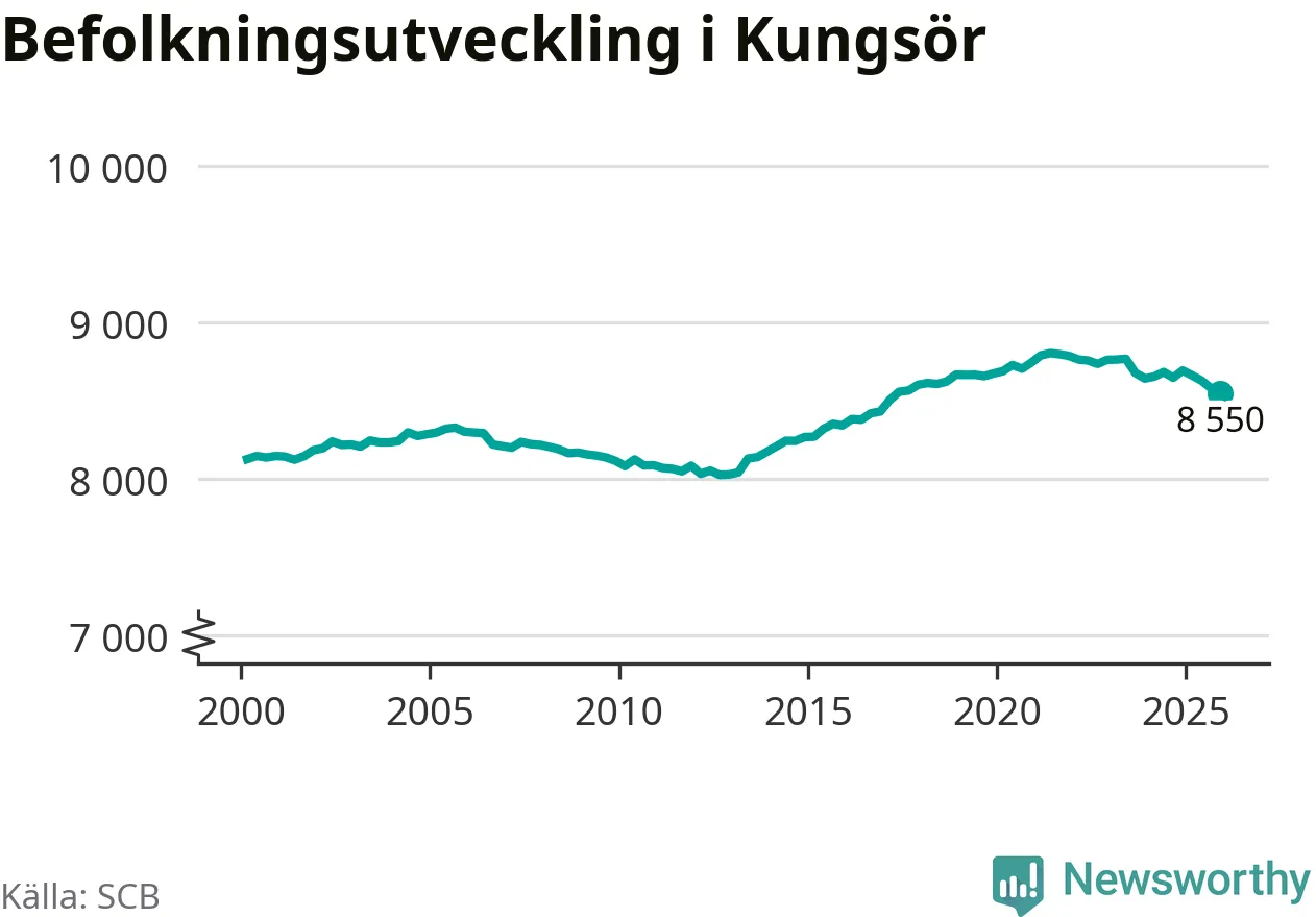 Jämfört med för ett år sedan har befolkningen i Kungsör minskat med drygt 140 personer – vilket motsvarar en nedgång på 1,7 procent. Sedan millennieskiftet har folkmängden ökat med runt 420 personer, eller fem procent.