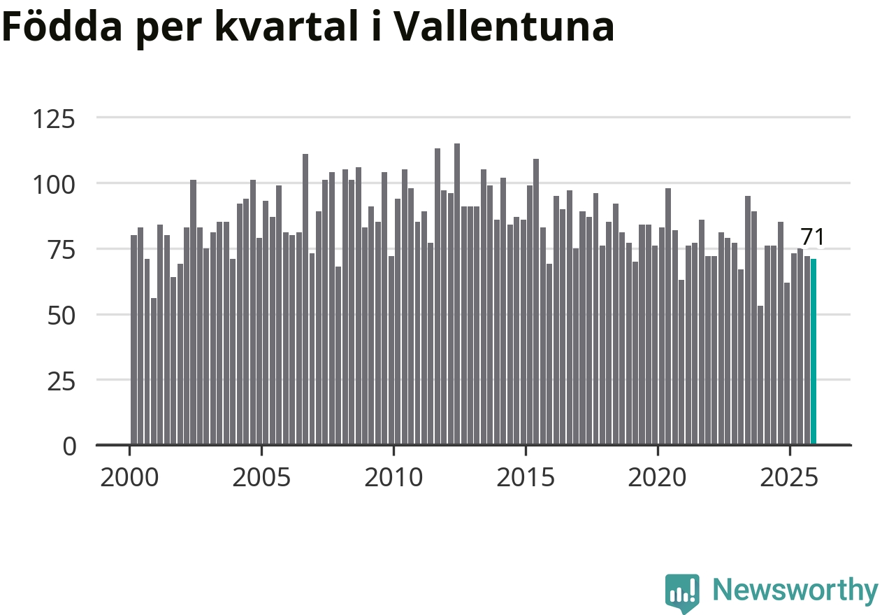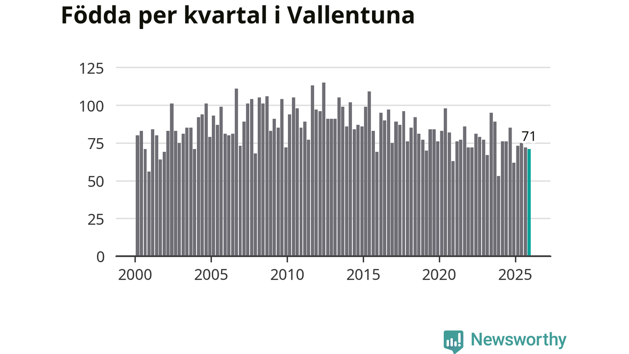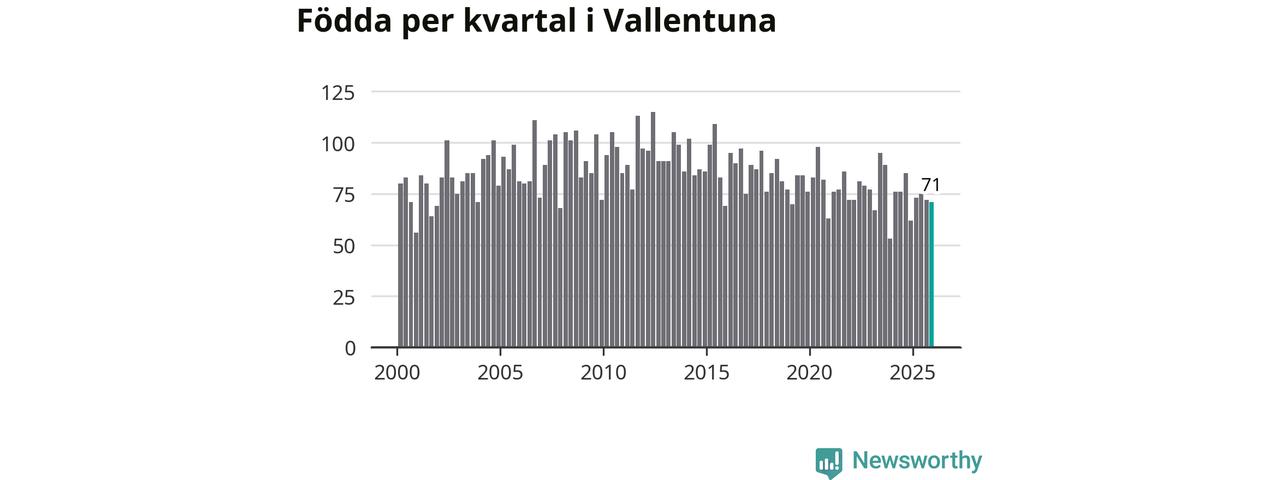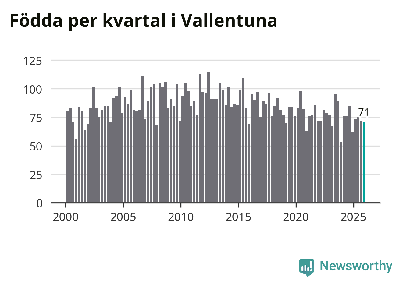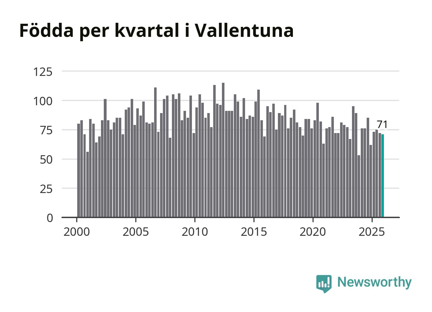 Enligt SCB:s siffror föddes 71 barn i Vallentuna under det senaste kvartalet. Samtidigt avled 59 personer. Vallentuna hade alltså ett positivt födelsenetto, vilket kommunen historiskt sett nästan alltid har haft.