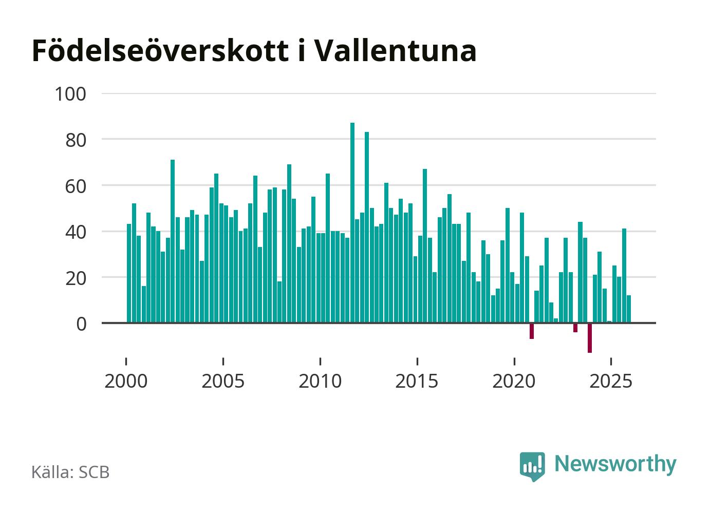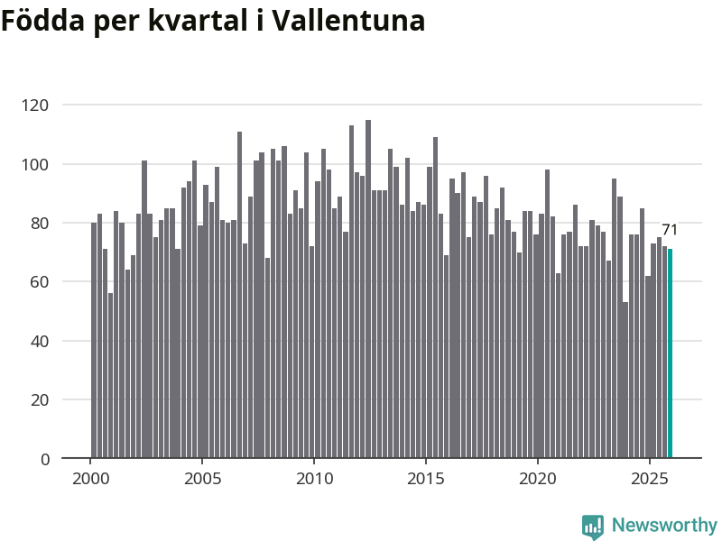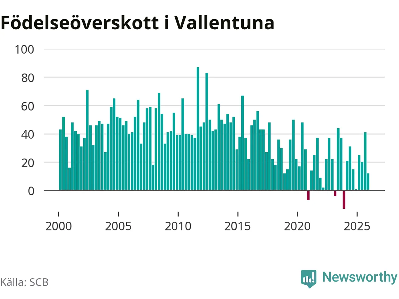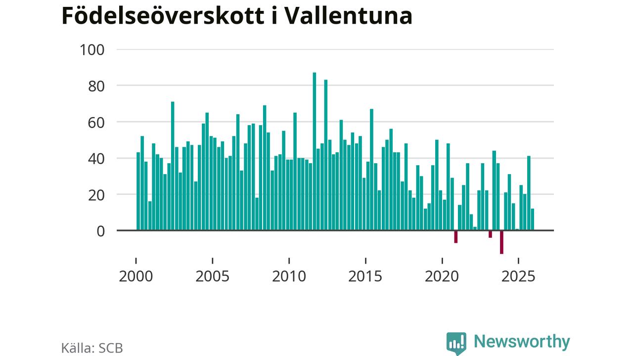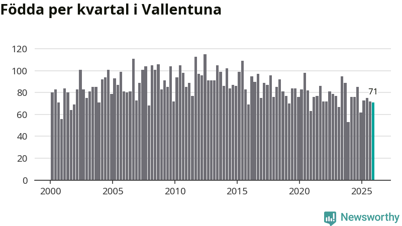 Enligt SCB:s siffror föddes 71 barn i Vallentuna under det senaste kvartalet. Samtidigt avled 59 personer. Vallentuna hade alltså ett positivt födelsenetto, vilket kommunen historiskt sett nästan alltid har haft.