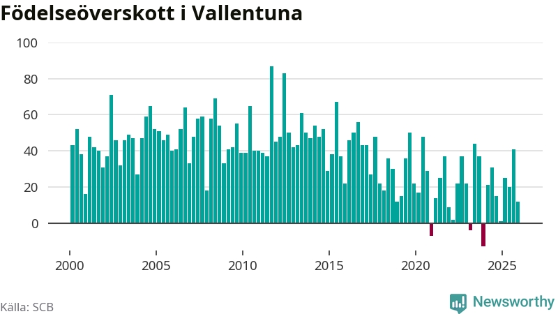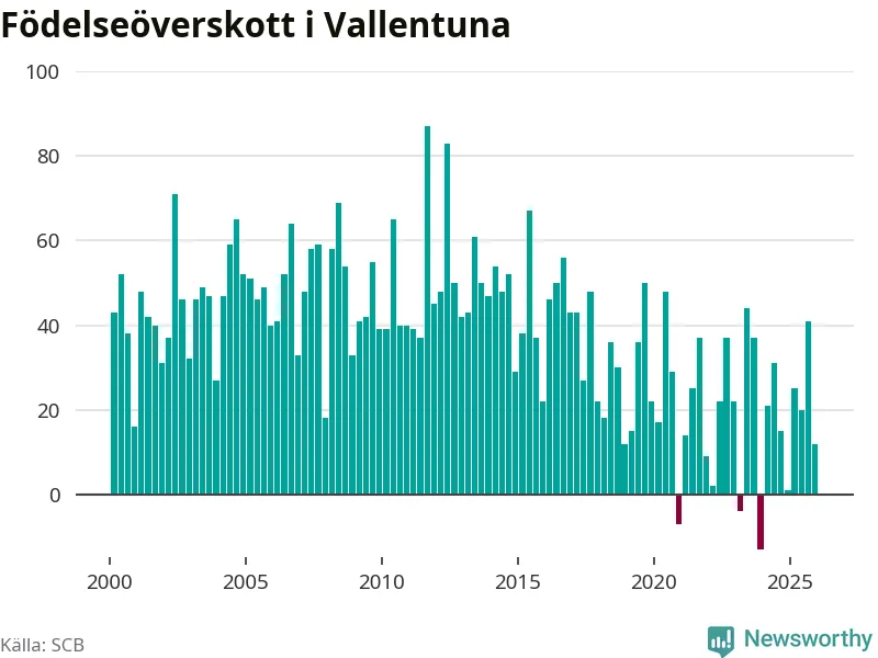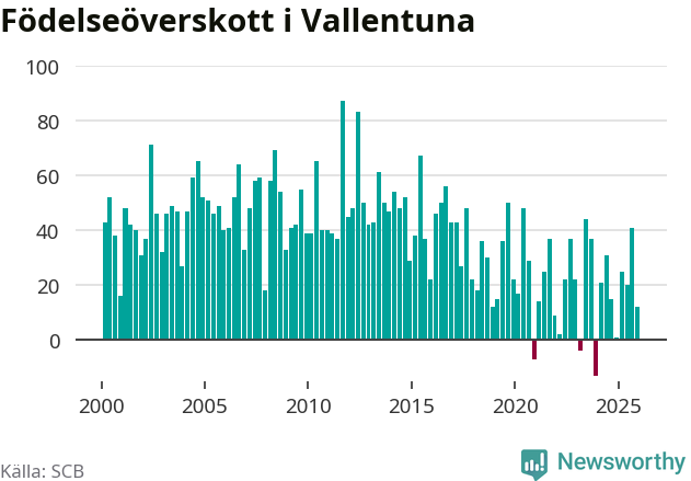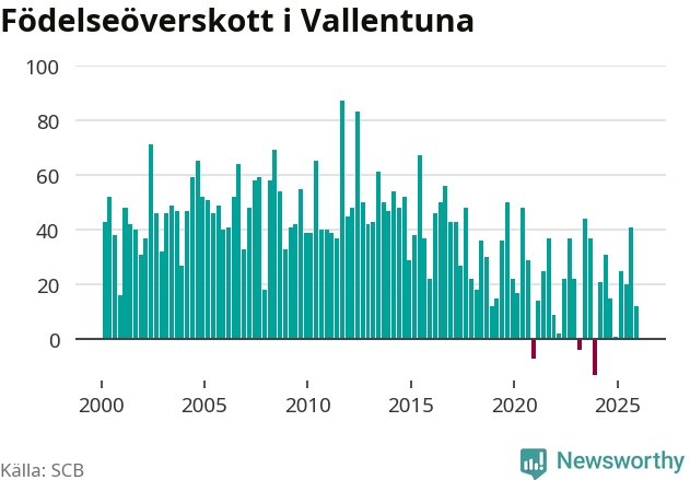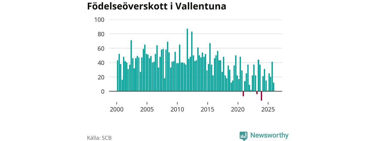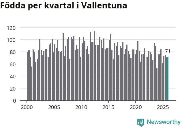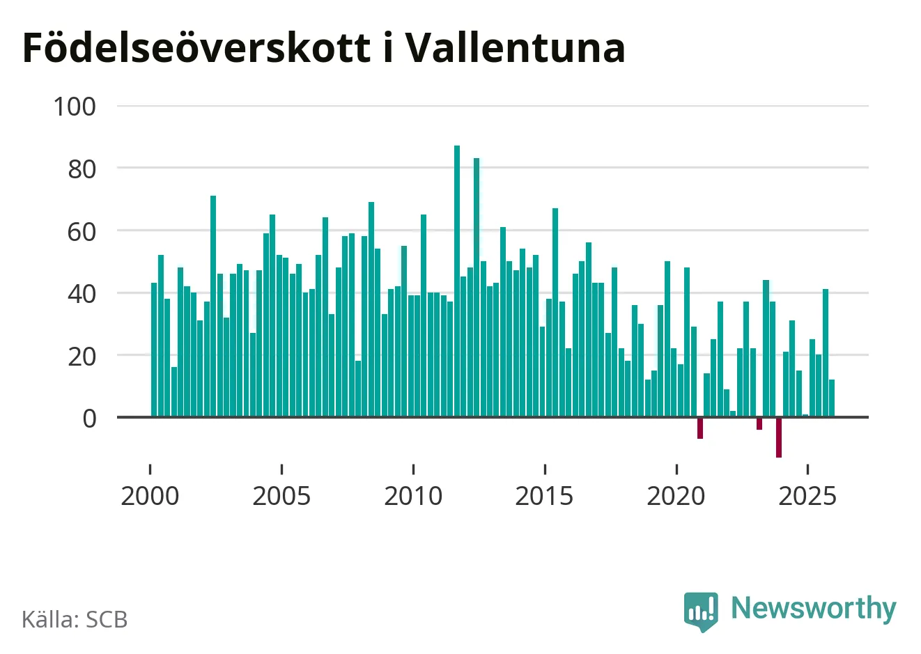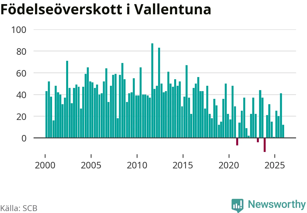 Enligt SCB:s siffror föddes 71 barn i Vallentuna under det senaste kvartalet. Samtidigt avled 59 personer. Vallentuna hade alltså ett positivt födelsenetto, vilket kommunen historiskt sett nästan alltid har haft.