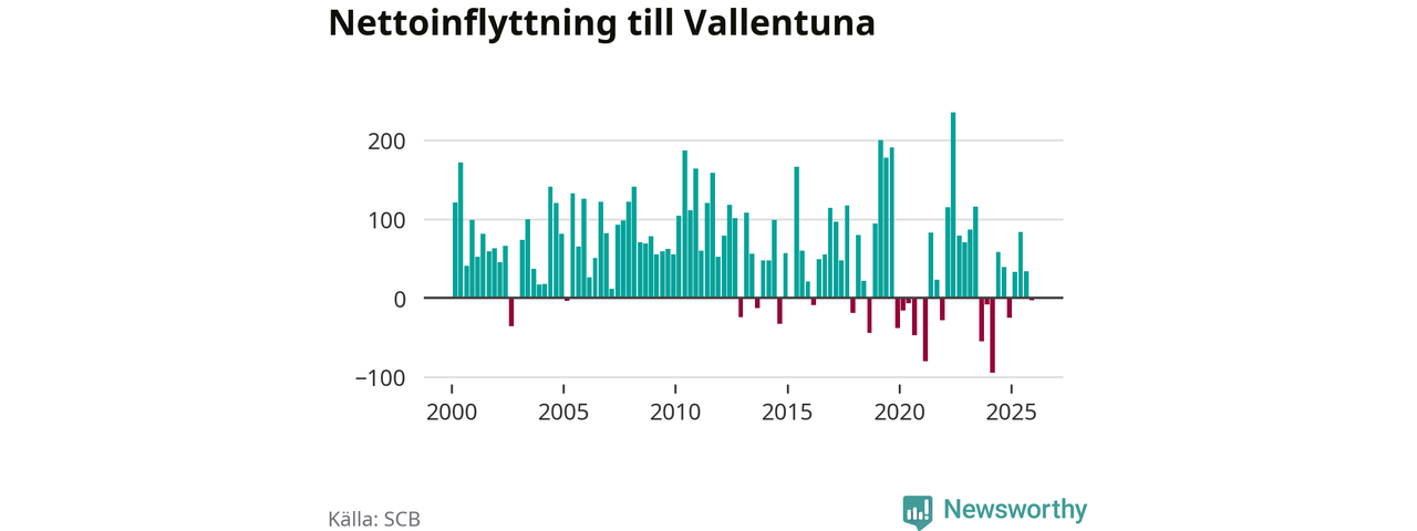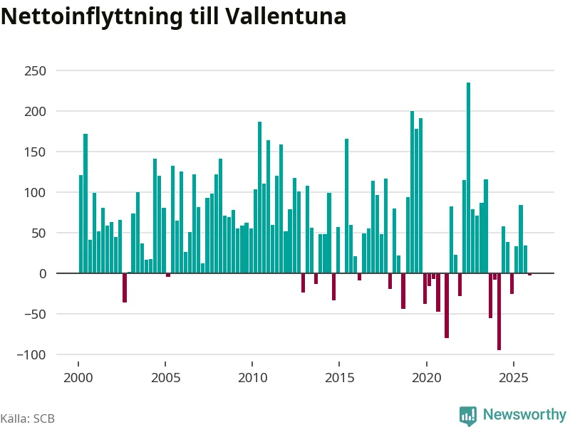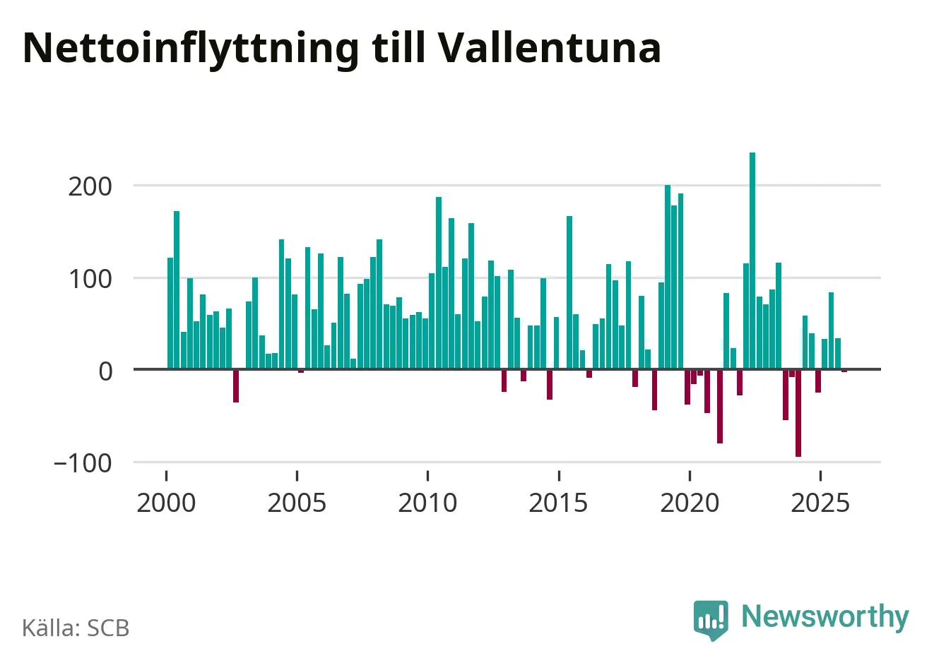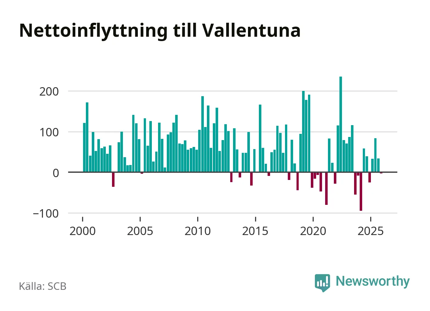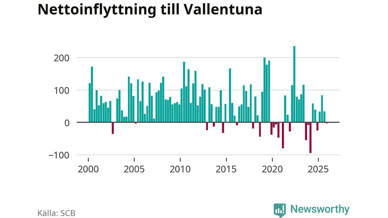 Under fjärde kvartalet 2025 flyttade 546 personer till kommunen medan 549 personer flyttade därifrån. Skillnaden mellan antalet in- och utflyttade är så liten att den lika gärna kan bero på SCB:s slumpmässiga brus. Sedan seklets början har Vallentuna oftast haft ett positivt flyttnetto.