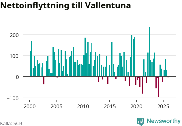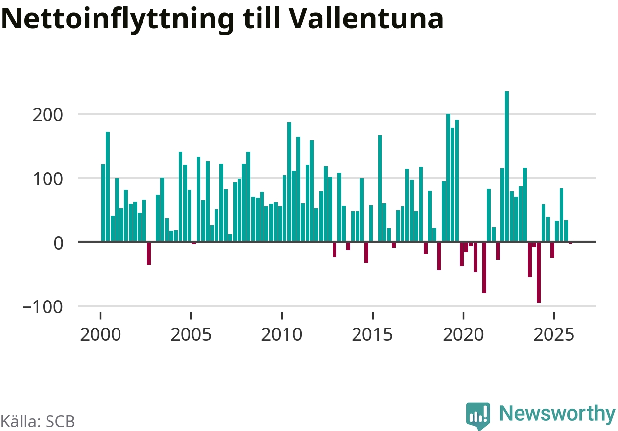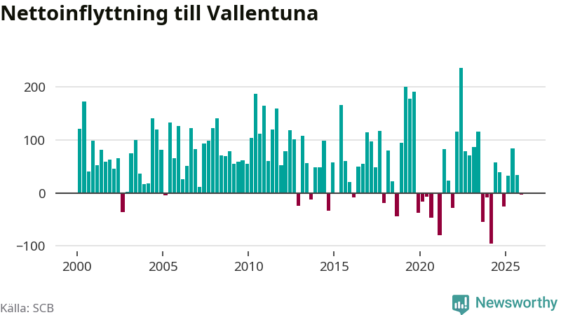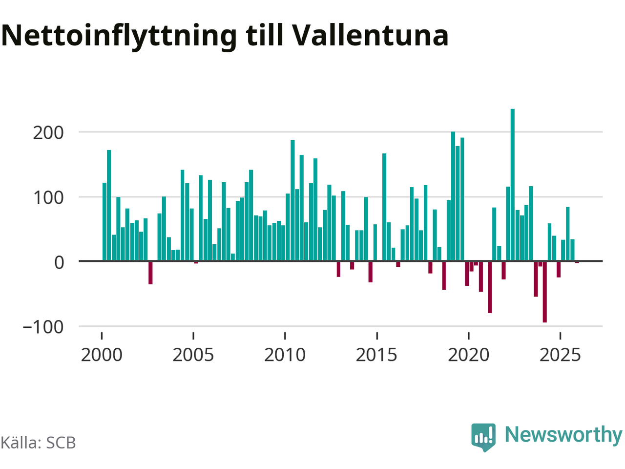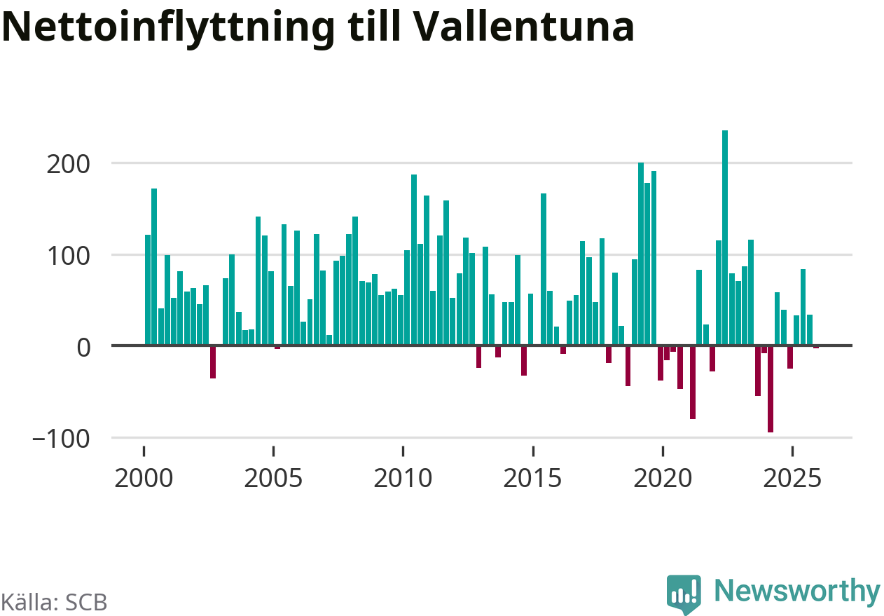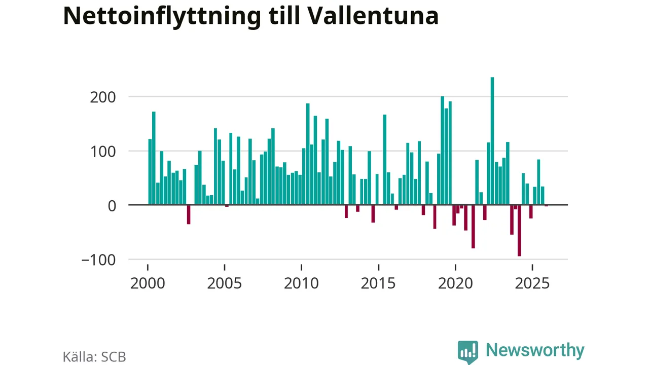 Under fjärde kvartalet 2025 flyttade 546 personer till kommunen medan 549 personer flyttade därifrån. Skillnaden mellan antalet in- och utflyttade är så liten att den lika gärna kan bero på SCB:s slumpmässiga brus. Sedan seklets början har Vallentuna oftast haft ett positivt flyttnetto.