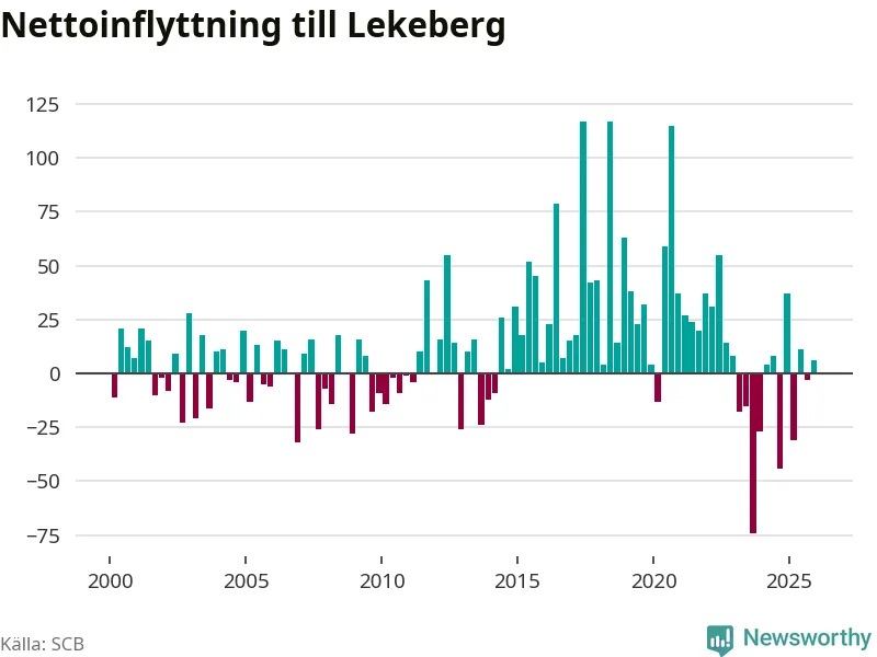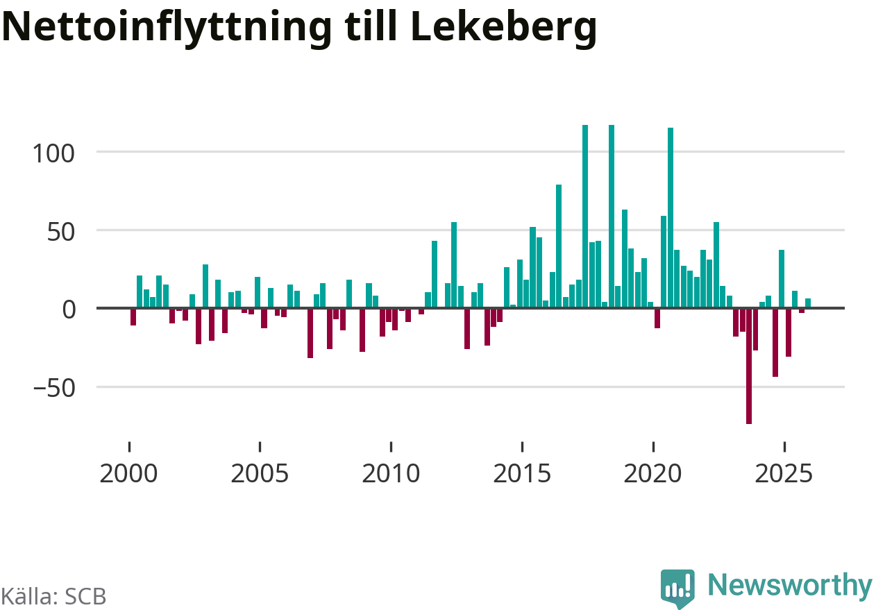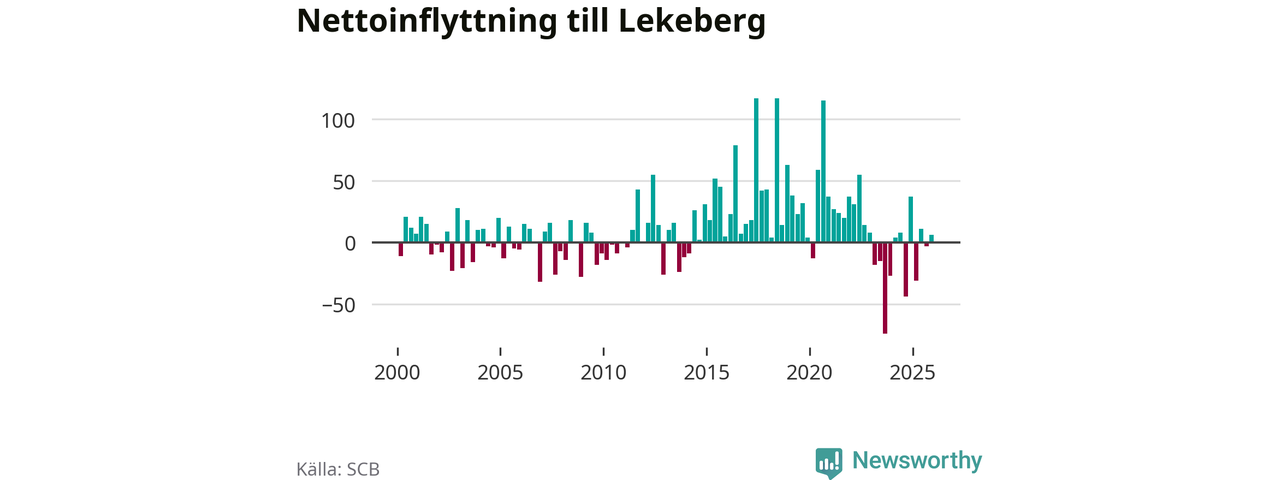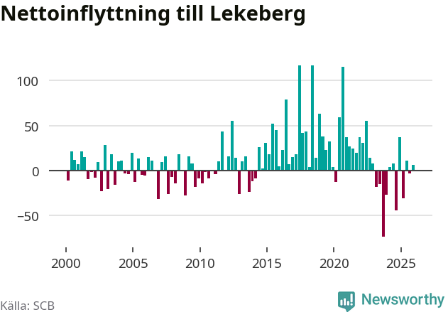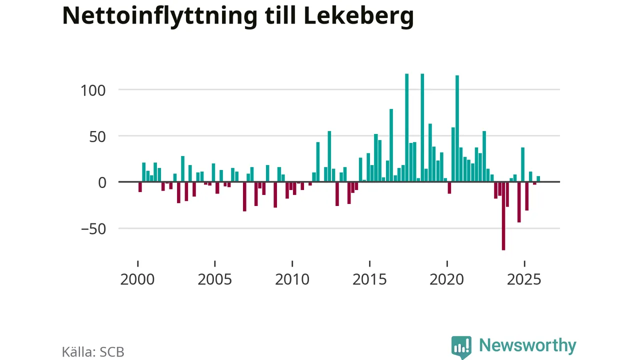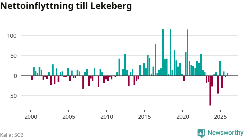 Under fjärde kvartalet 2025 flyttade 108 personer till kommunen medan 102 personer flyttade därifrån. Skillnaden mellan antalet in- och utflyttade är så liten att den lika gärna kan bero på SCB:s slumpmässiga brus. Sedan seklets början har Lekeberg oftast haft ett positivt flyttnetto.