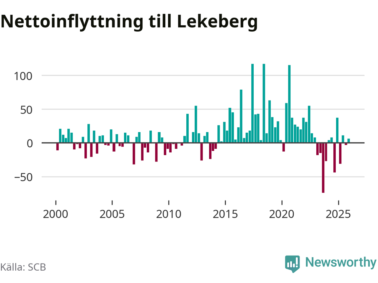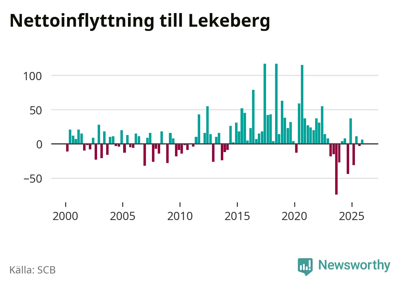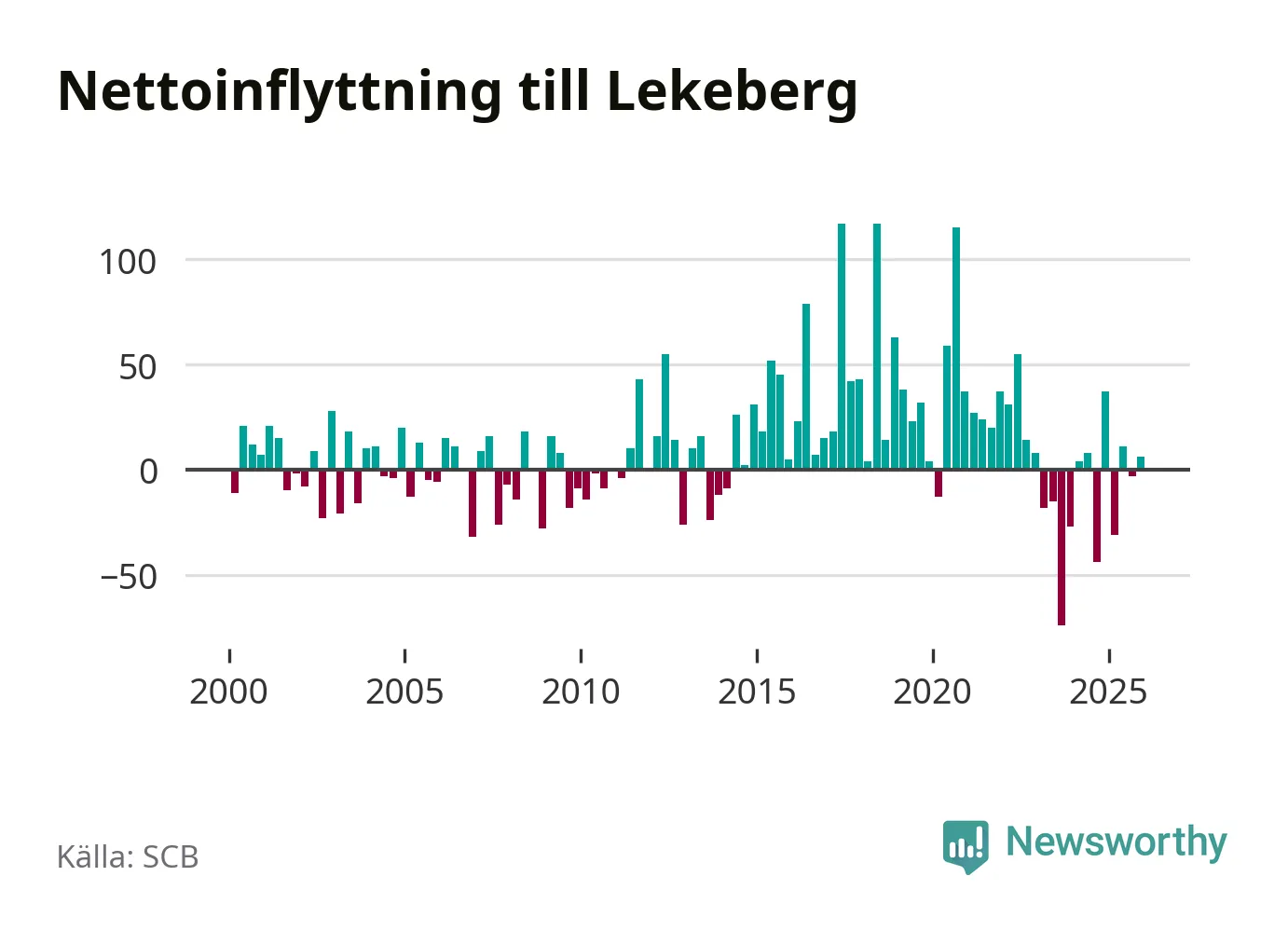 Under fjärde kvartalet 2025 flyttade 108 personer till kommunen medan 102 personer flyttade därifrån. Skillnaden mellan antalet in- och utflyttade är så liten att den lika gärna kan bero på SCB:s slumpmässiga brus. Sedan seklets början har Lekeberg oftast haft ett positivt flyttnetto.