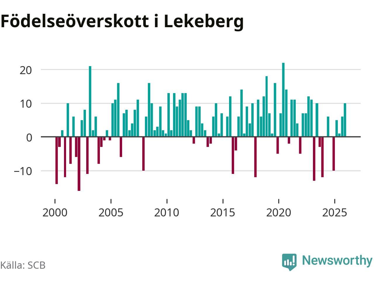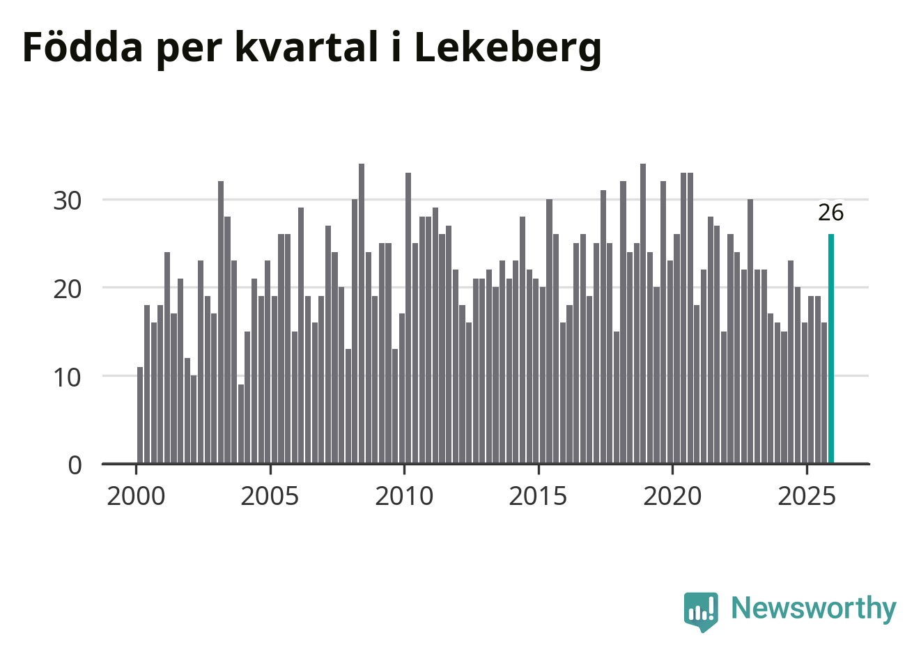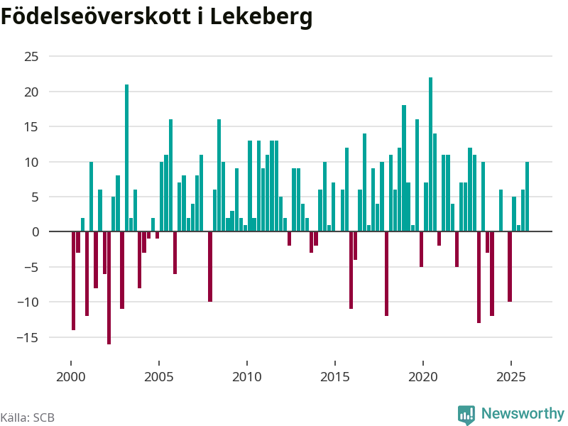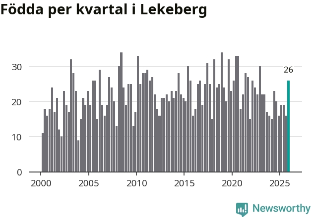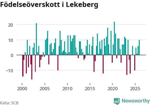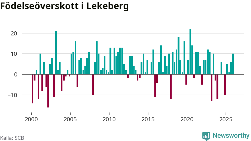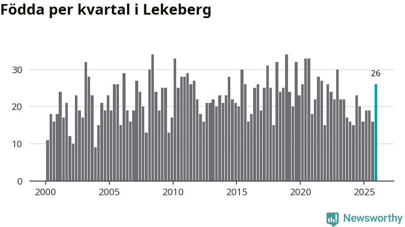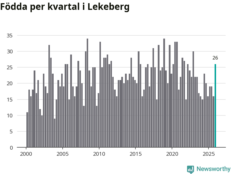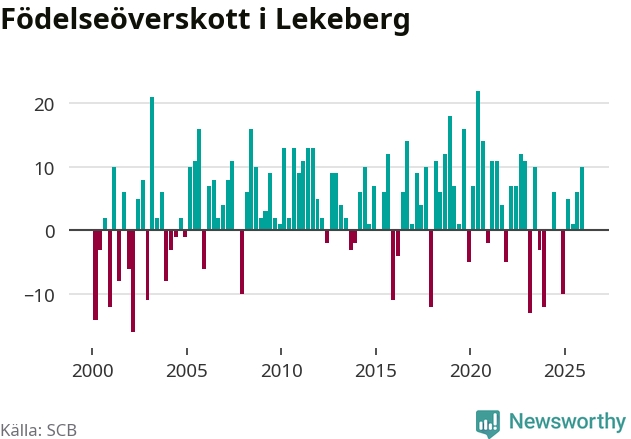 Enligt SCB:s siffror föddes 26 barn i Lekeberg under det senaste kvartalet. Samtidigt avled 16 personer. Lekeberg hade alltså ett positivt födelsenetto, vilket kommunen historiskt sett oftast har haft.