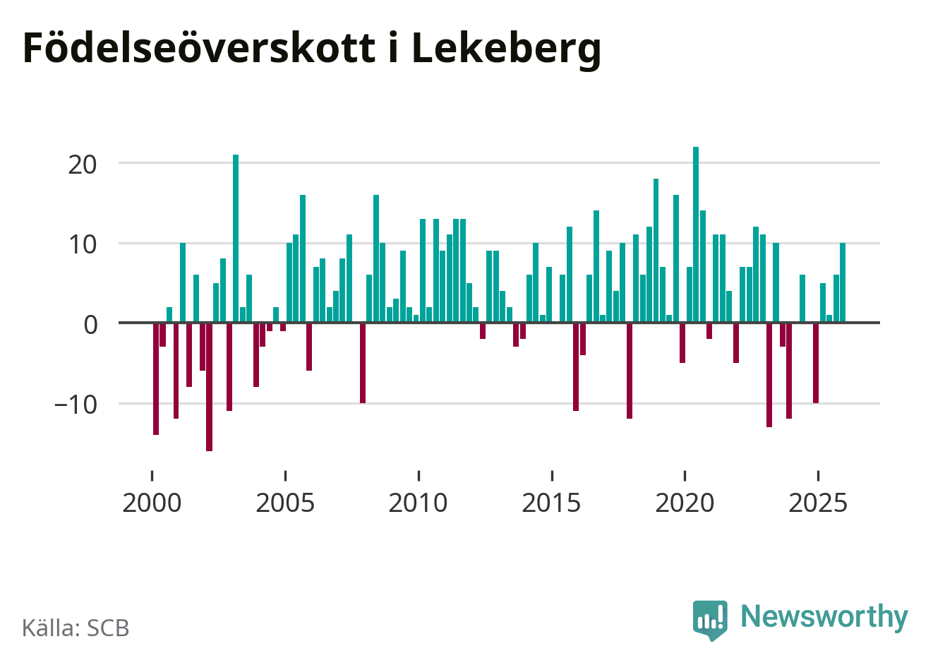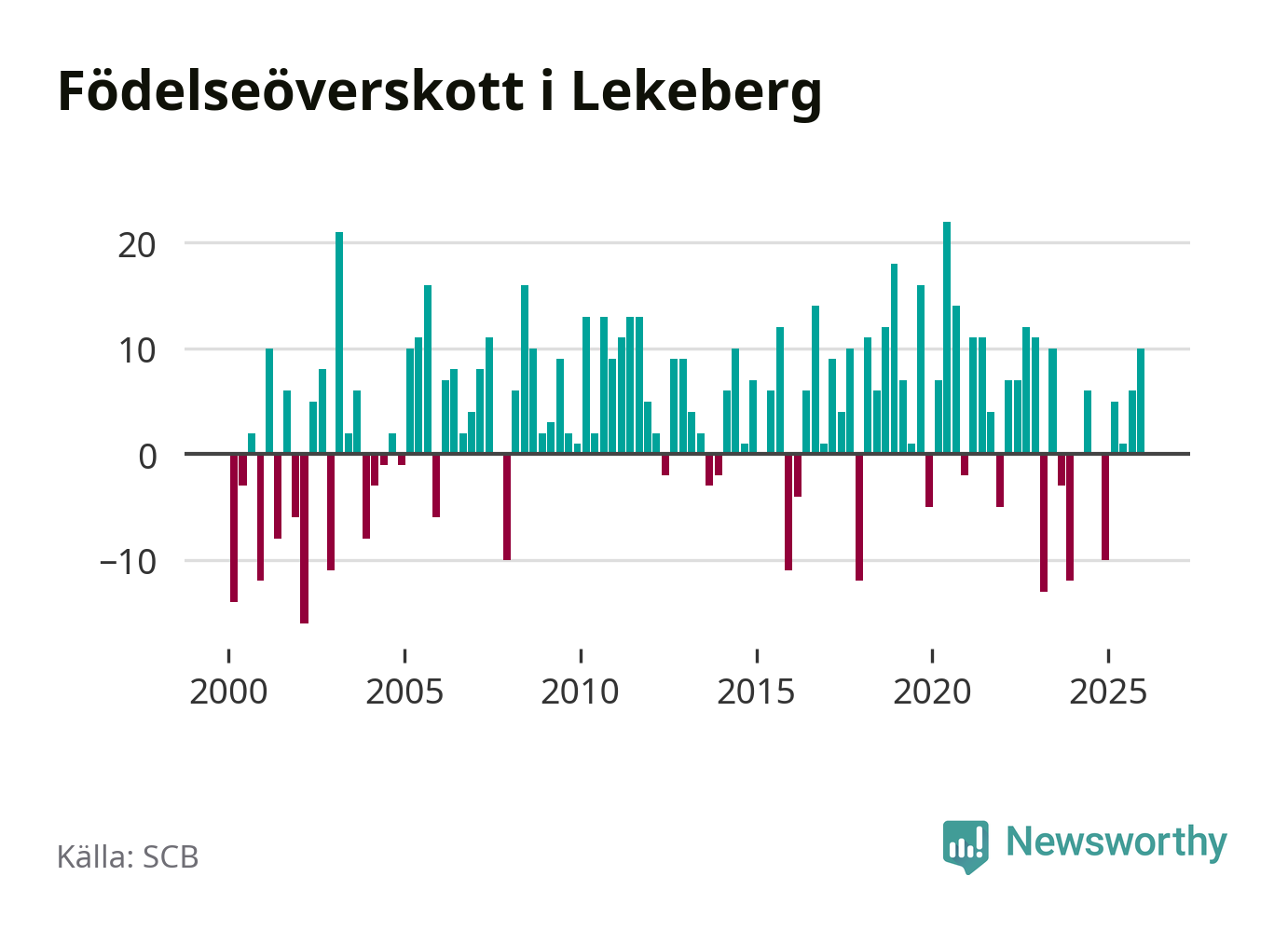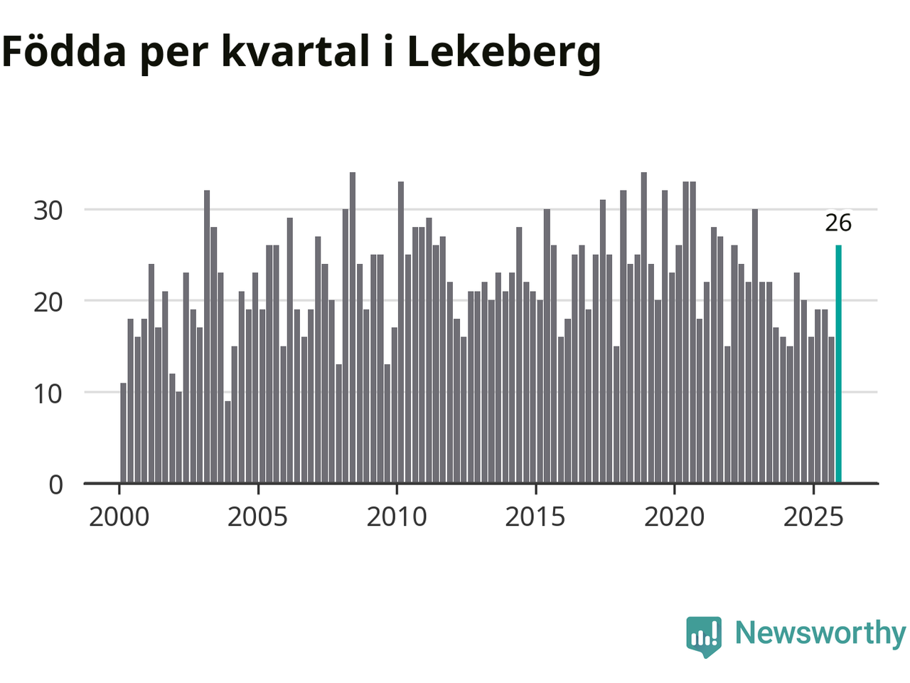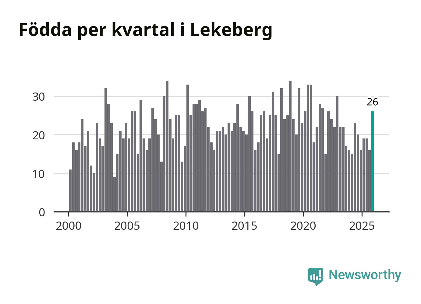 Enligt SCB:s siffror föddes 26 barn i Lekeberg under det senaste kvartalet. Samtidigt avled 16 personer. Lekeberg hade alltså ett positivt födelsenetto, vilket kommunen historiskt sett oftast har haft.